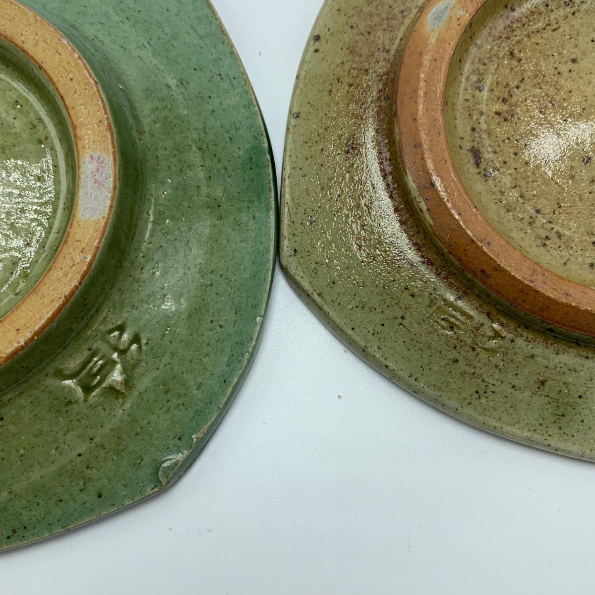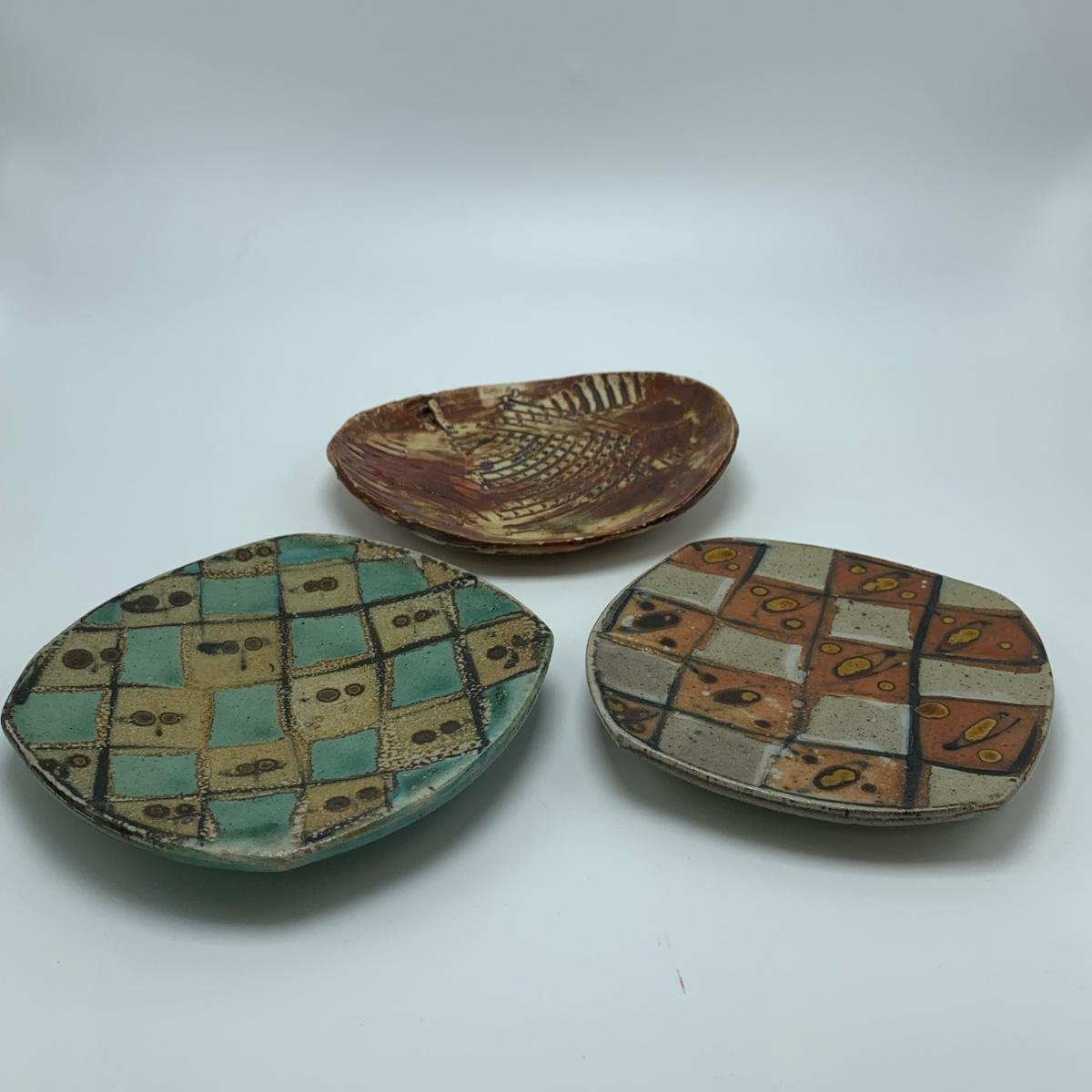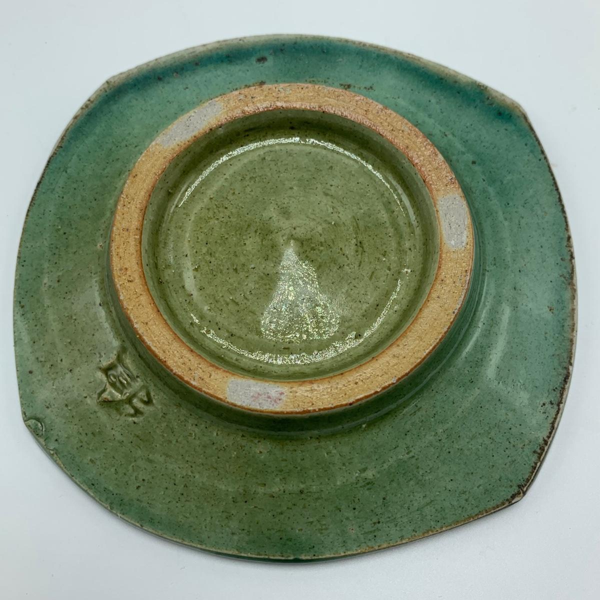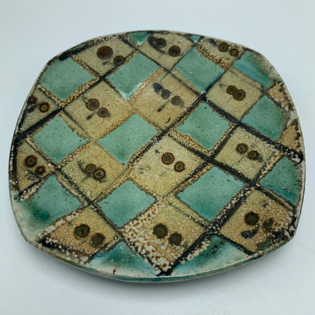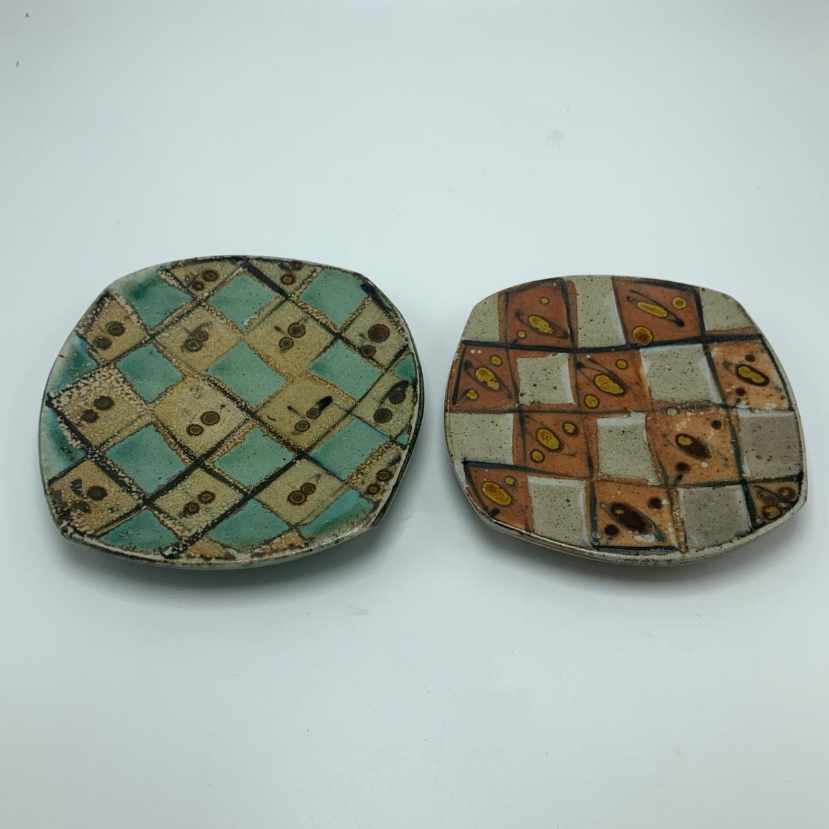 There are three small ceramic plates in this lot. Two have a checkered pattern. The other has a textured feel. The green checkered plate measures 5.75” x 5.75” and the red checkered plate is just slightly smaller. These appear to have the same stamp markings on the bottom. The textured plate is an 6.5” x 5.75” oval with slightly raised edges. All appear to be excellent condition. Shipping Available.