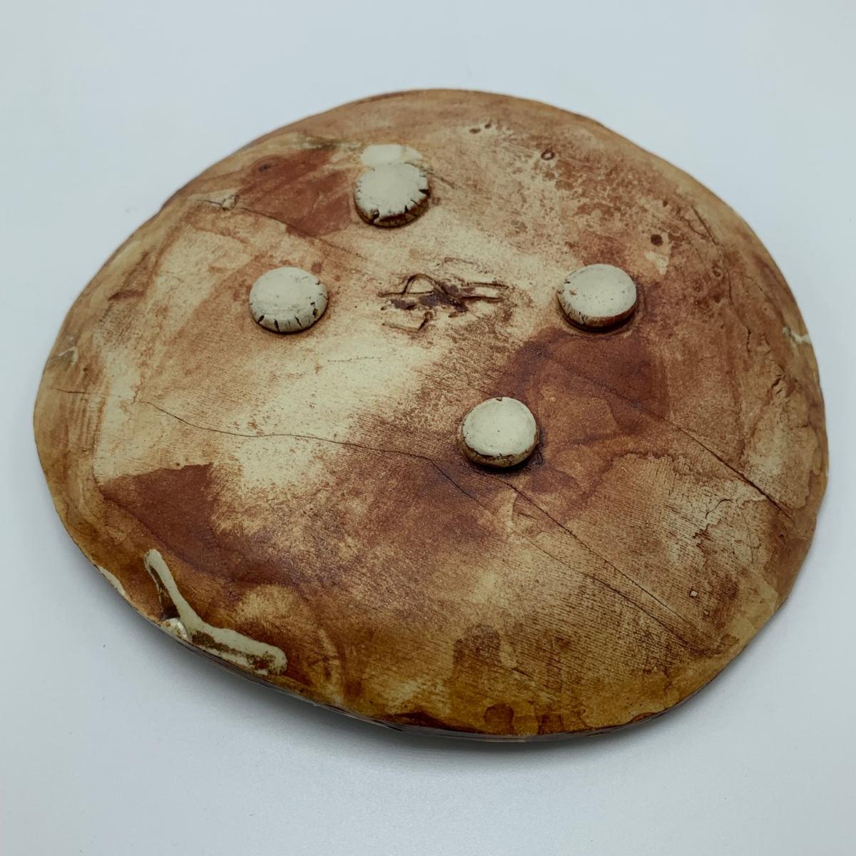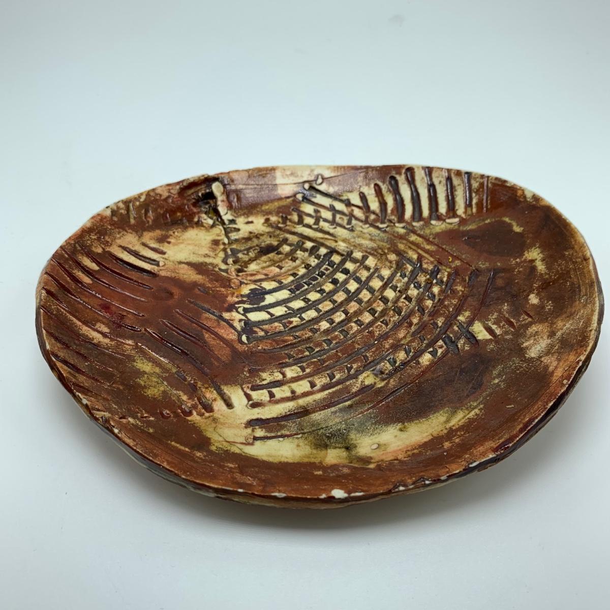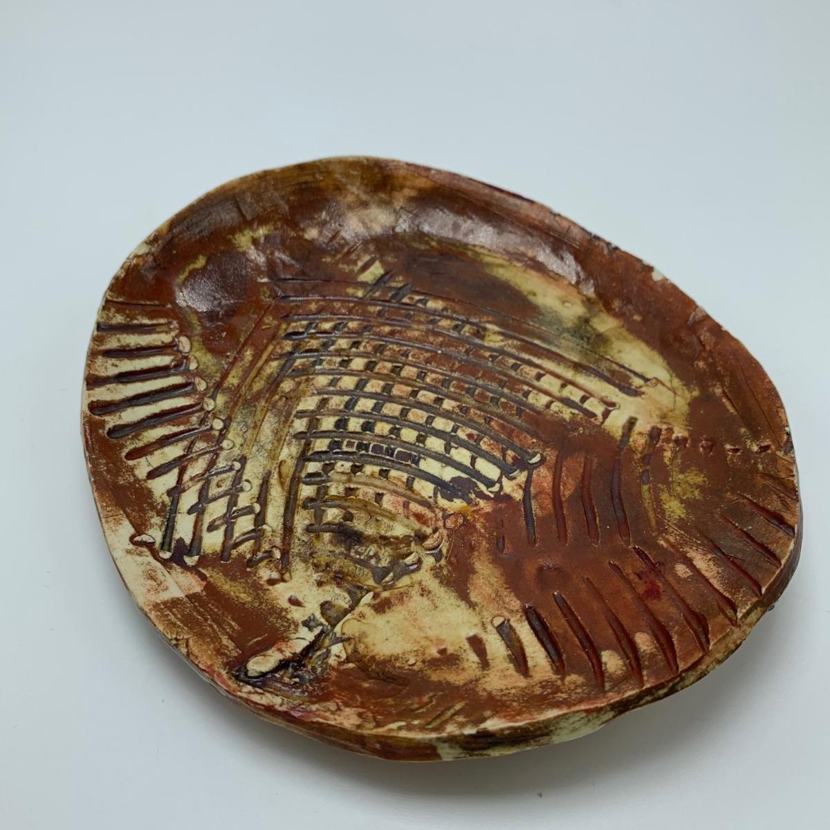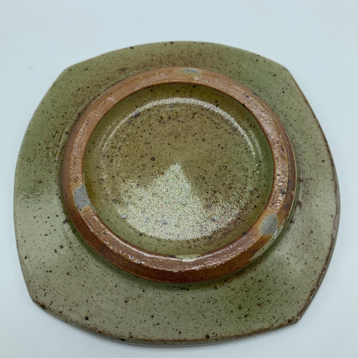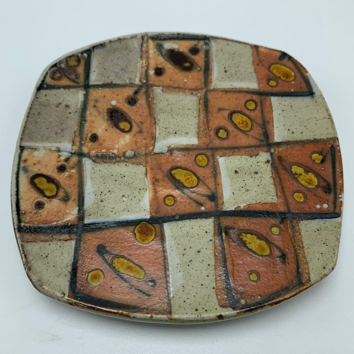 There are three small ceramic plates in this lot. Two have a checkered pattern. The other has a textured feel. The green checkered plate measures 5.75” x 5.75” and the red checkered plate is just slightly smaller. These appear to have the same stamp markings on the bottom. The textured plate is an 6.5” x 5.75” oval with slightly raised edges. All appear to be excellent condition. Shipping Available.