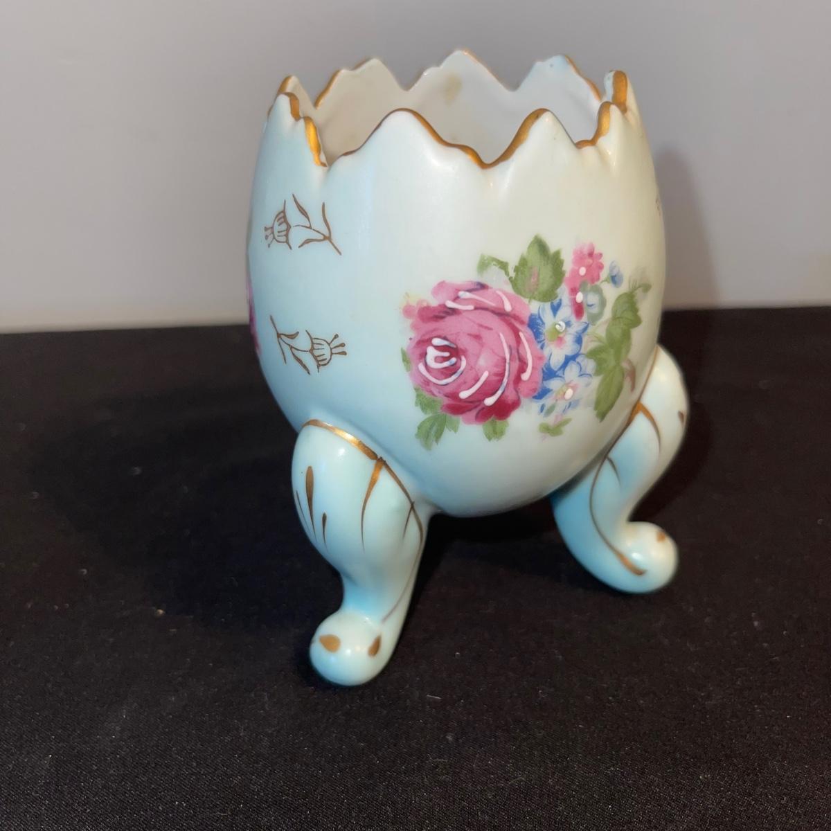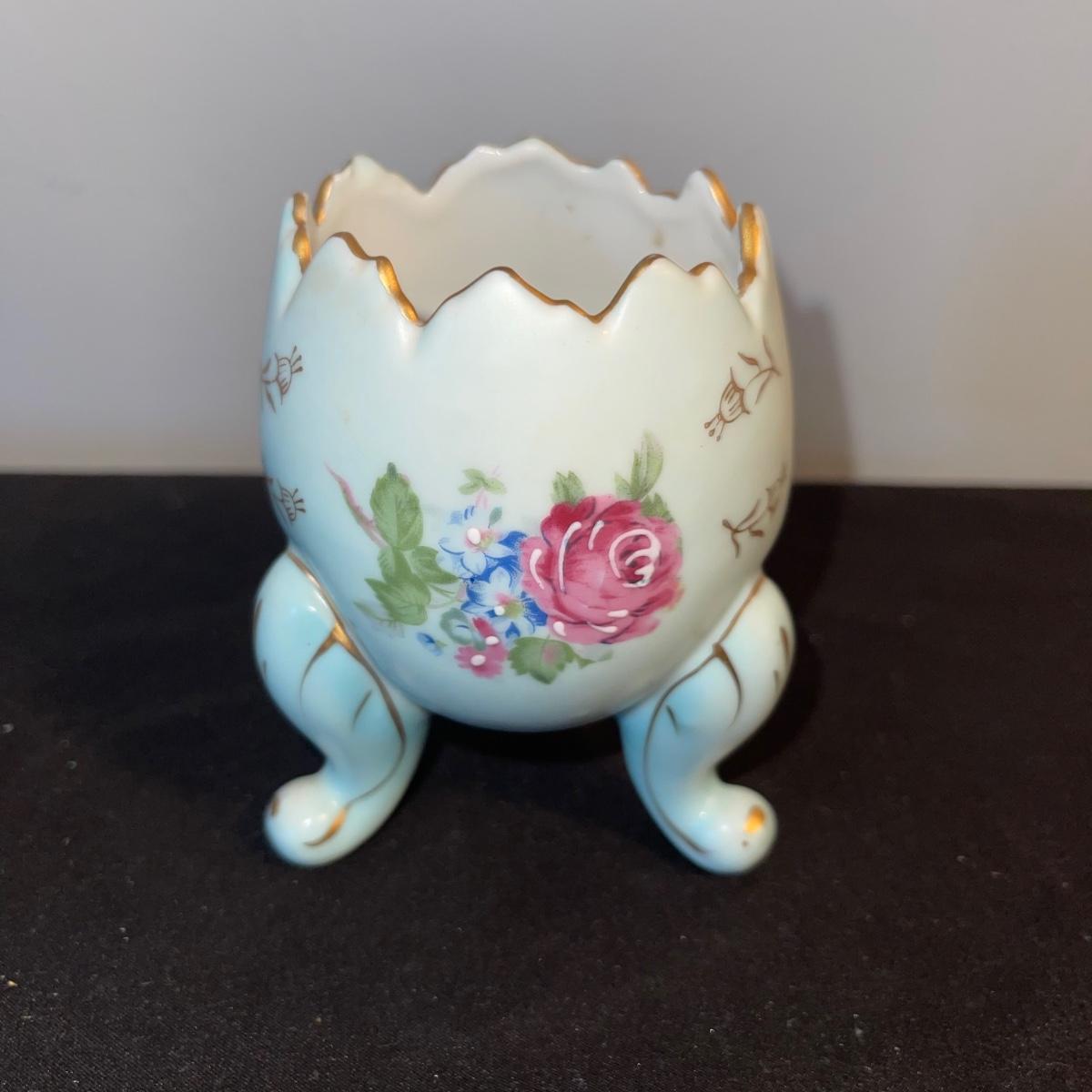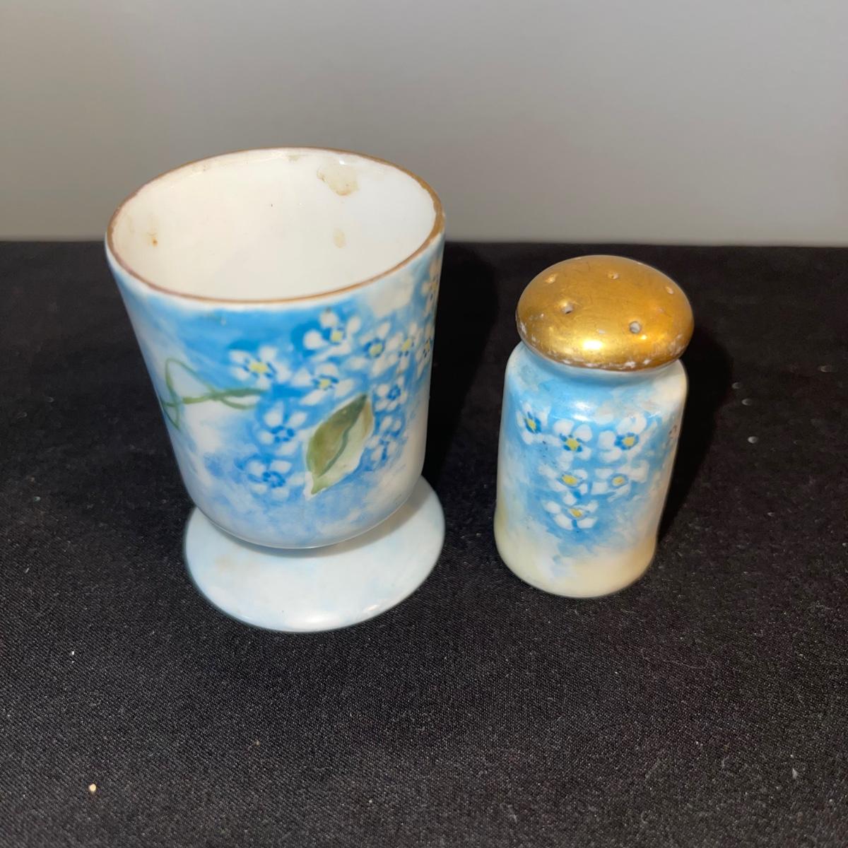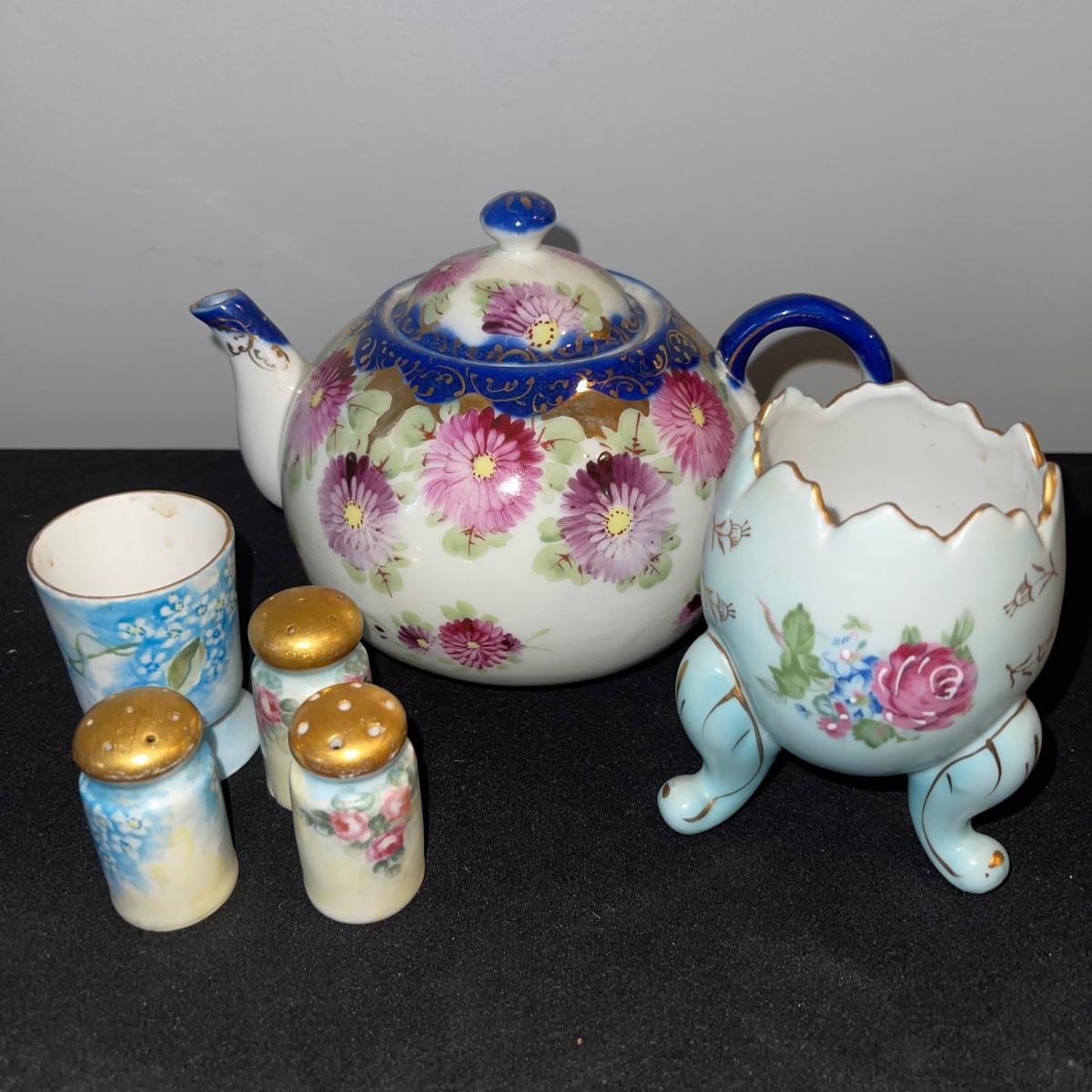 Included in this lot is a gold leaf porcelain tea pot, a vintage footed egg with a cracked rim design, a hard boiled egg holder/cup and matching salt shaker, and two small salt and pepper shakers. The teapot has a cracked handle and a piece of styrofoam stuck inside. All appear to be hand painted.