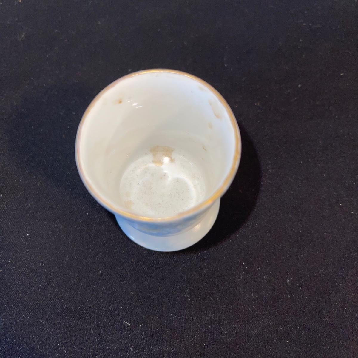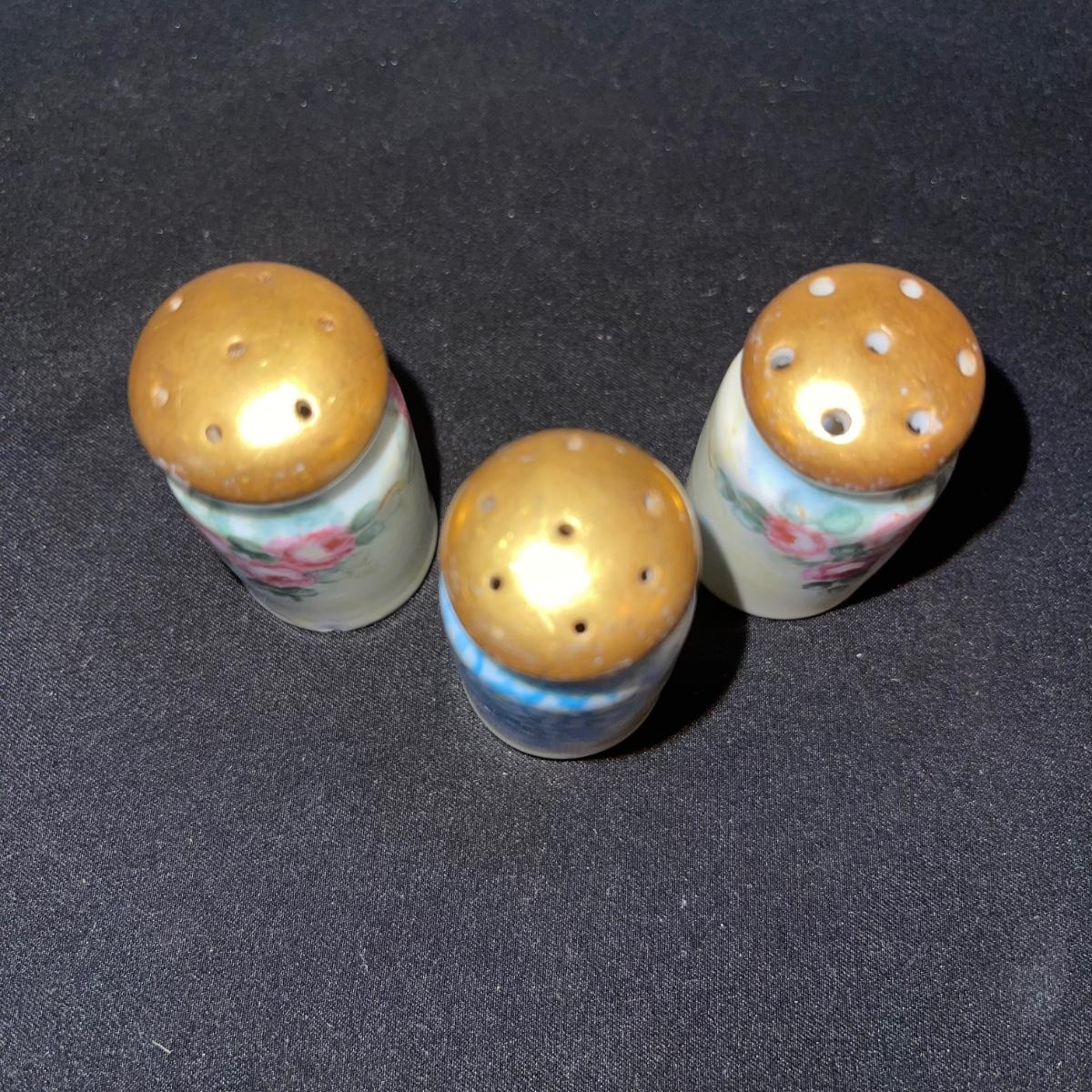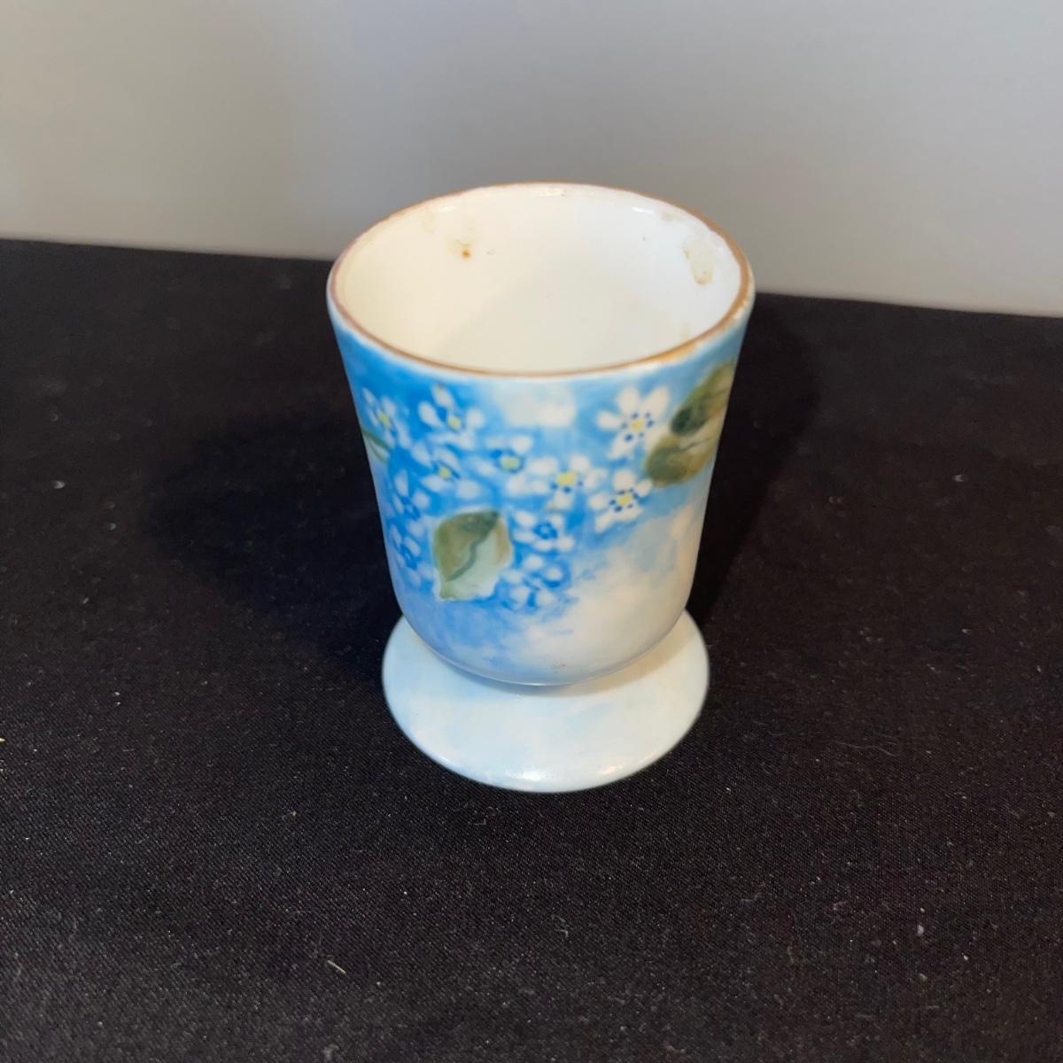 Included in this lot is a gold leaf porcelain tea pot, a vintage footed egg with a cracked rim design, a hard boiled egg holder/cup and matching salt shaker, and two small salt and pepper shakers. The teapot has a cracked handle and a piece of styrofoam stuck inside. All appear to be hand painted.