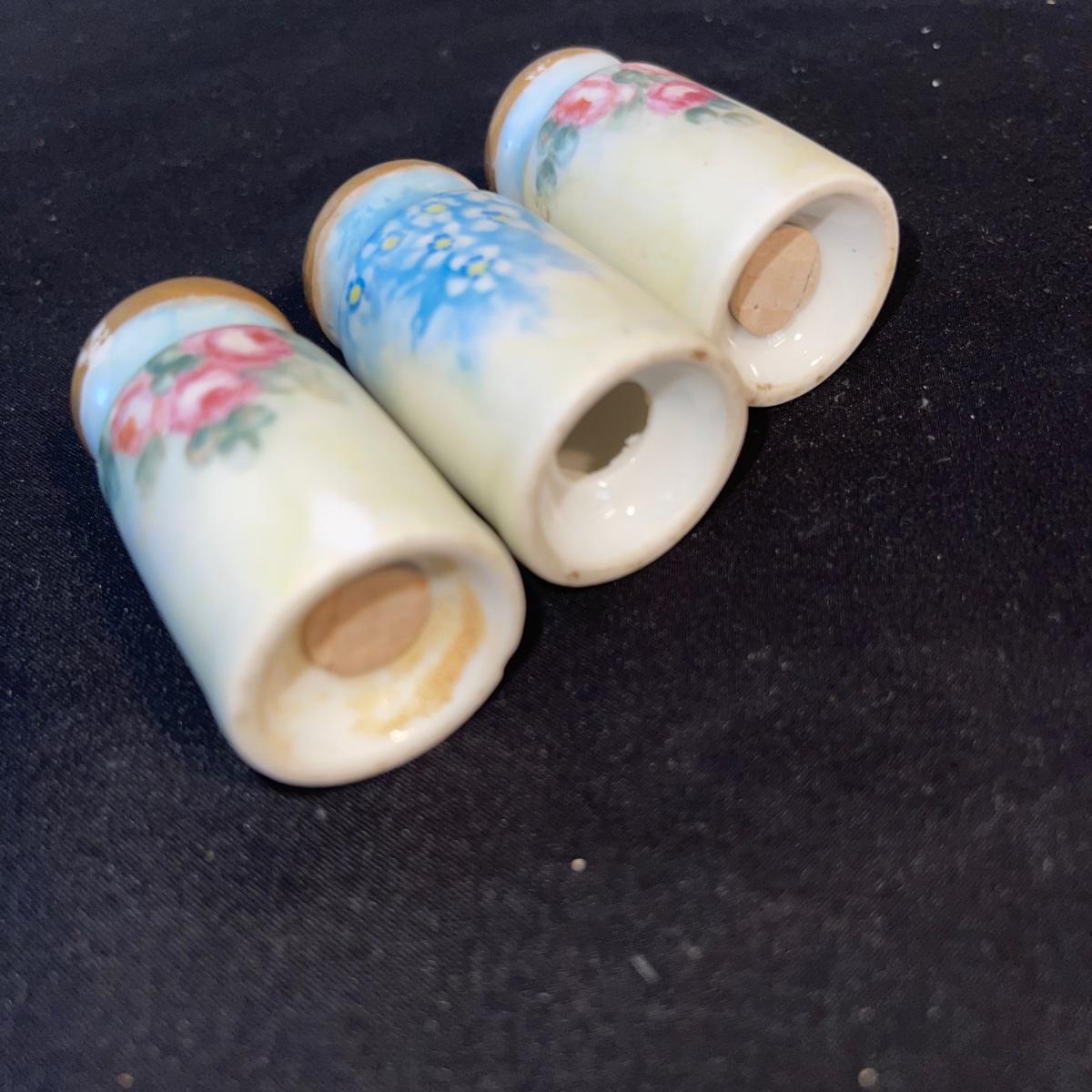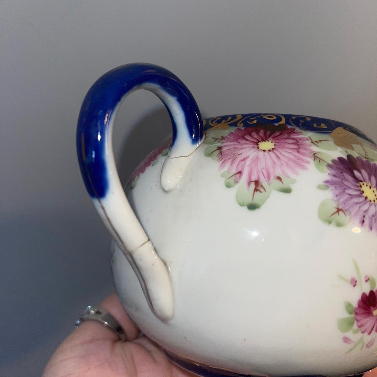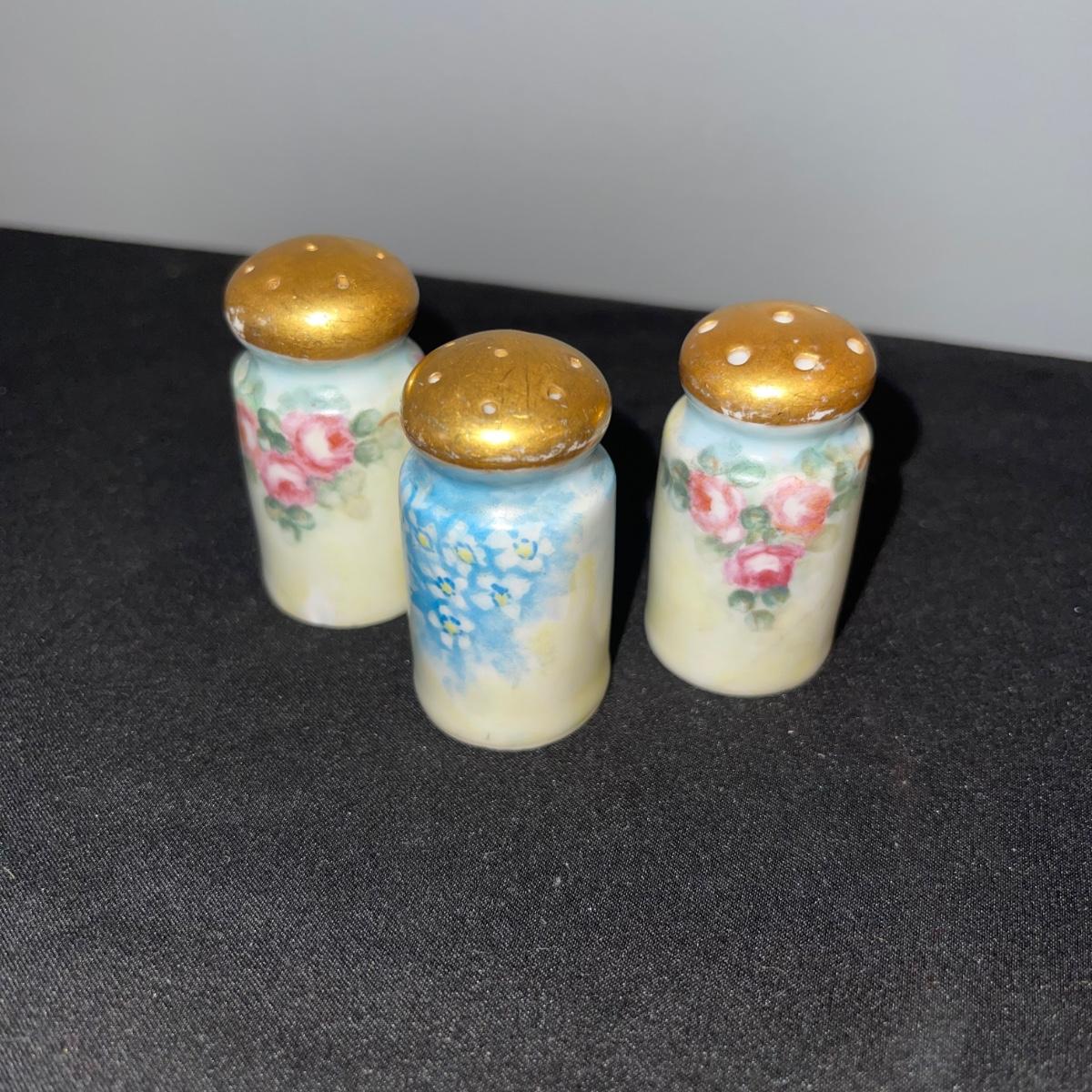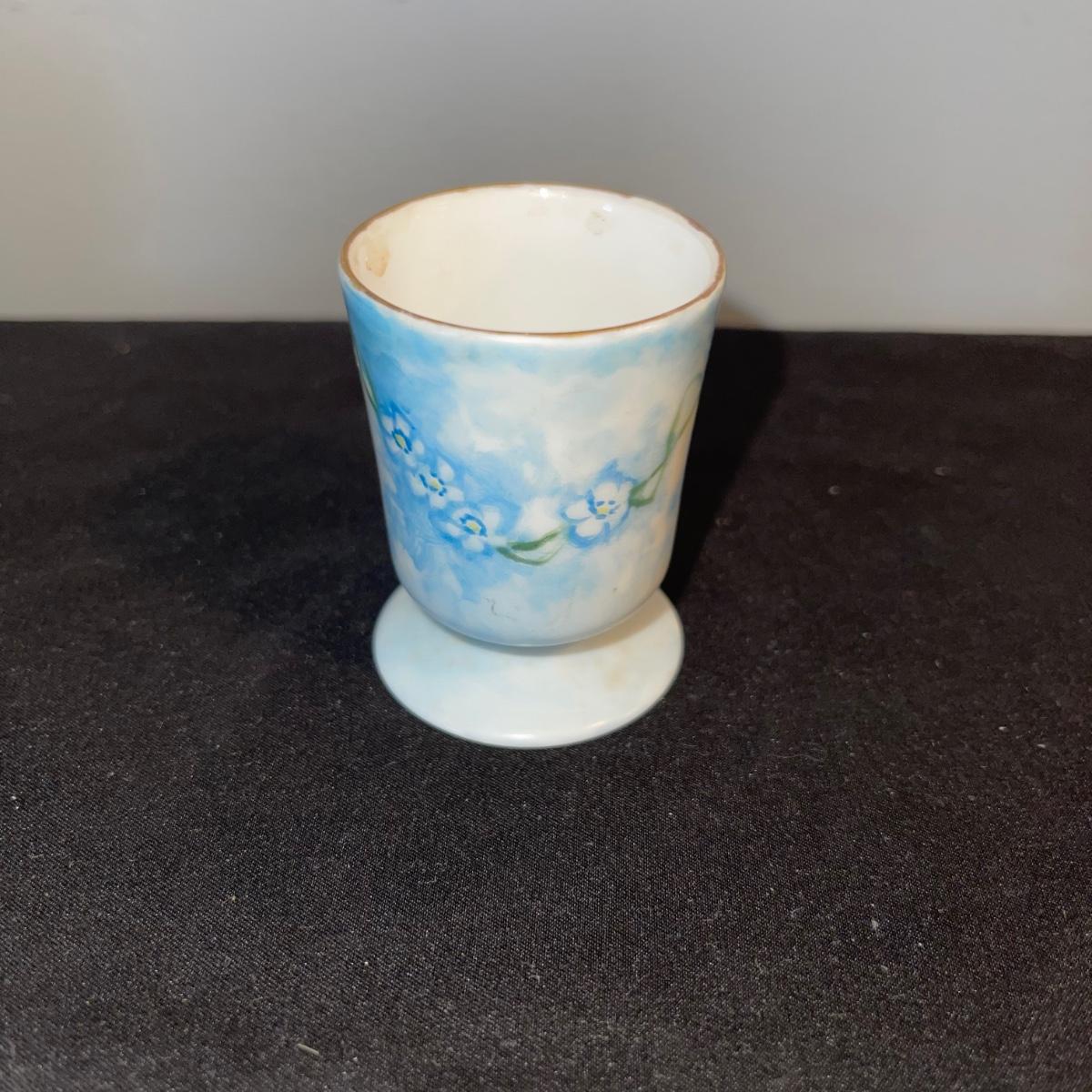 Included in this lot is a gold leaf porcelain tea pot, a vintage footed egg with a cracked rim design, a hard boiled egg holder/cup and matching salt shaker, and two small salt and pepper shakers. The teapot has a cracked handle and a piece of styrofoam stuck inside. All appear to be hand painted.