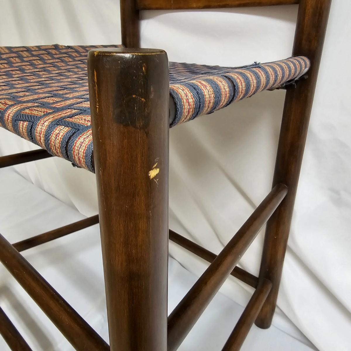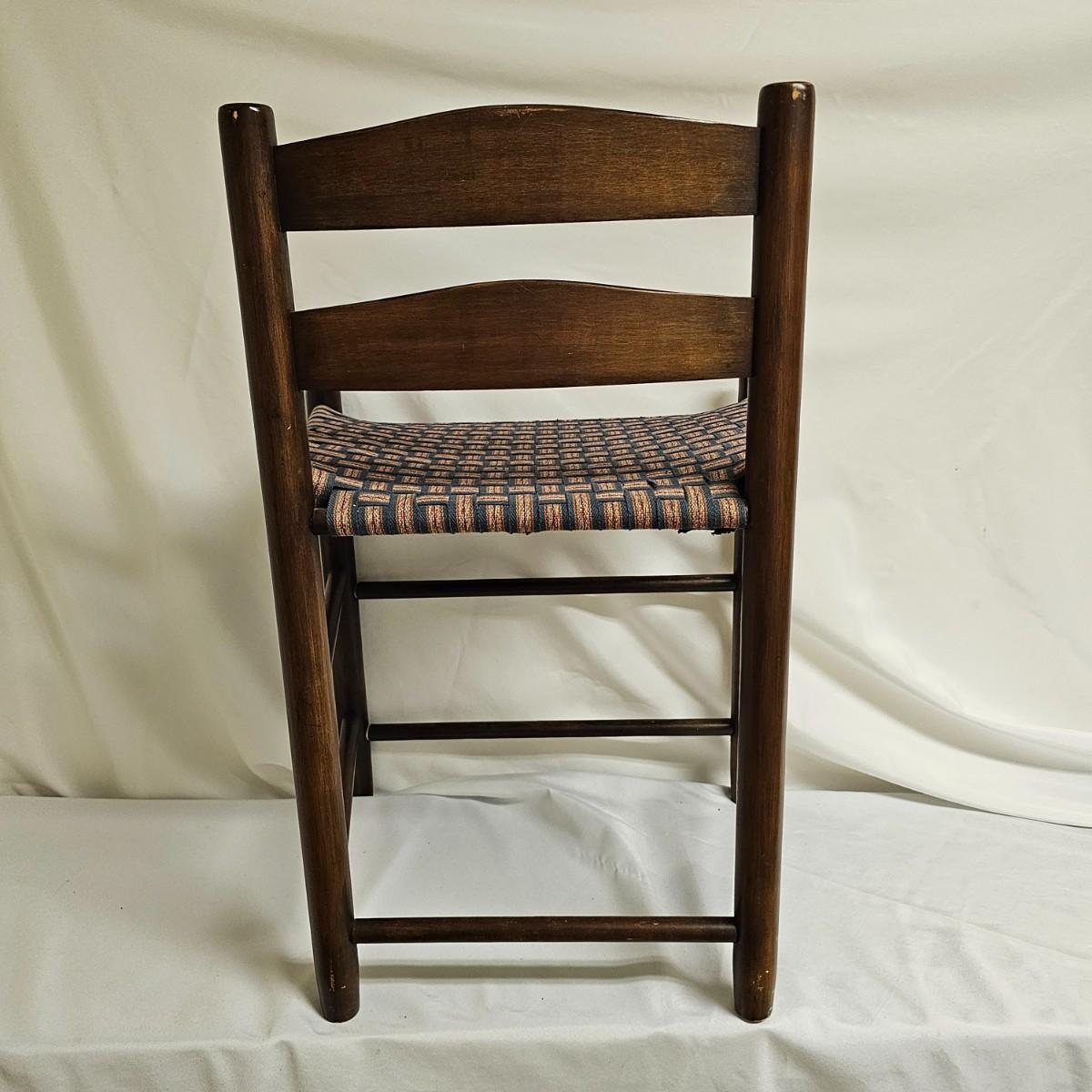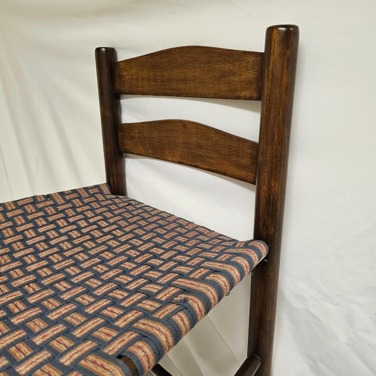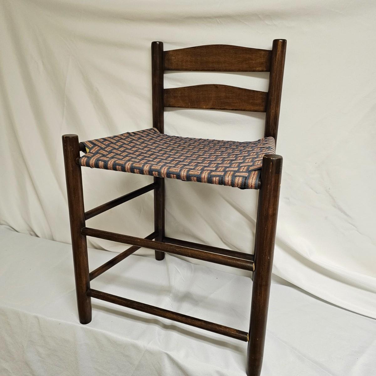A low, ladder back solid wood chair with a webbed, criss-cross seat. Chair measures 18.5" x 15" x 27"H with a seat height of 17.5”. Dark finish, has small nicks and rubs on back and legs. See photos for details. Local pickup only.