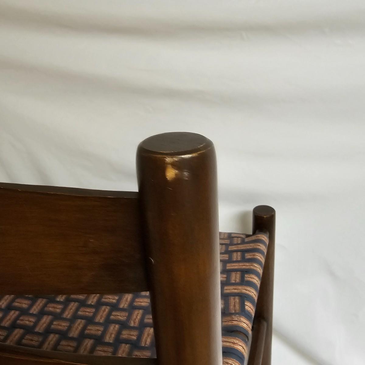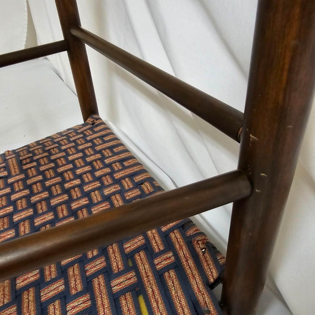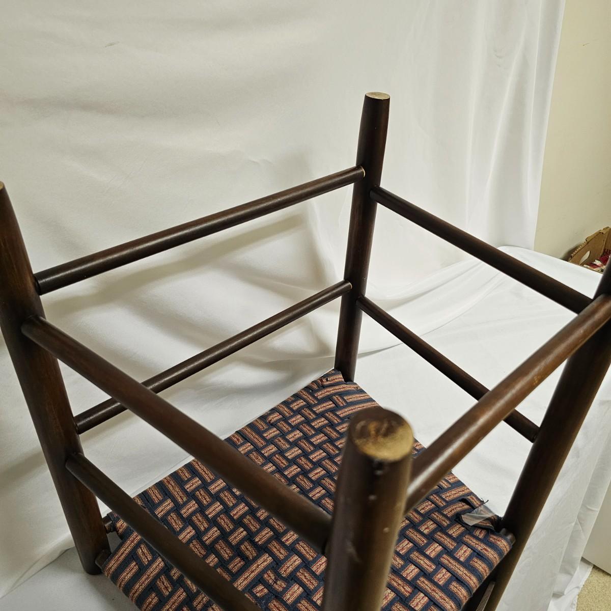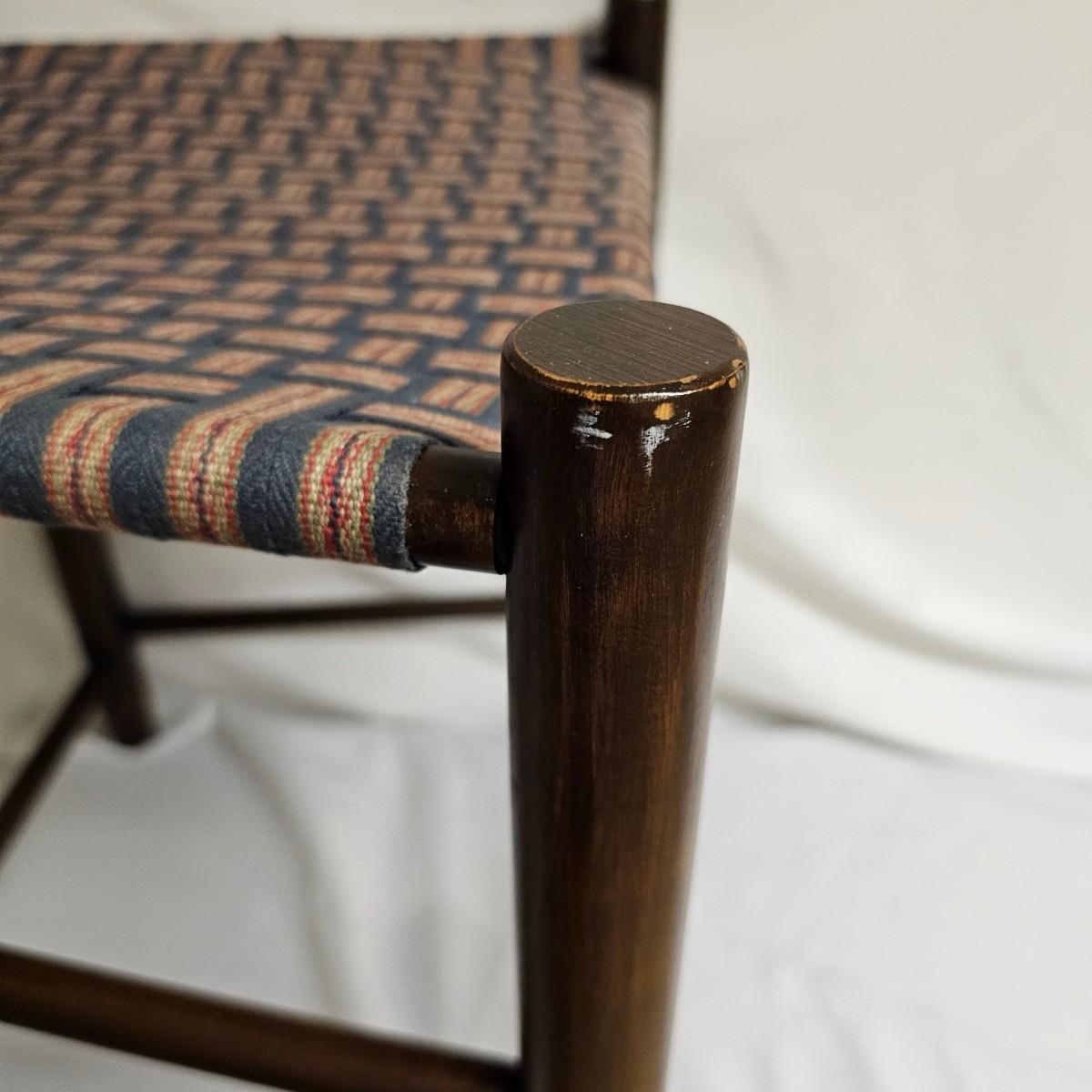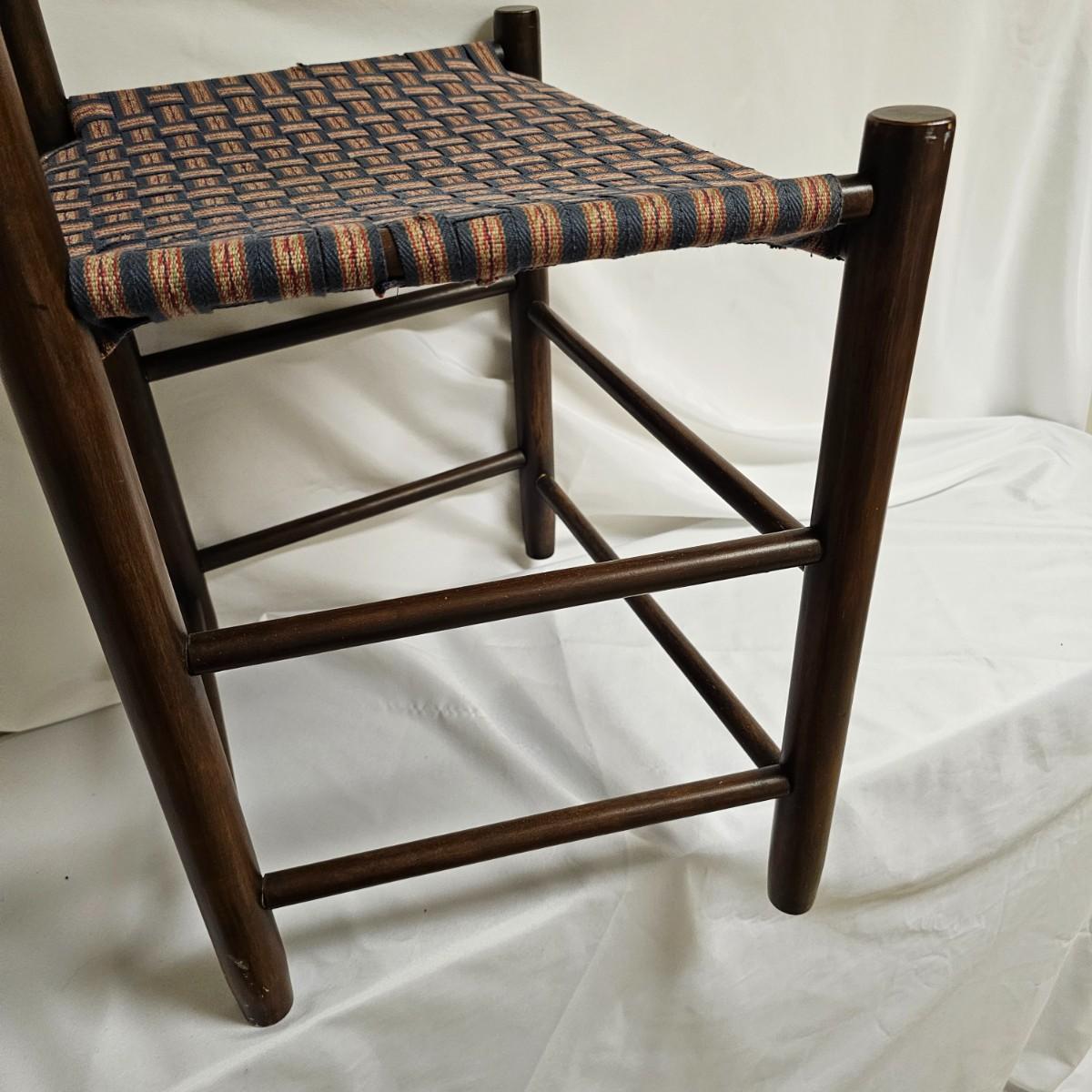A low, ladder back solid wood chair with a webbed, criss-cross seat. Chair measures 18.5" x 15" x 27"H with a seat height of 17.5”. Dark finish, has small nicks and rubs on back and legs. See photos for details. Local pickup only.