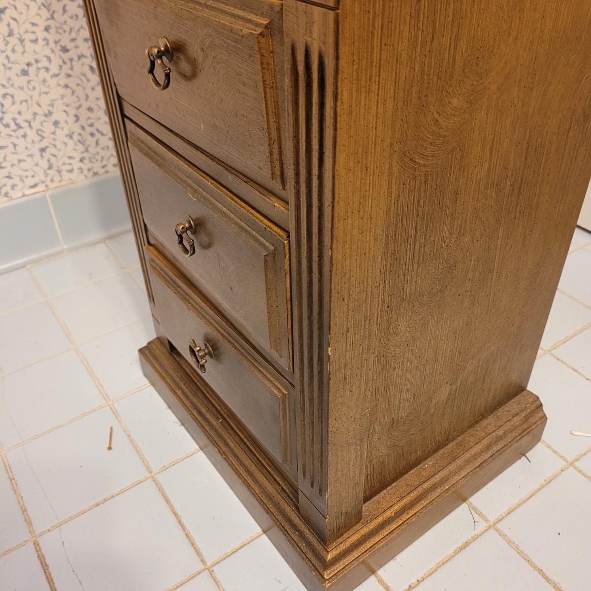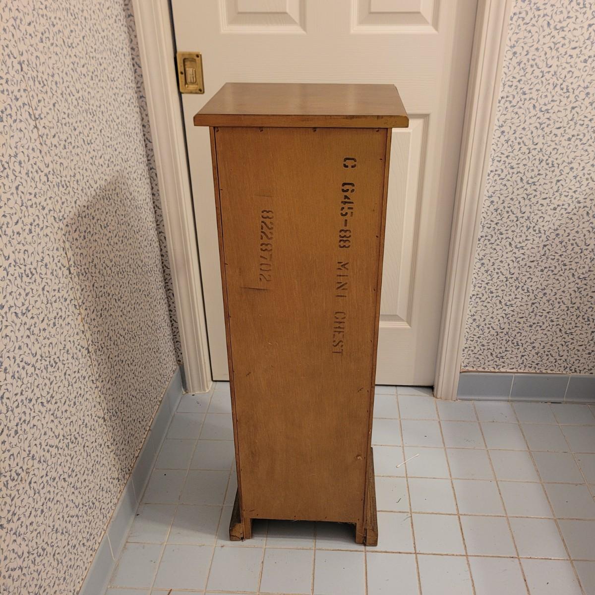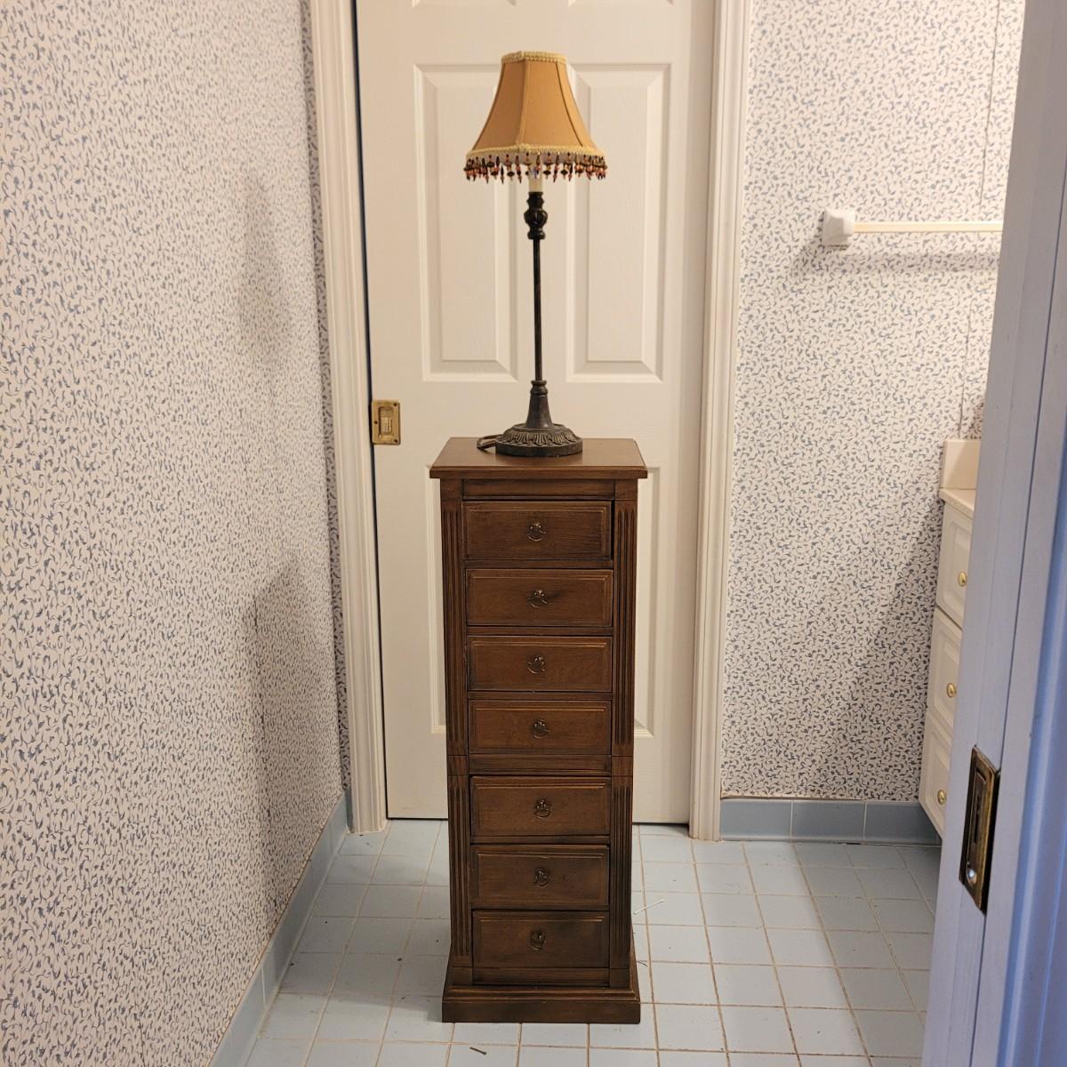 This small, narrow wooden chest has seven drawers with dovetail joints. Top drawer sticks out just a bit. Lamp turns on when plugged in. Chest measures approximately 13” x 11” x 37.5”H. Please see photos for details. Local pick up only.