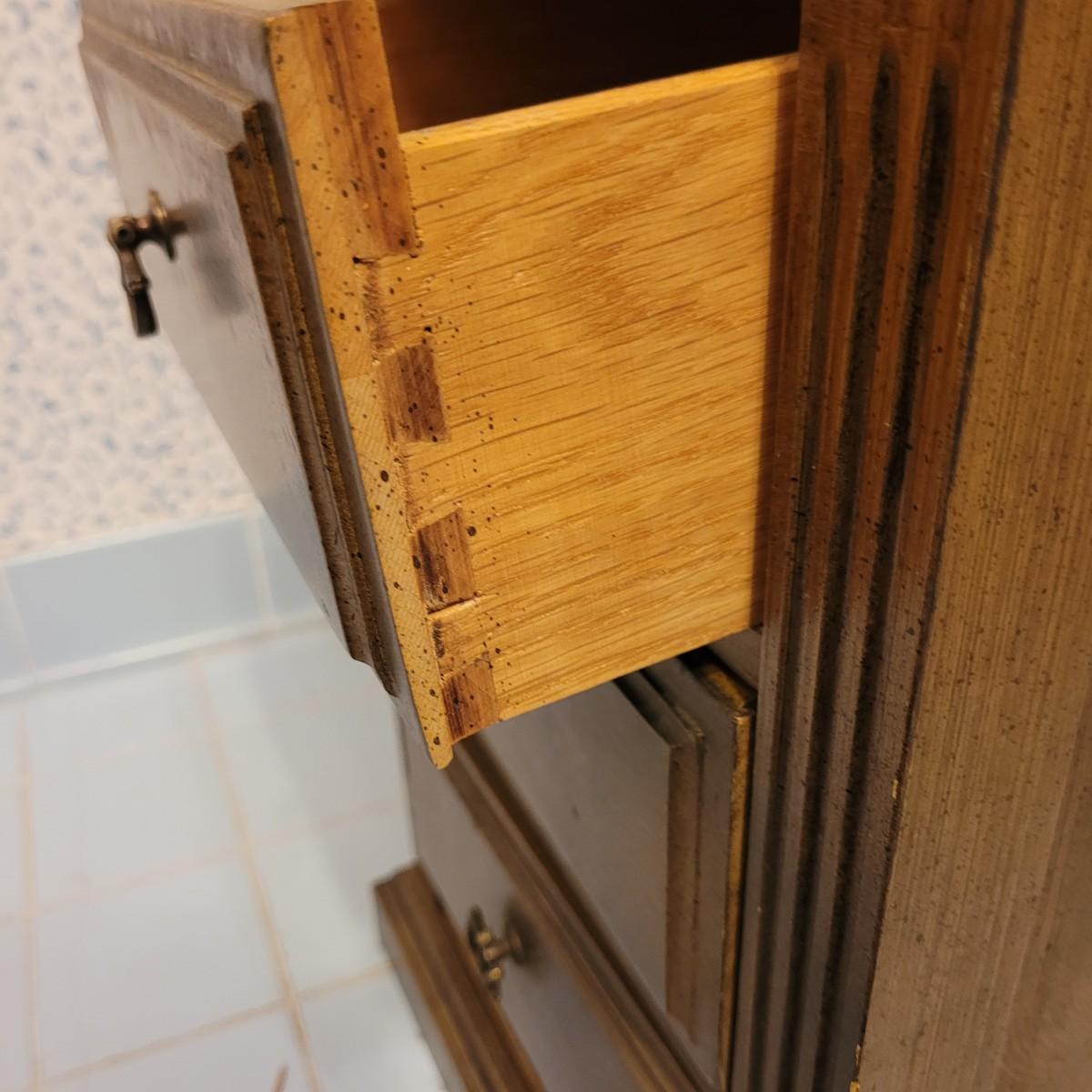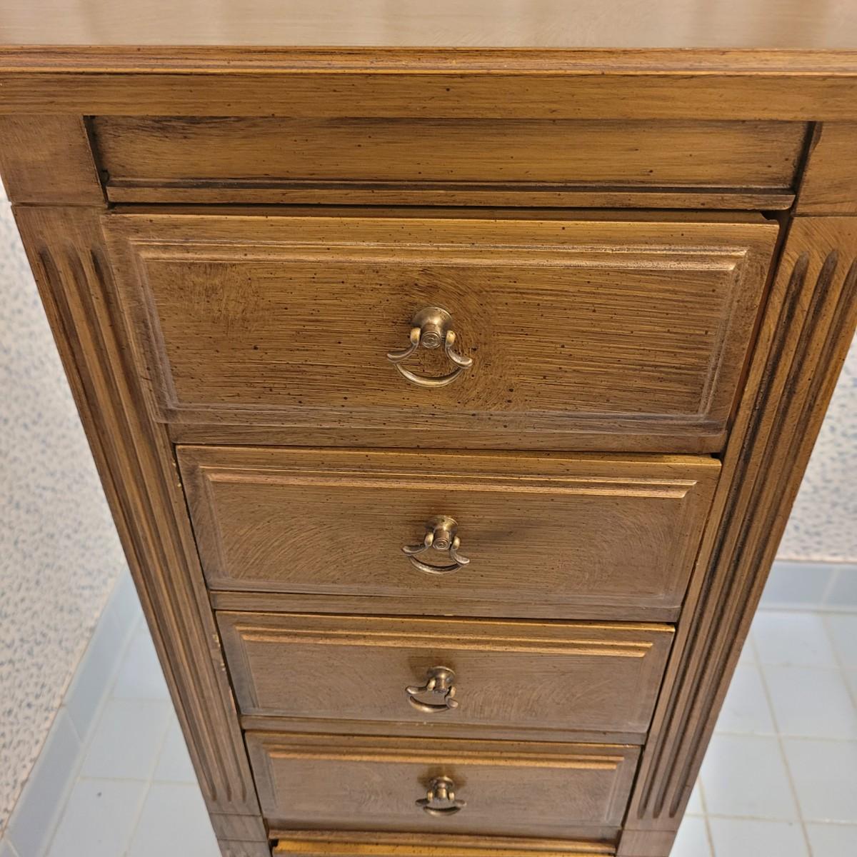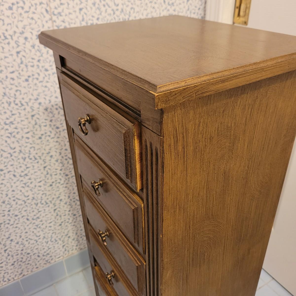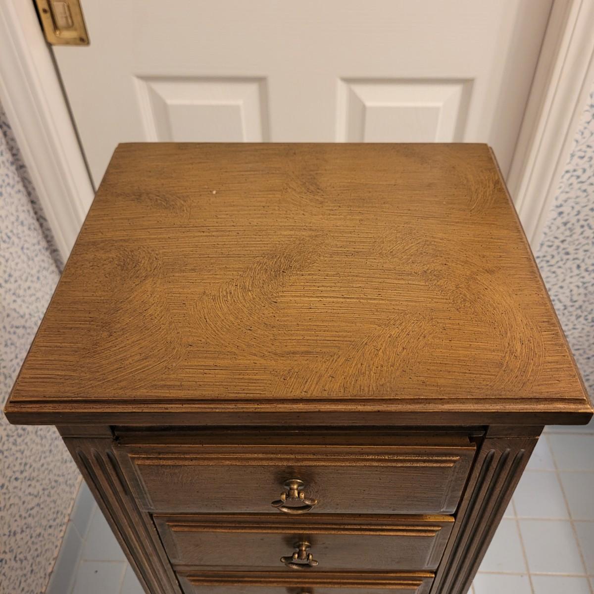 This small, narrow wooden chest has seven drawers with dovetail joints. Top drawer sticks out just a bit. Lamp turns on when plugged in. Chest measures approximately 13” x 11” x 37.5”H. Please see photos for details. Local pick up only.