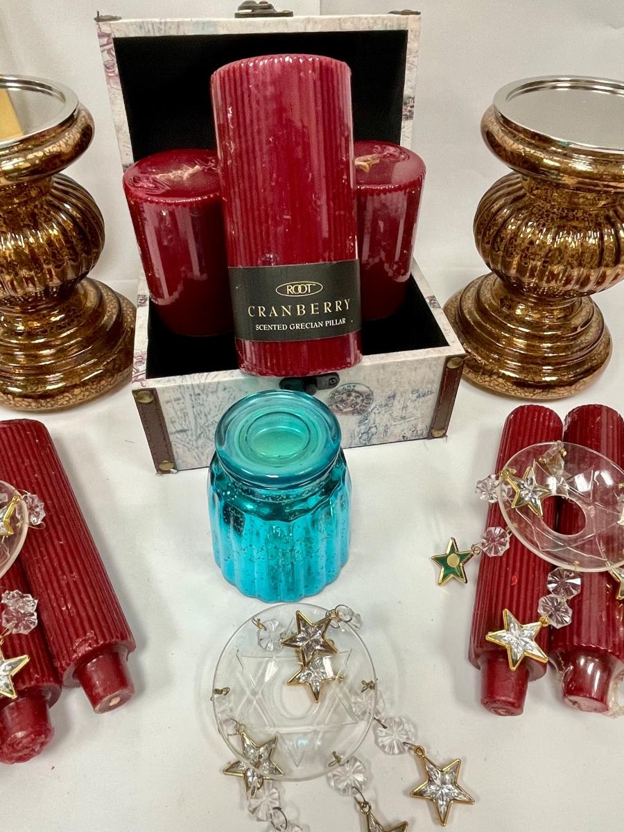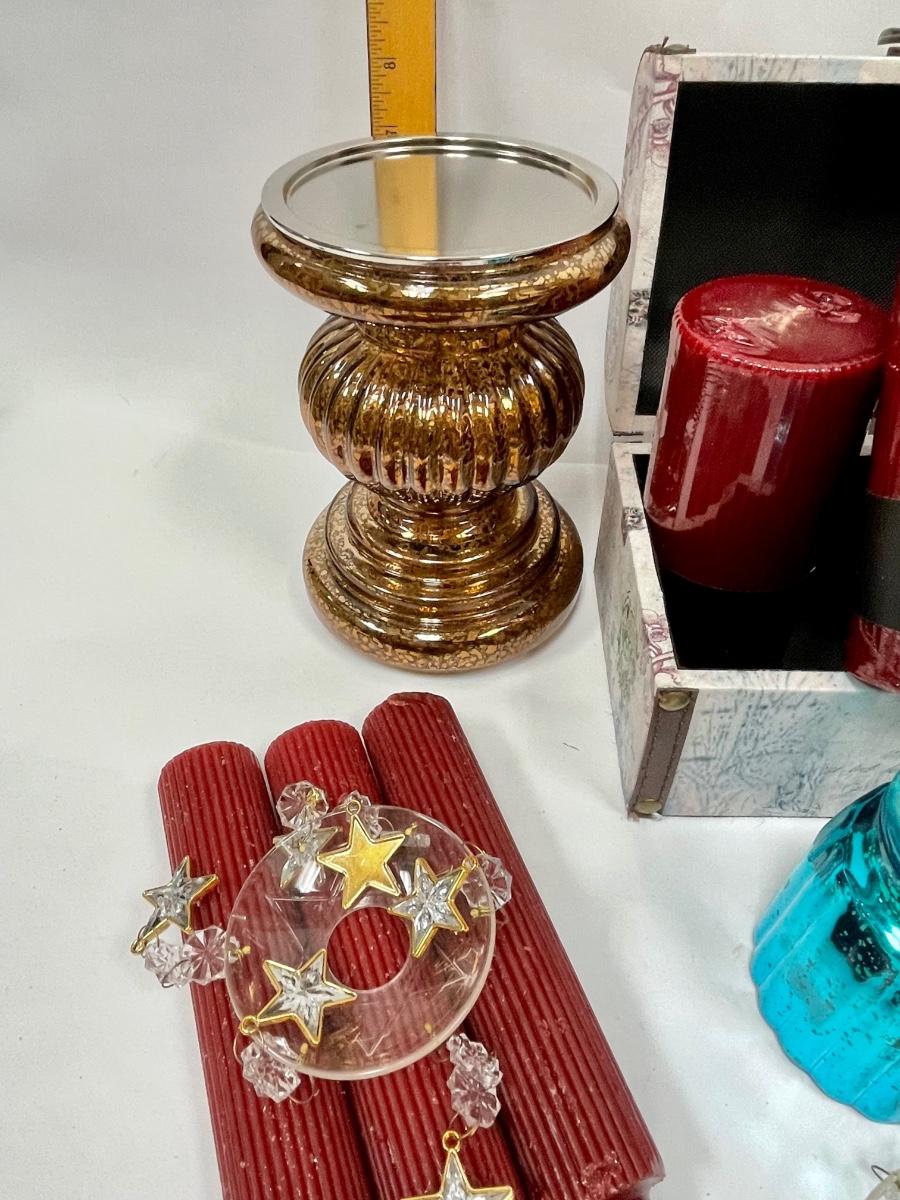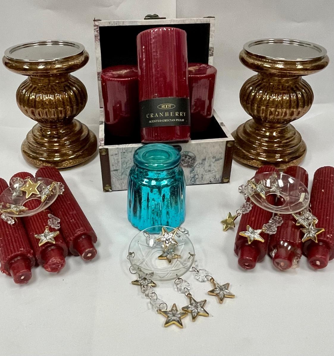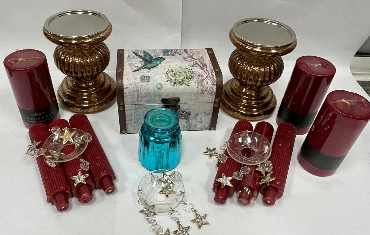 Small Chest with assorted candle decor, bases, candles, ring trim peices