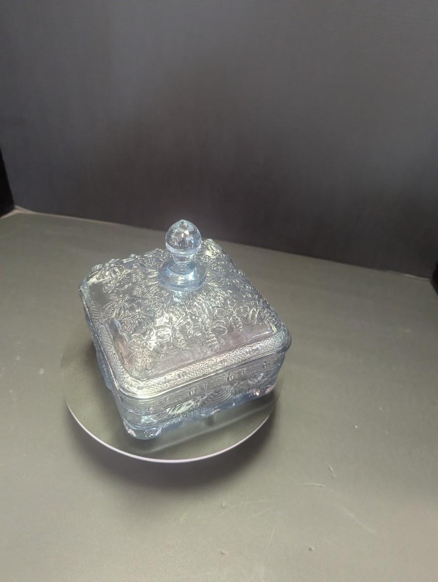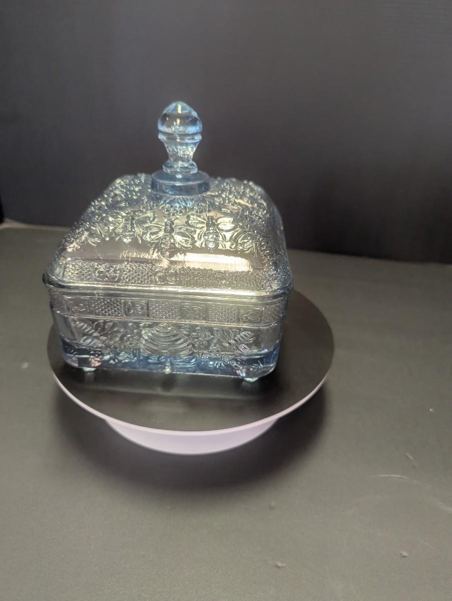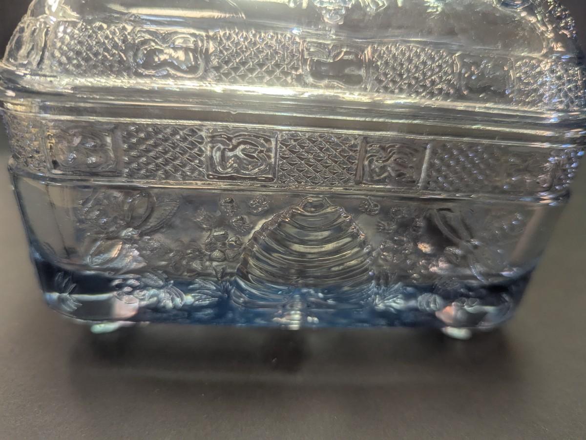 Vintage Tiara Indiana Glass Honey Bee & Beehives Candy Dish Light Blue
