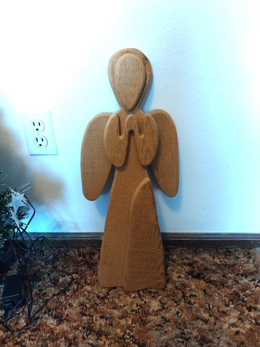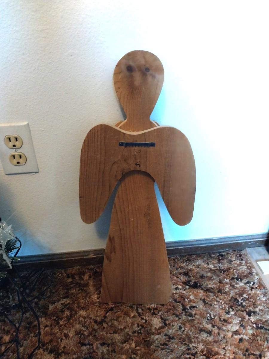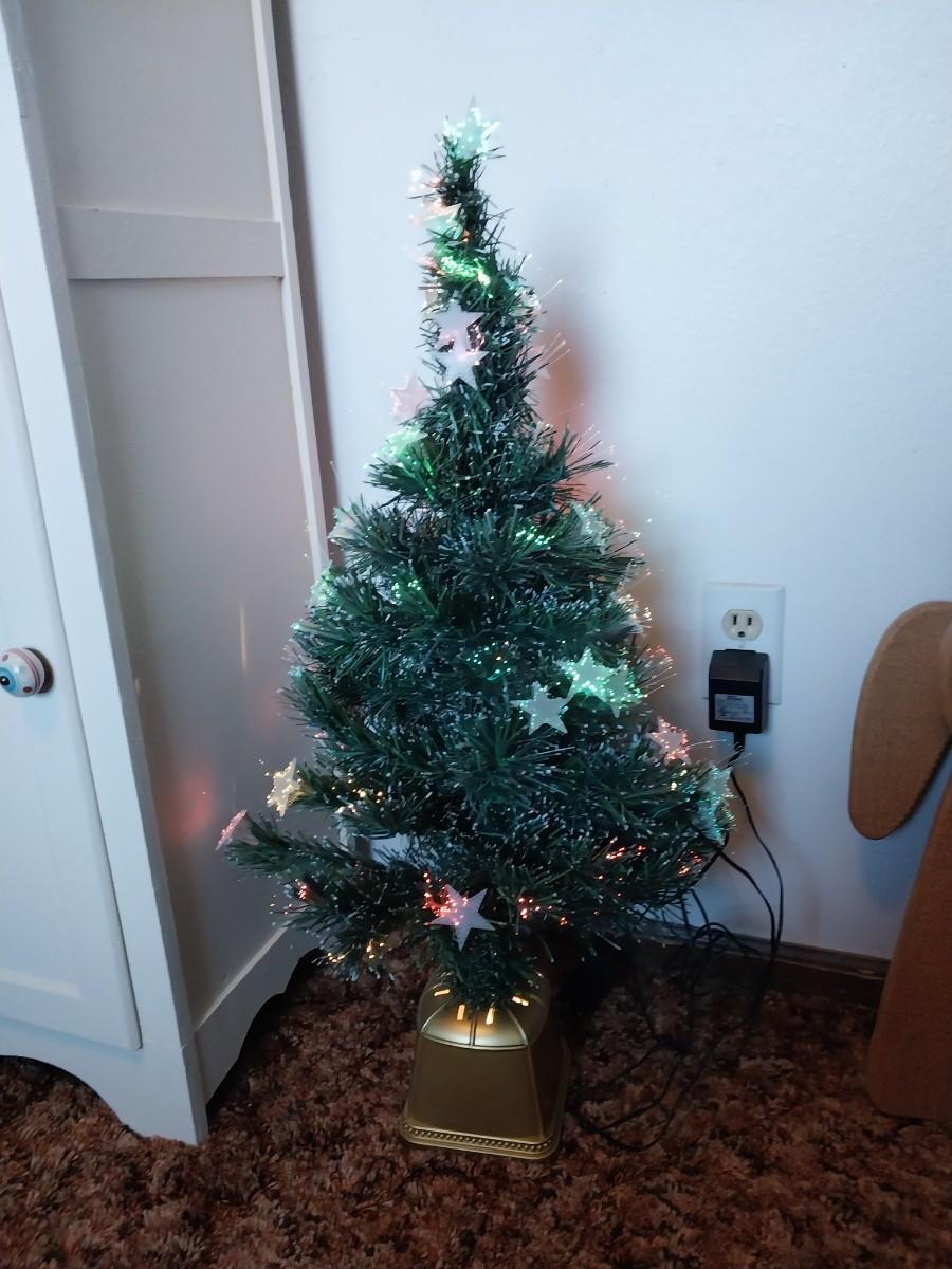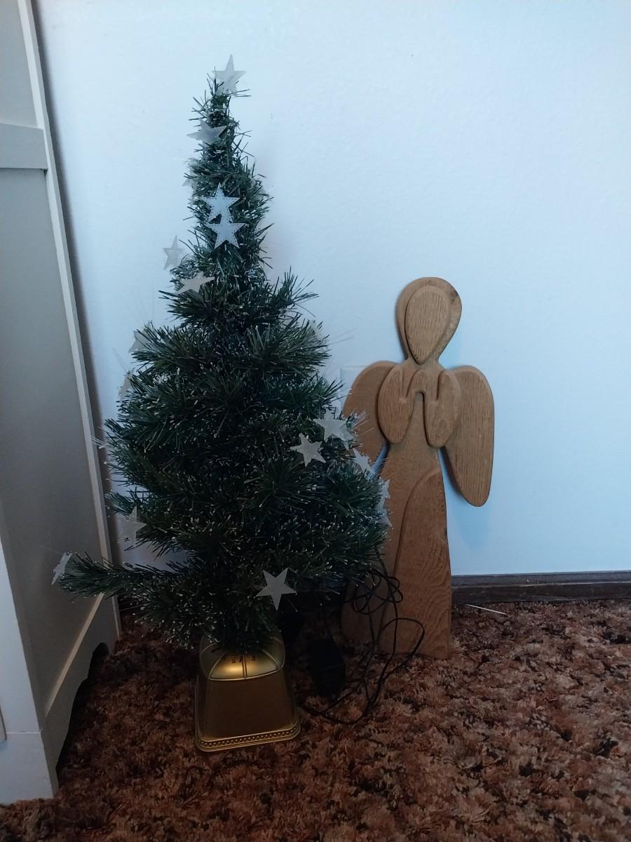 SMALL CHRISTMAS TREE WITH LIGHTS AND WALL HUNG WOODEN ANGEL