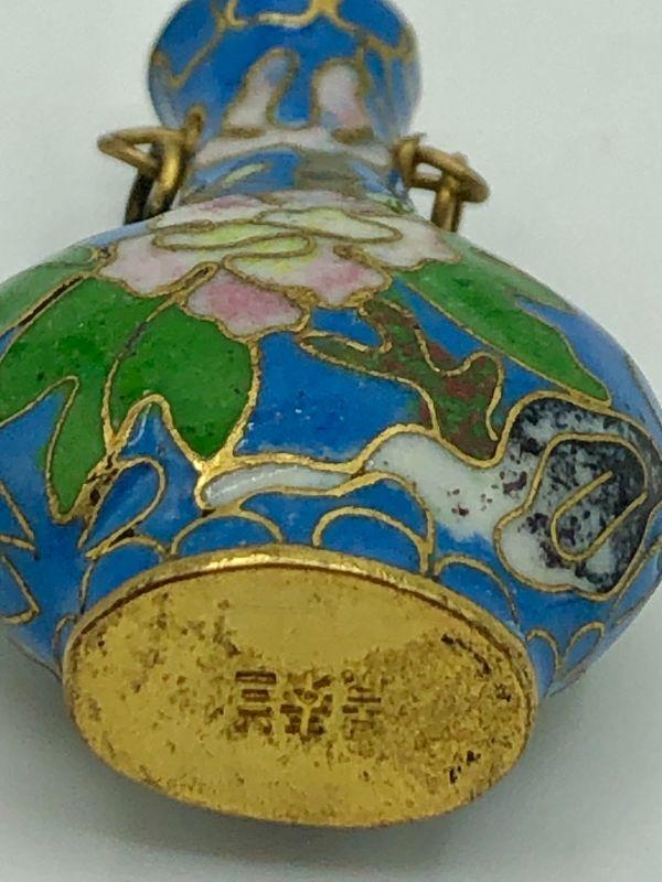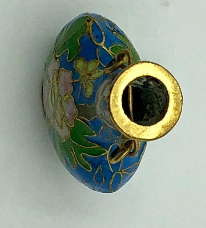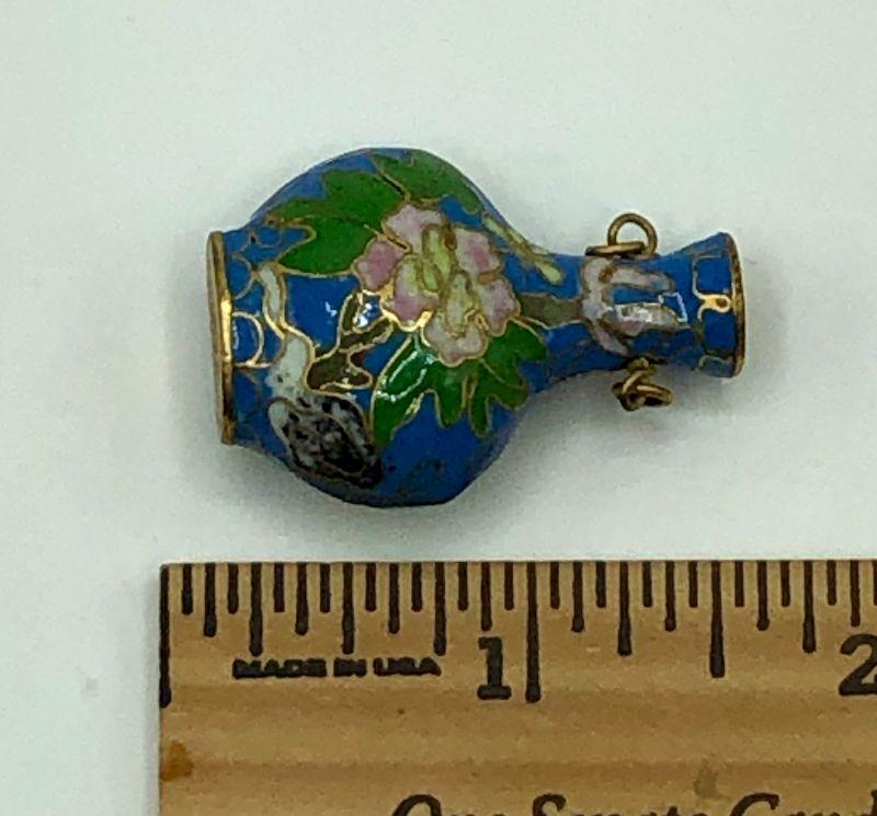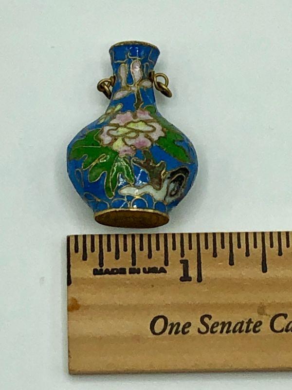 Cloisonne Urn. Small, 1.5" in size. Sky blue with flowers, gold accents. Stamped on the bottom. Has loops on each side of the neck, possibly once a pendant or had small chain.