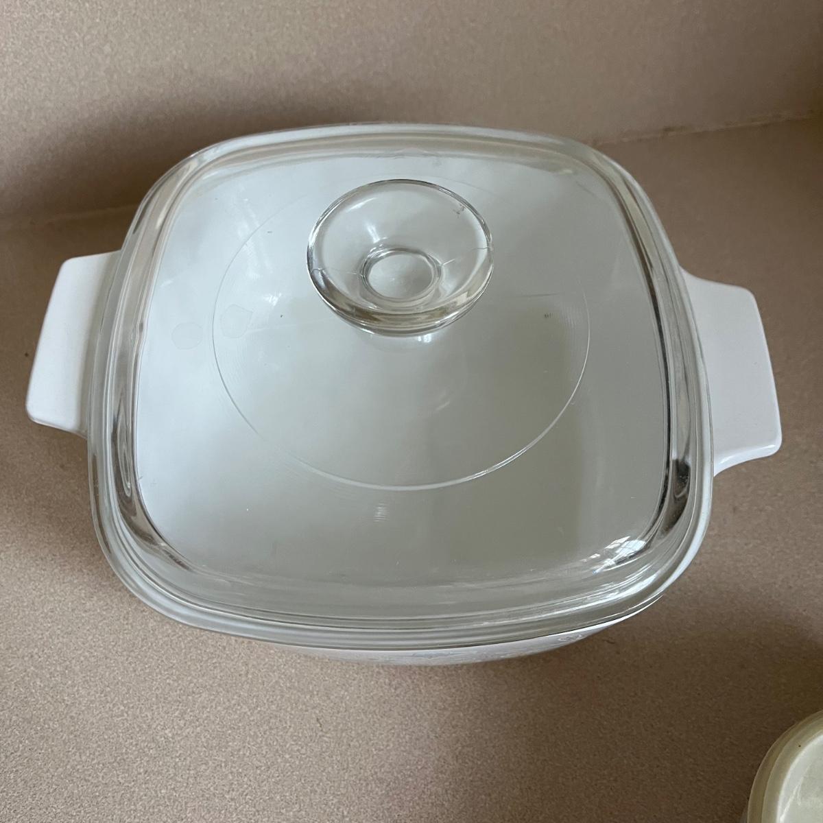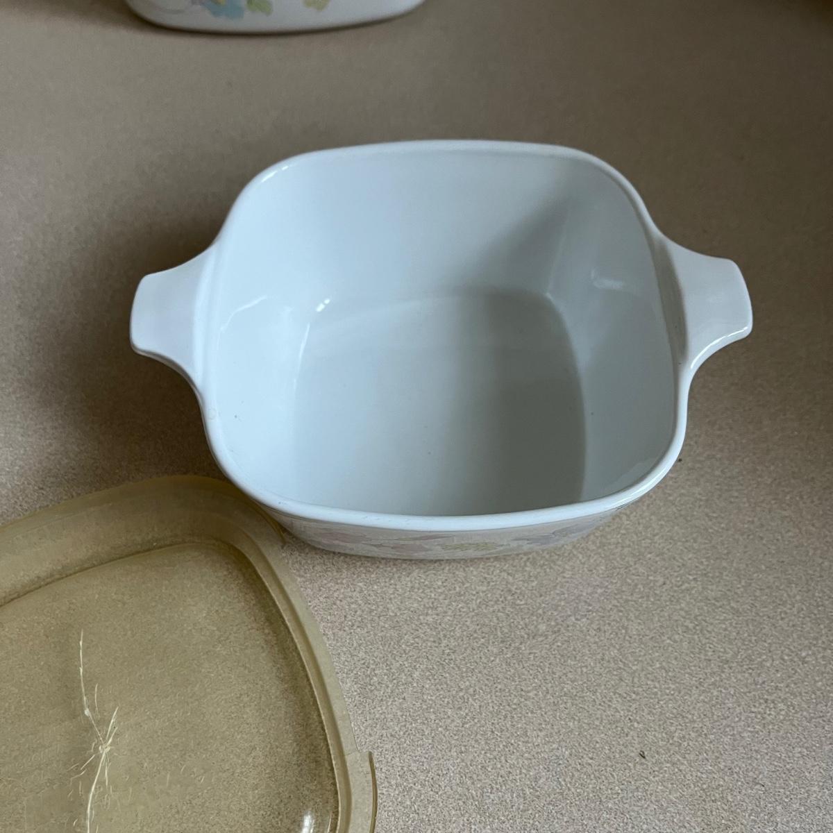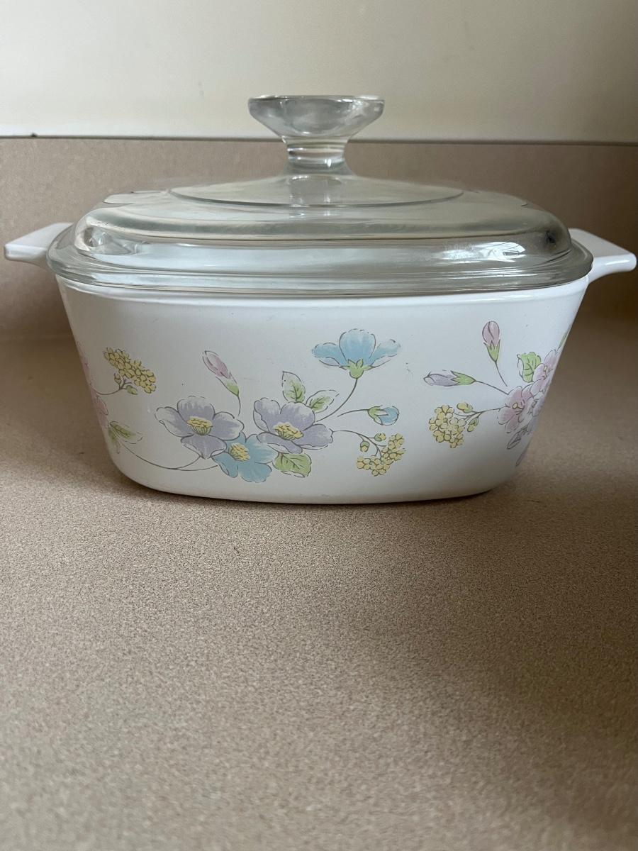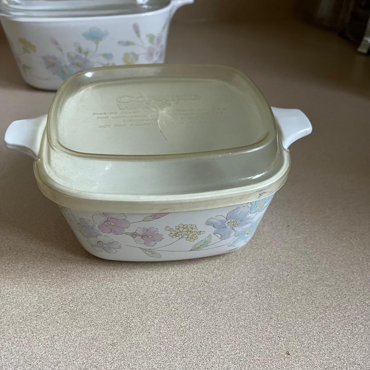 Four lidded pieces of Corning Ware. Two casserole dishes in the Pastel Bouquet pattern. The largest measures 7” x 9” including handles and has a glass lid. The smallest has a plastic matching lid. Also a one-pint size frying pan in the La Sauge pattern with a matching glass lid and a glass canister in the same pattern with a plastic lid. All need a good cleaning. Signs of wear. Shipping available.