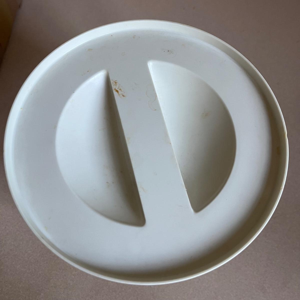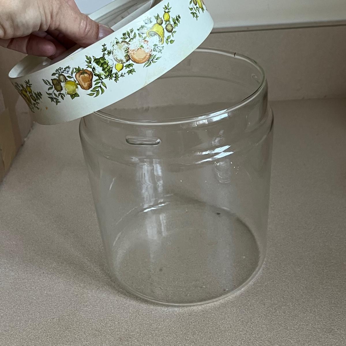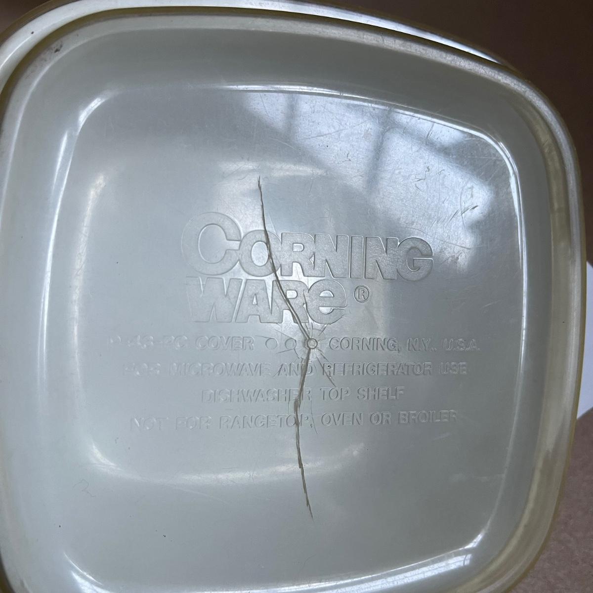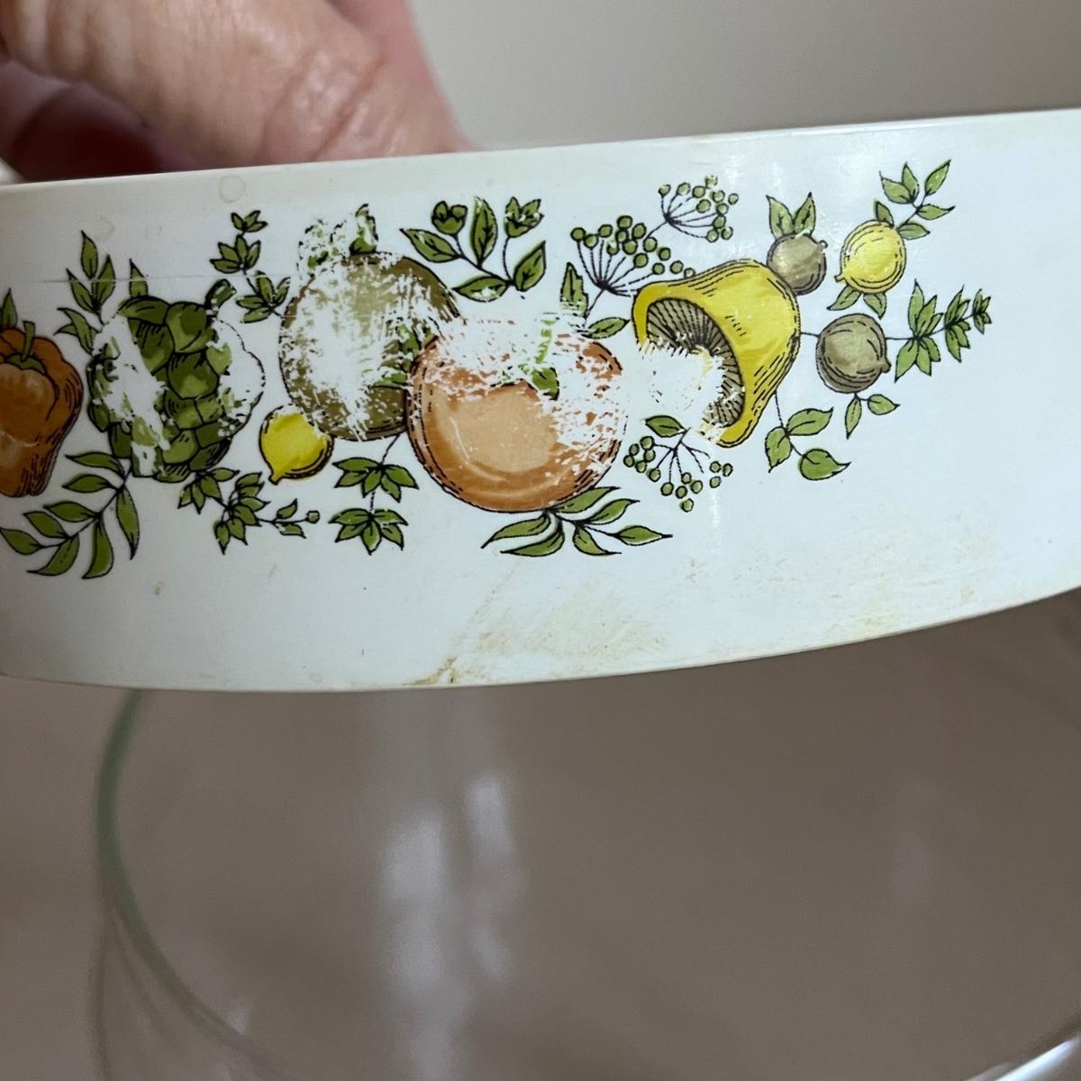Four lidded pieces of Corning Ware. Two casserole dishes in the Pastel Bouquet pattern. The largest measures 7” x 9” including handles and has a glass lid. The smallest has a plastic matching lid. Also a one-pint size frying pan in the La Sauge pattern with a matching glass lid and a glass canister in the same pattern with a plastic lid. All need a good cleaning. Signs of wear. Shipping available.