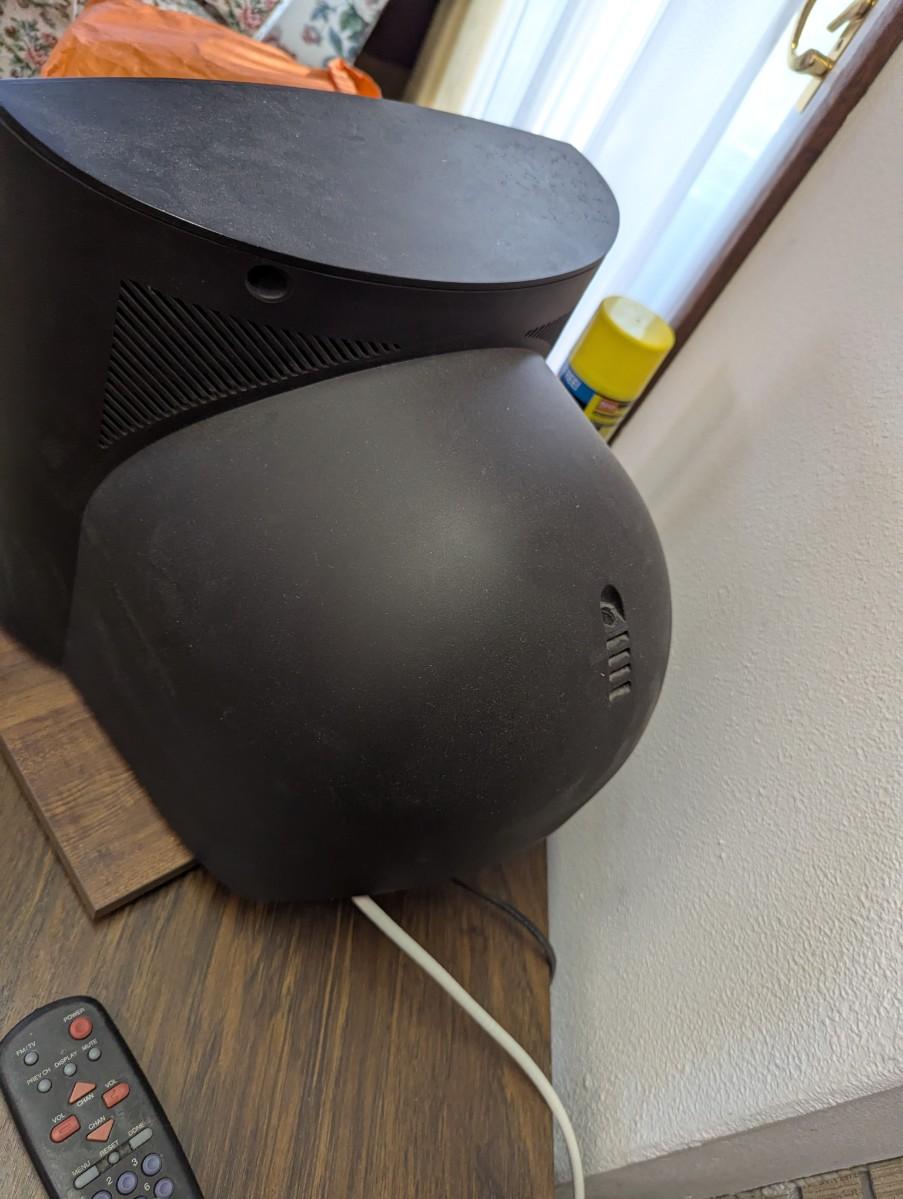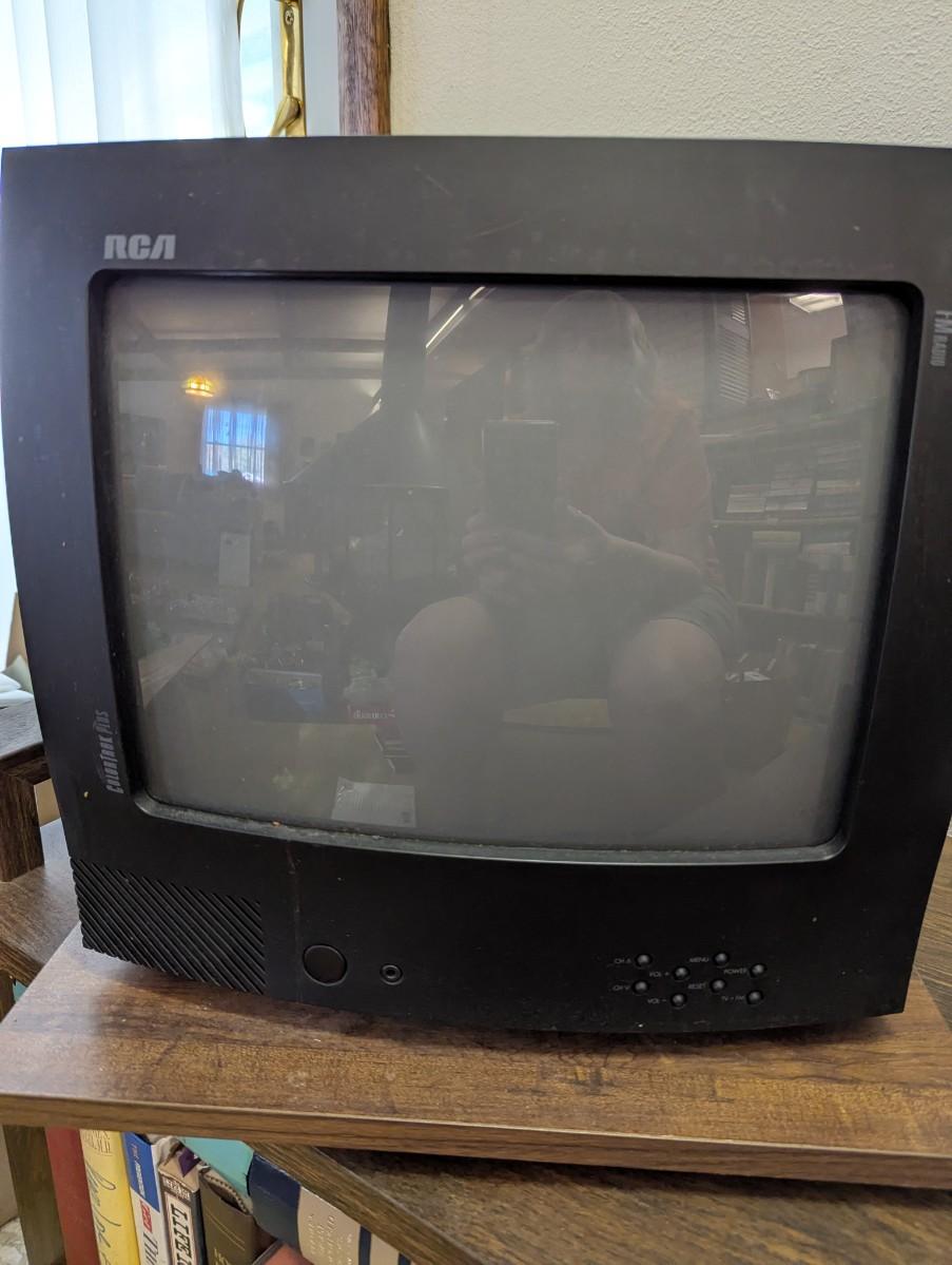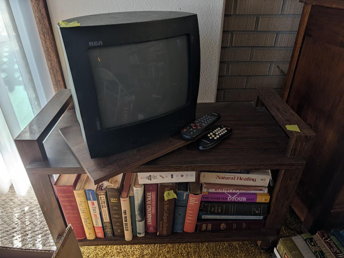 .Vintage RCA T.V. with remote. T.V. stand is included, but books are not. It does work.