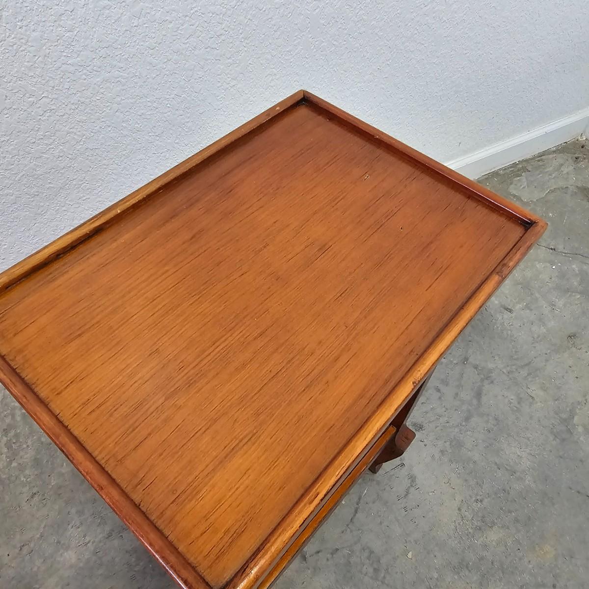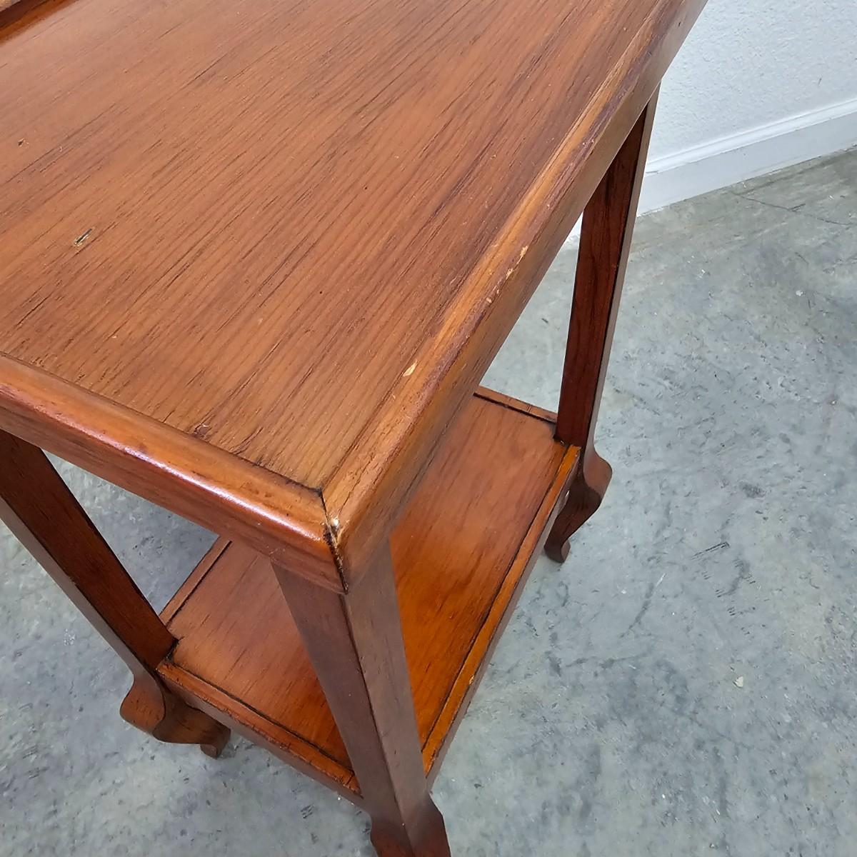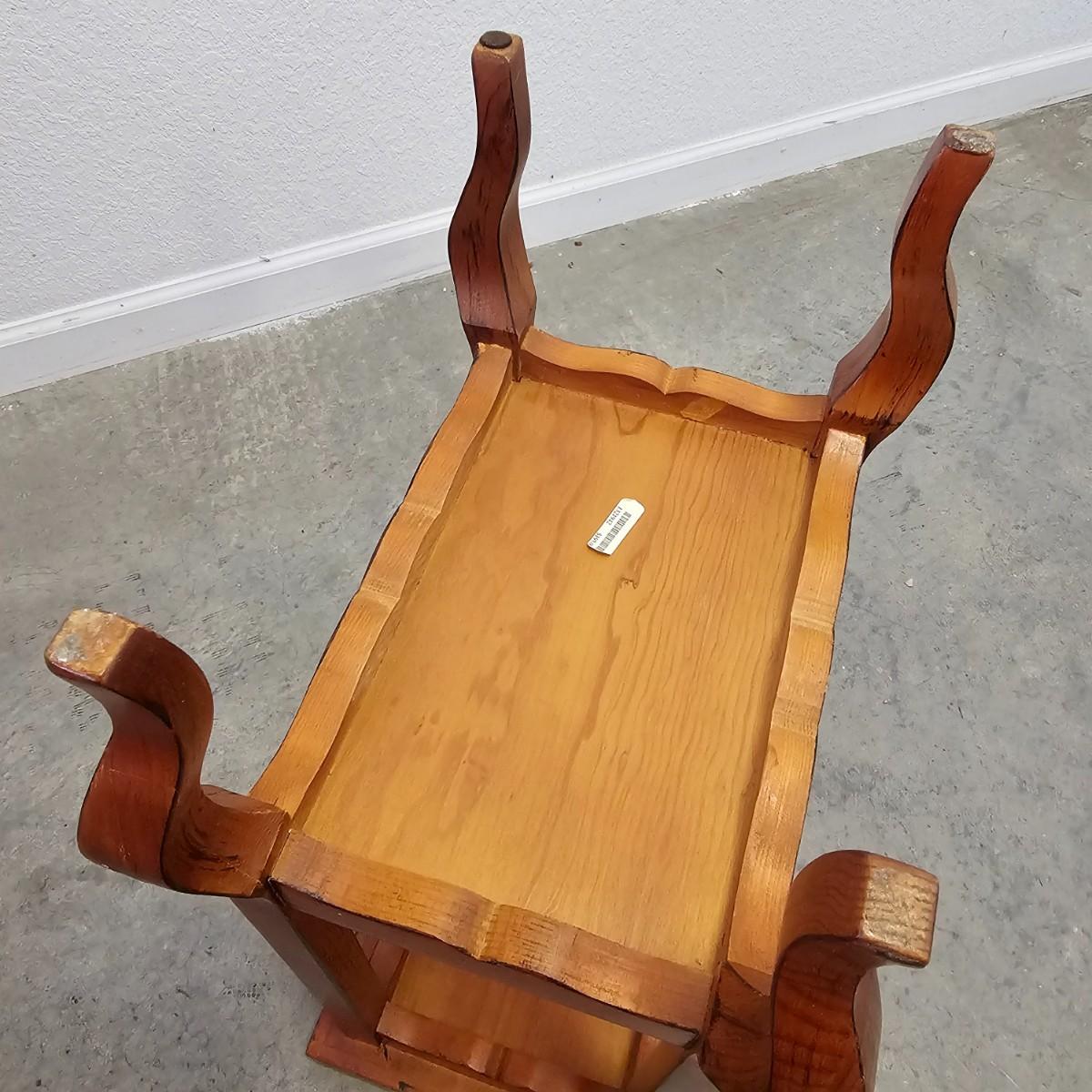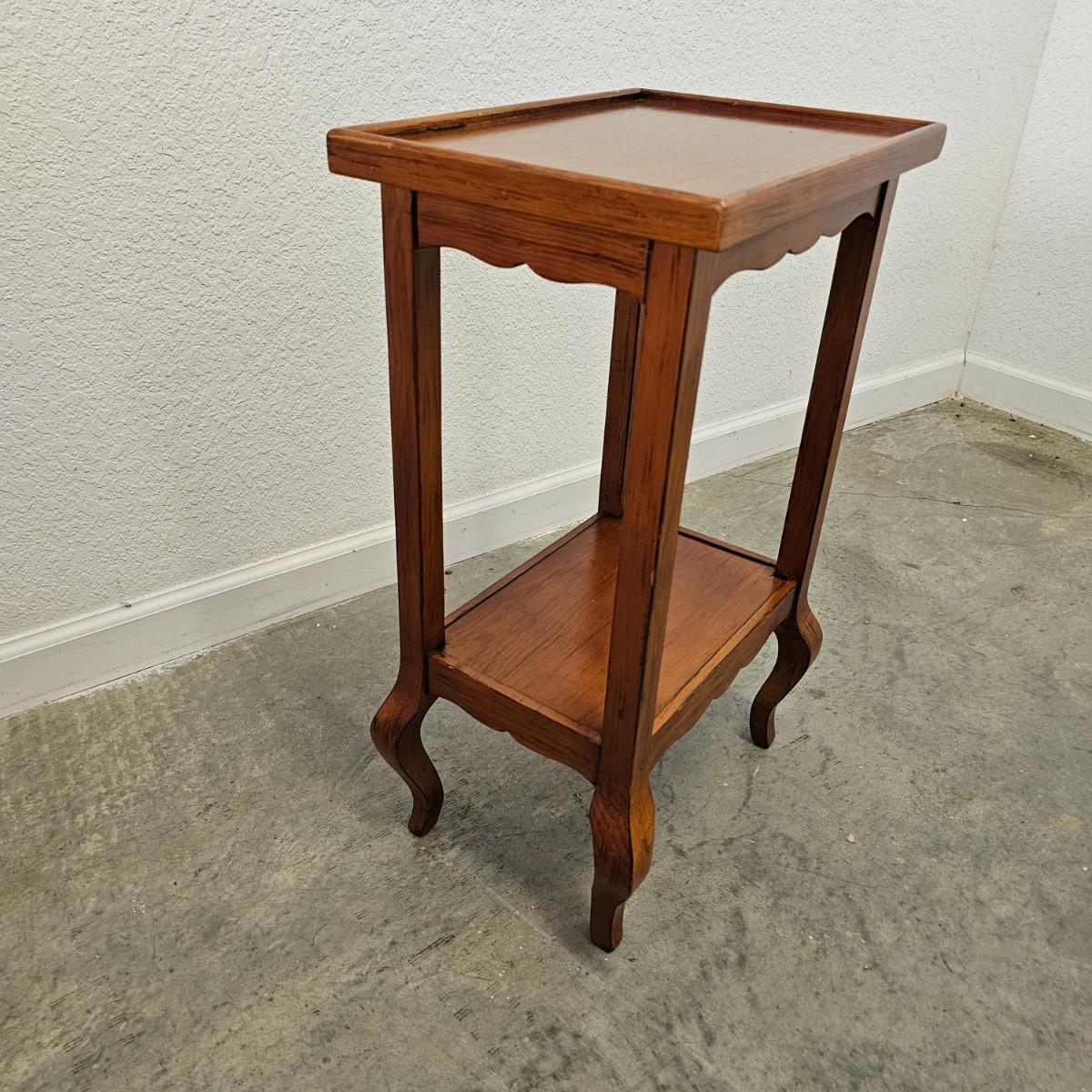 Elegant console style table with recessed top and lower shelf. Unique bow shaped legs at bottom. Table is solid wood, measures 14" x 10" x 22.5" H. Some small blemishes. See photos for details. Local pickup only.