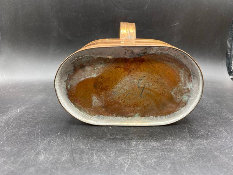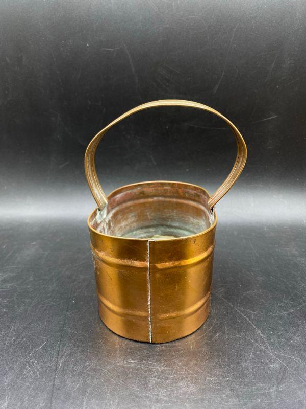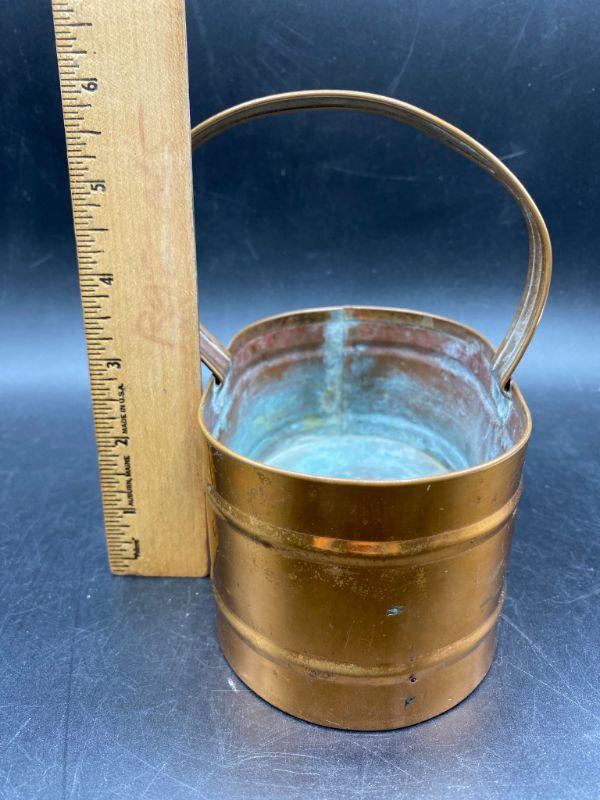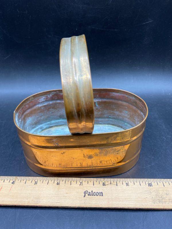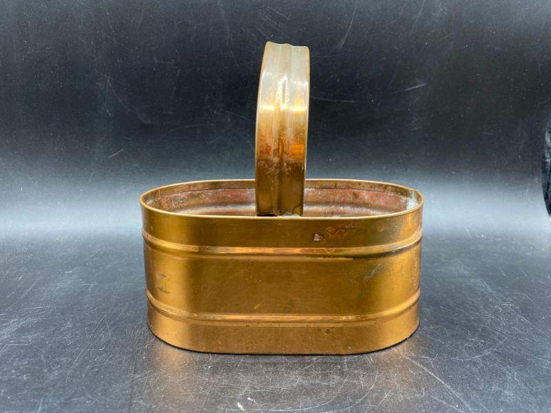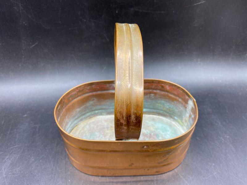 Small decorative copper basket. Oval shaped basket is about 6" wide. Has a handle, but the handle is a little bent, could be straightened. Patina inside. Displays nicely as is or fill with artificial flowers.