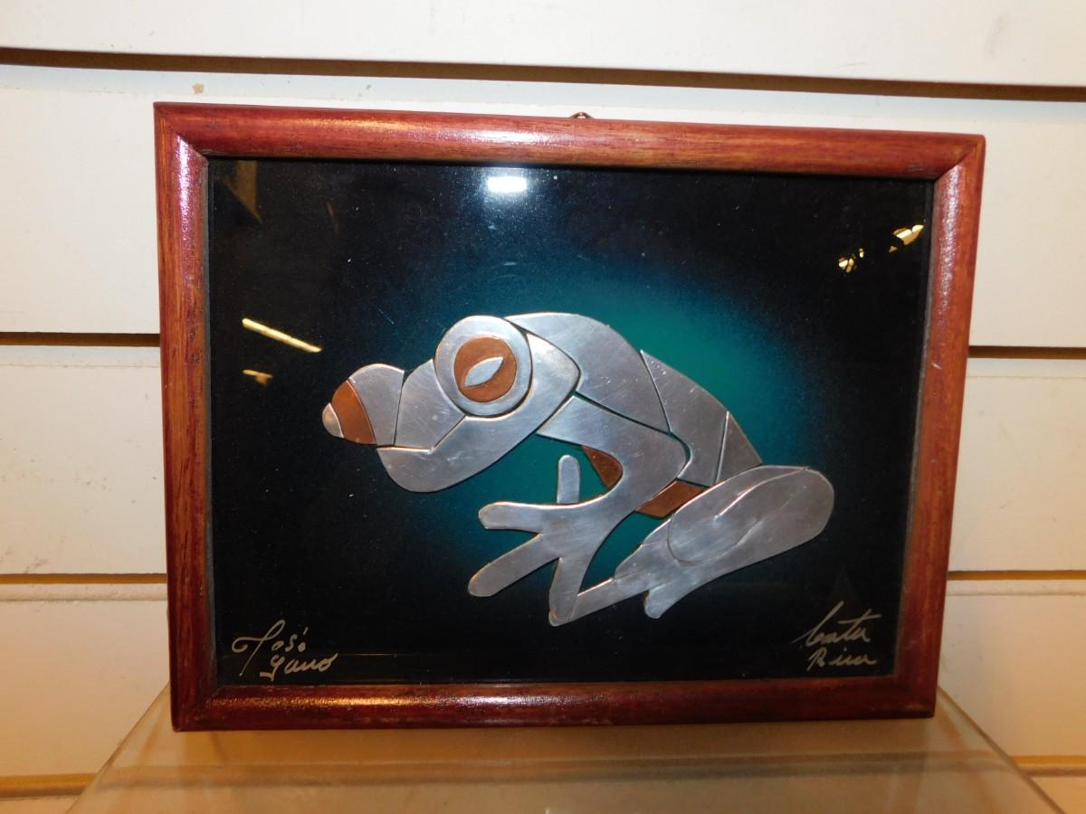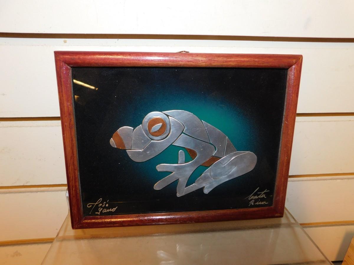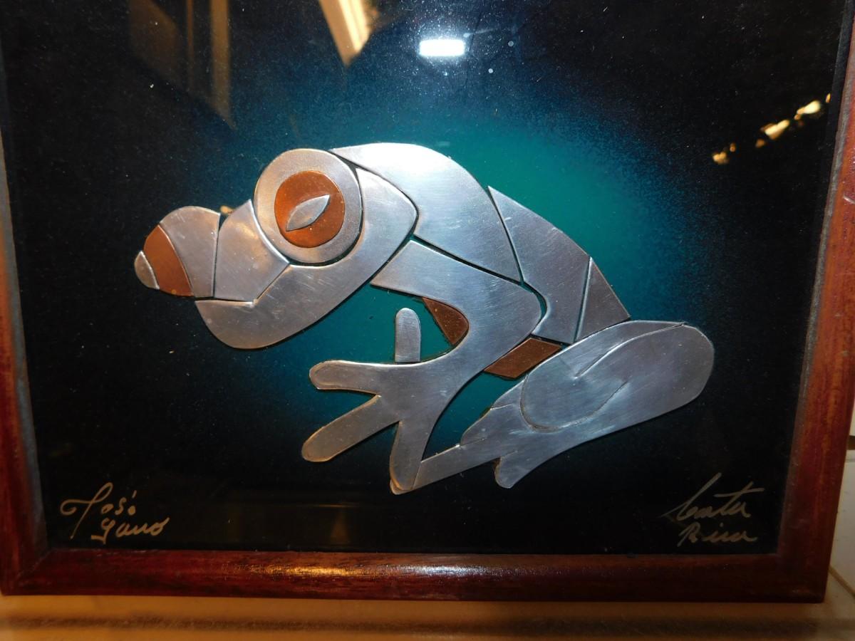 Small Costa Rican Framed & Matted Metal Frog Signed by Artist 8.75”x6.75”