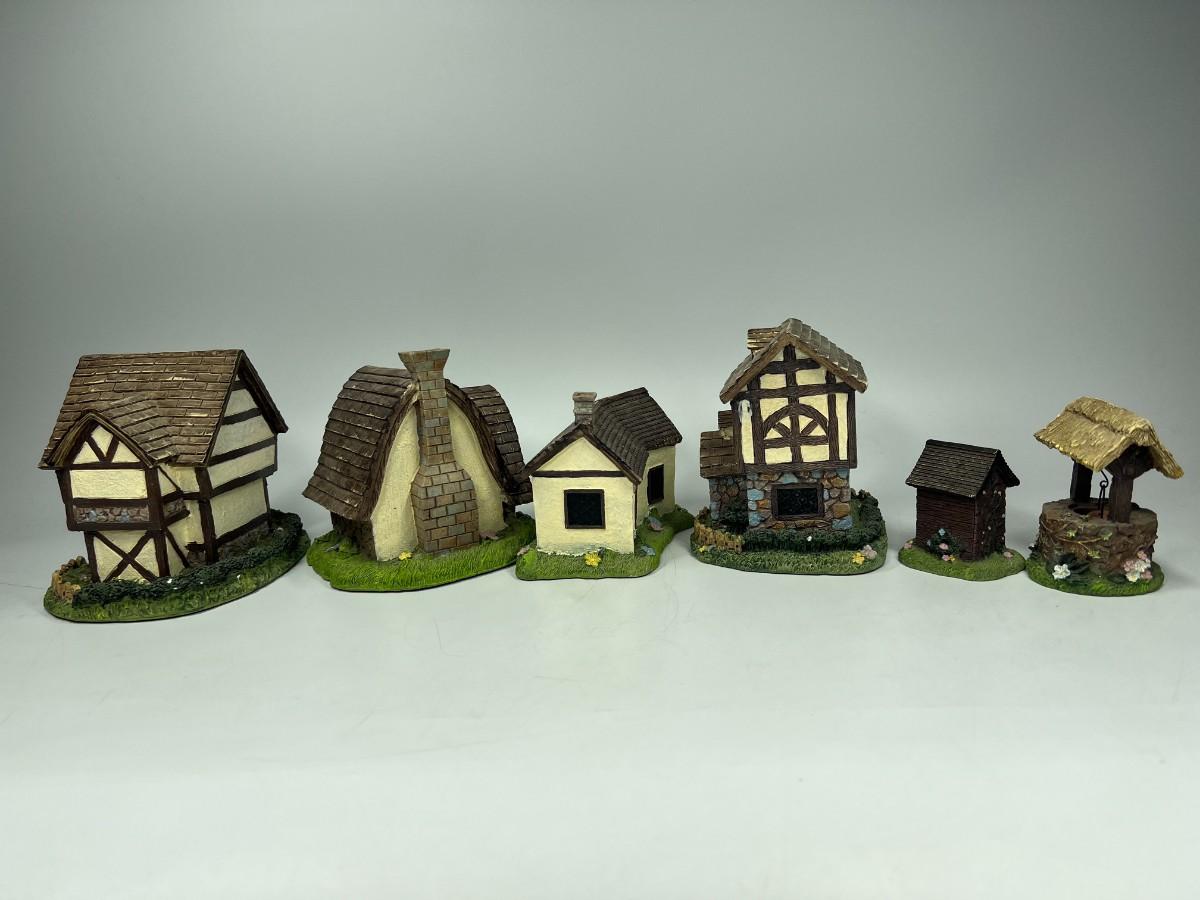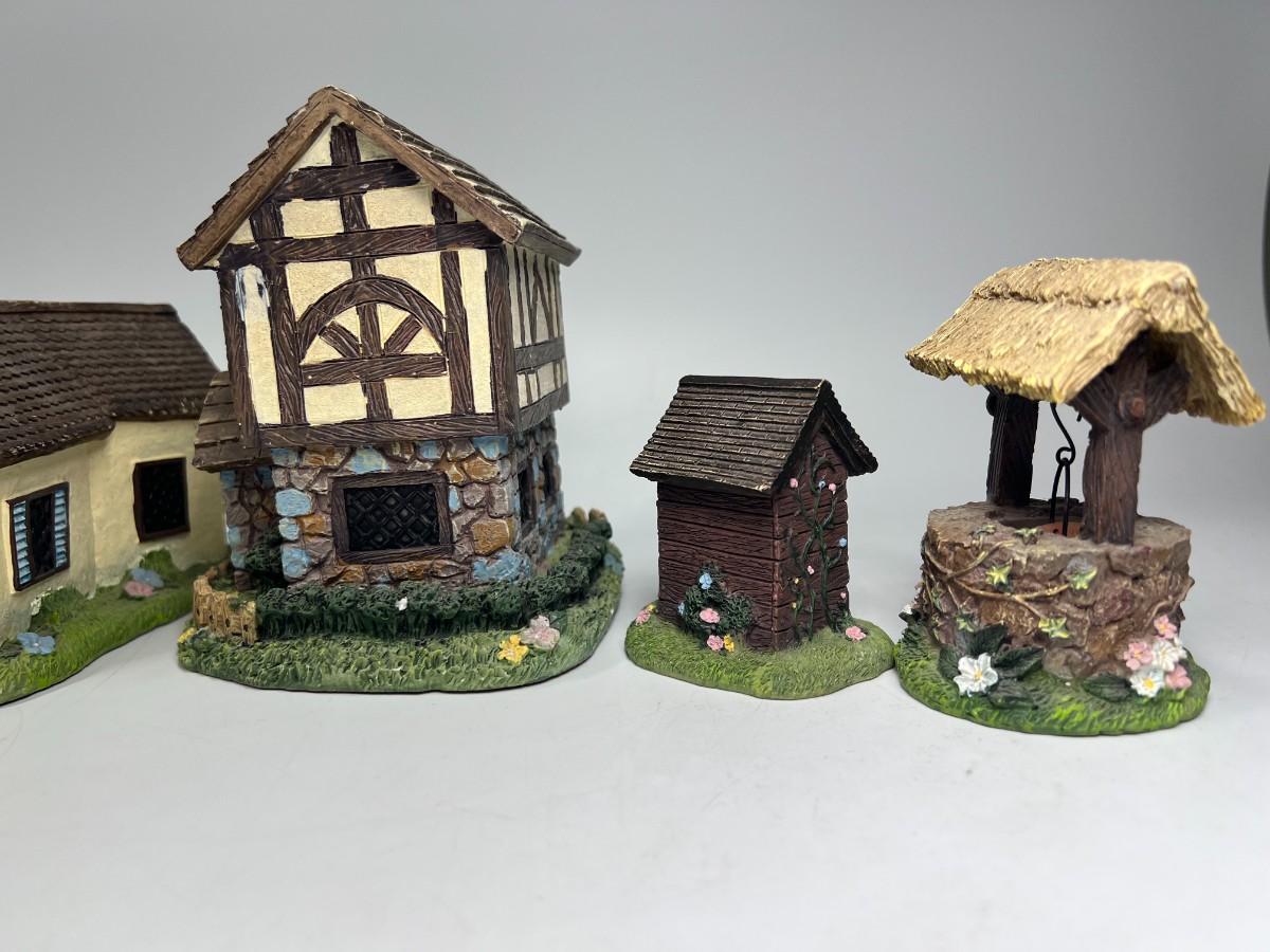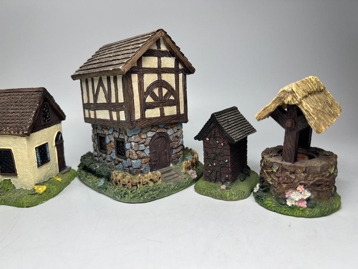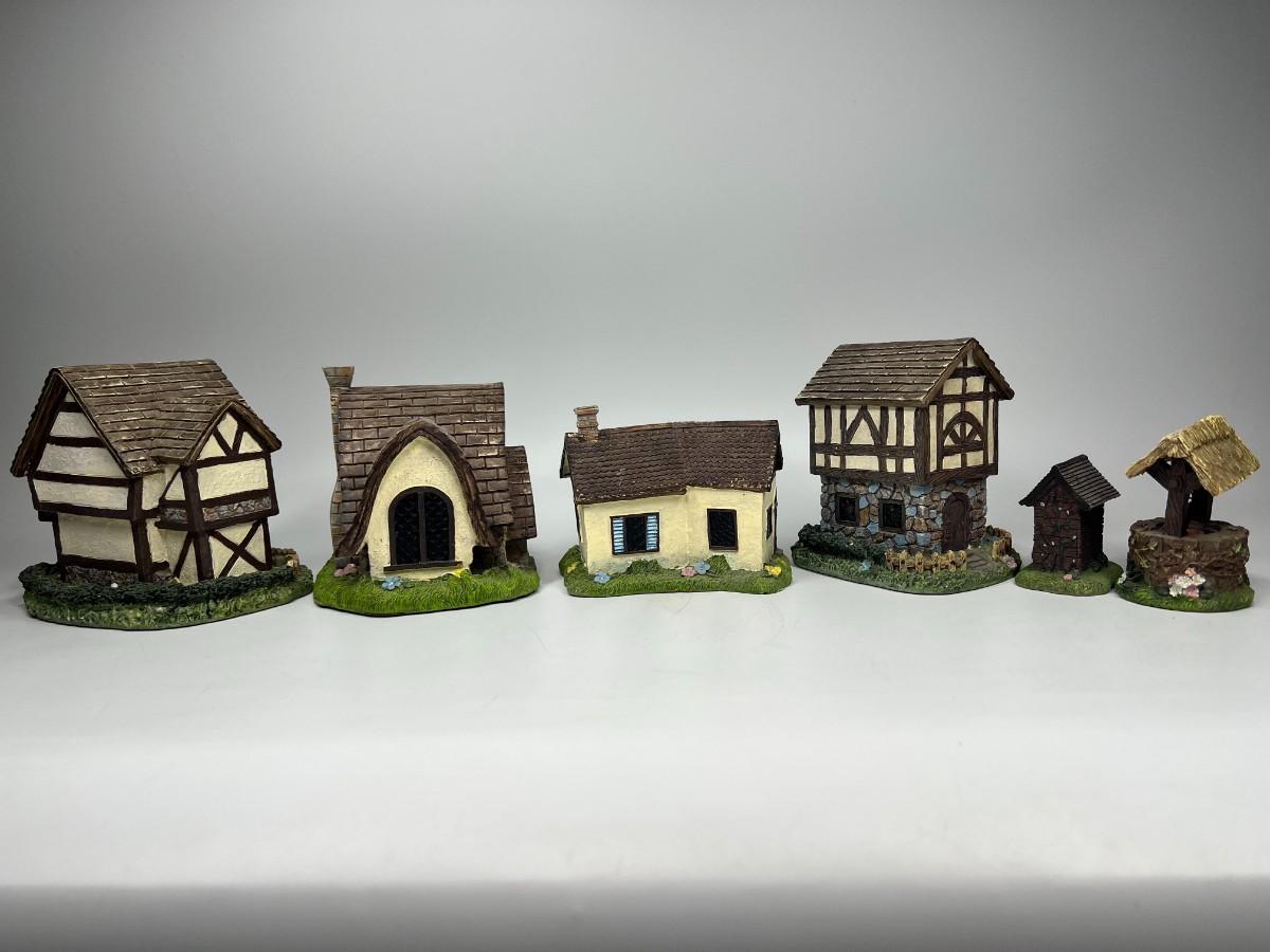 Small Cottage Village Miniature Figurine Lot. Different styles of cottages, a well, and a small outbuilding. Great for the garden or displayed in cabinet. 5" size and smaller.