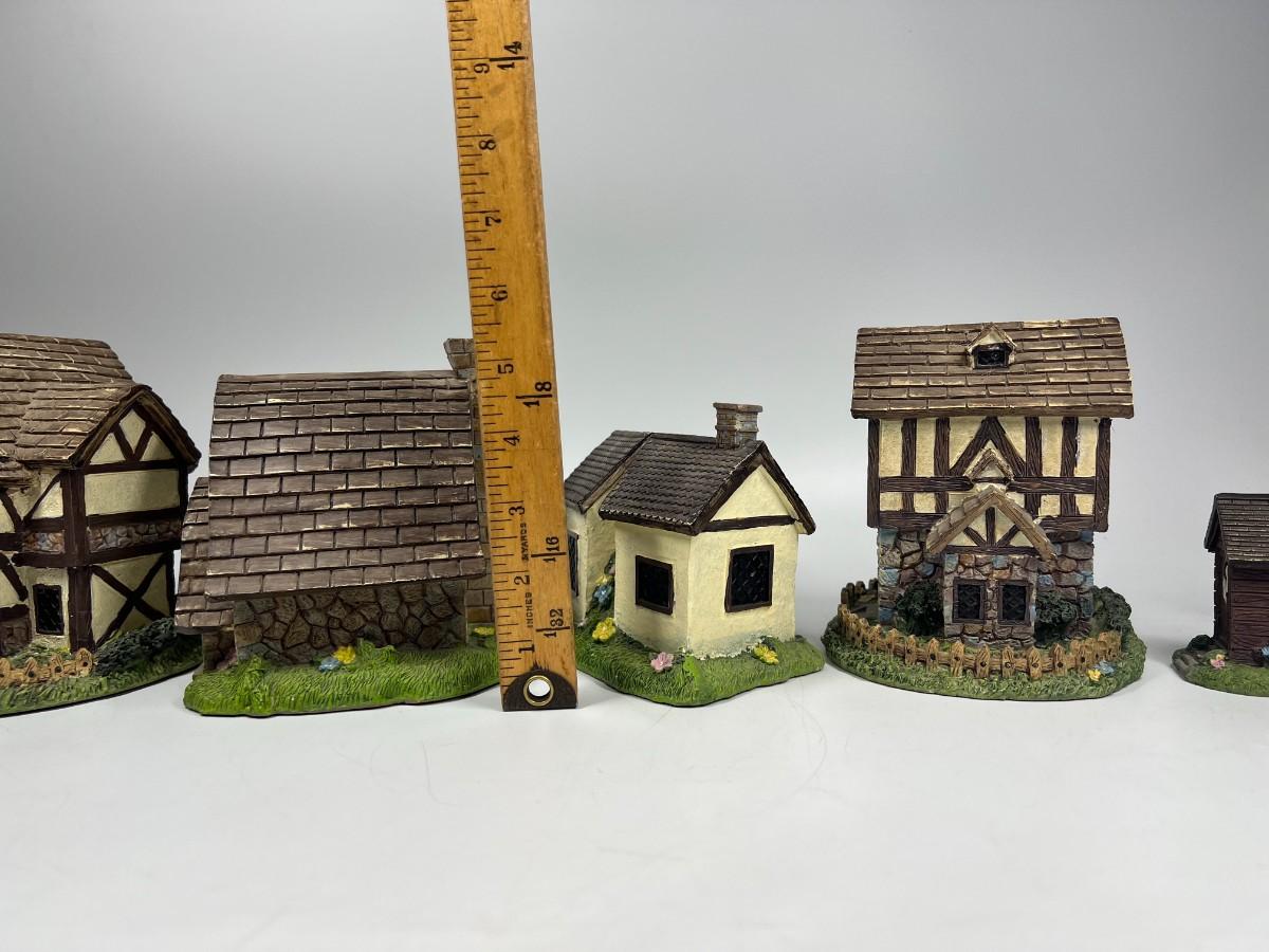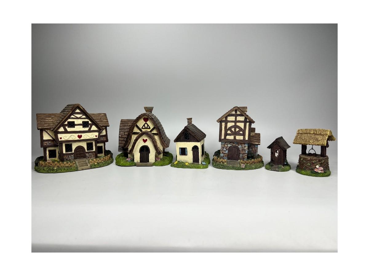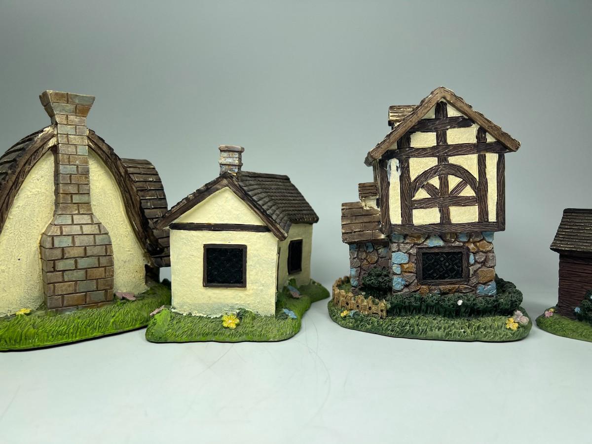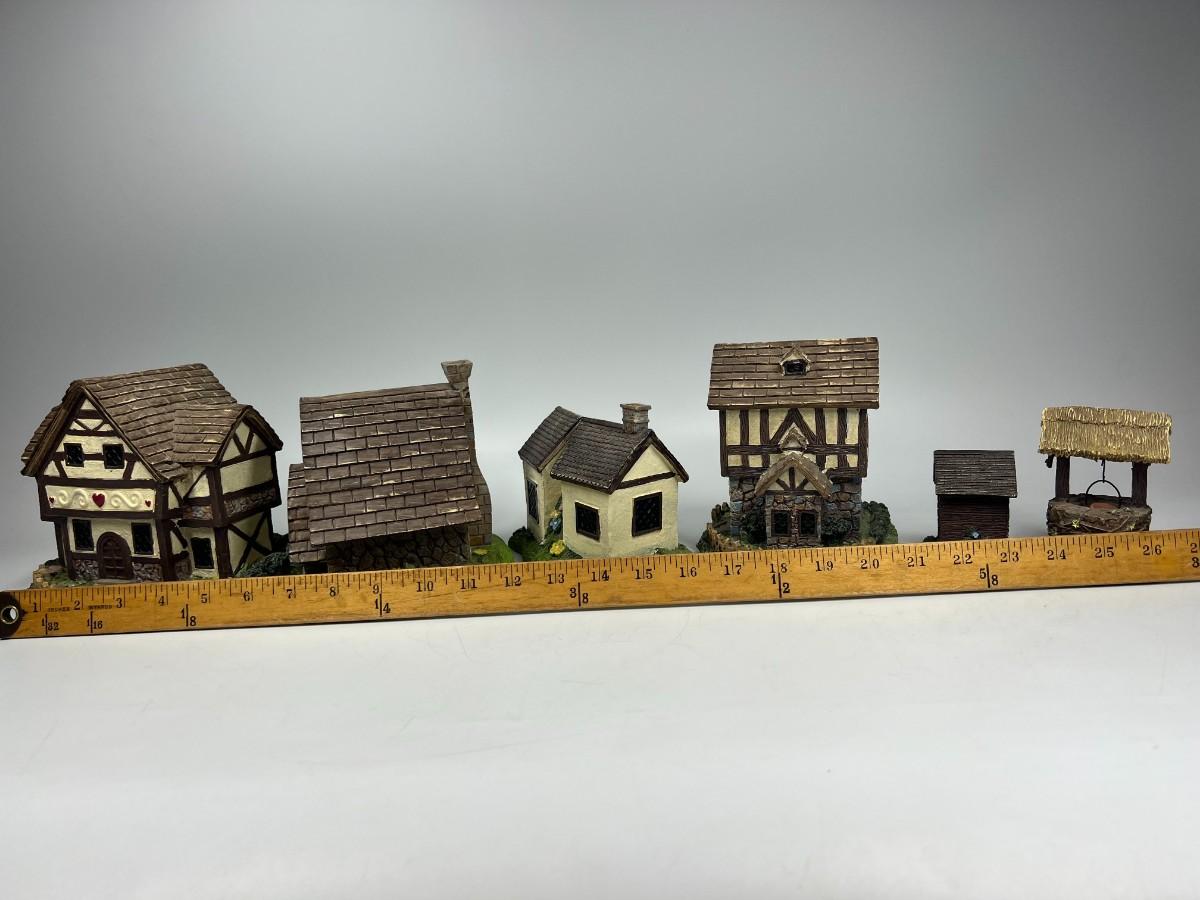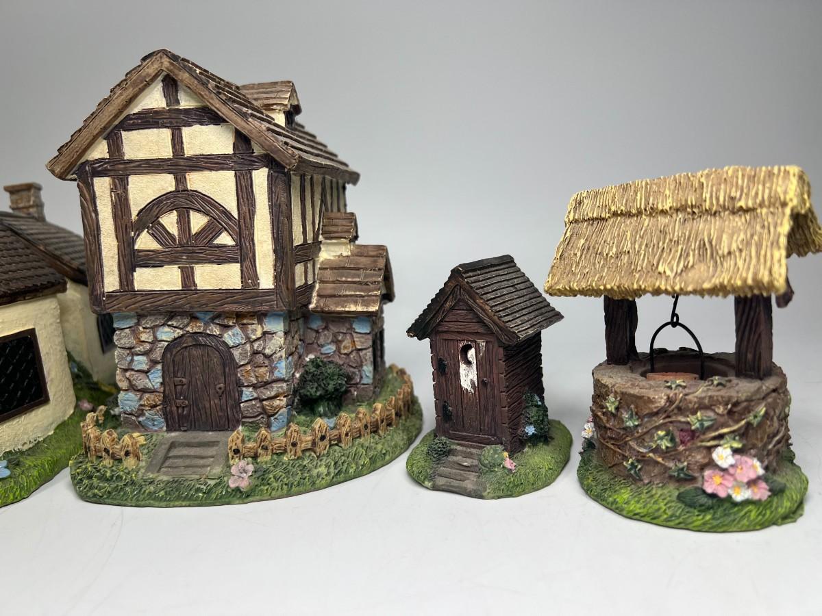 Small Cottage Village Miniature Figurine Lot. Different styles of cottages, a well, and a small outbuilding. Great for the garden or displayed in cabinet. 5" size and smaller.