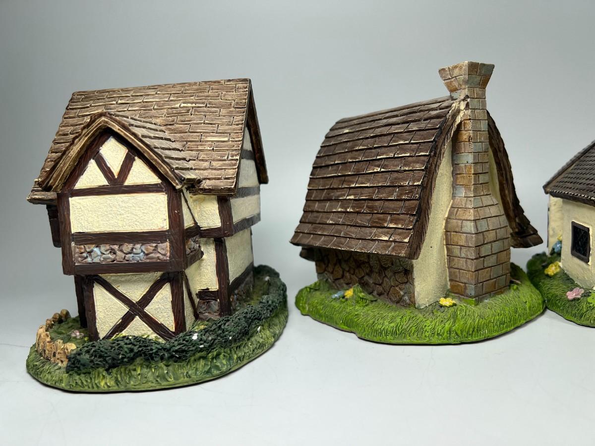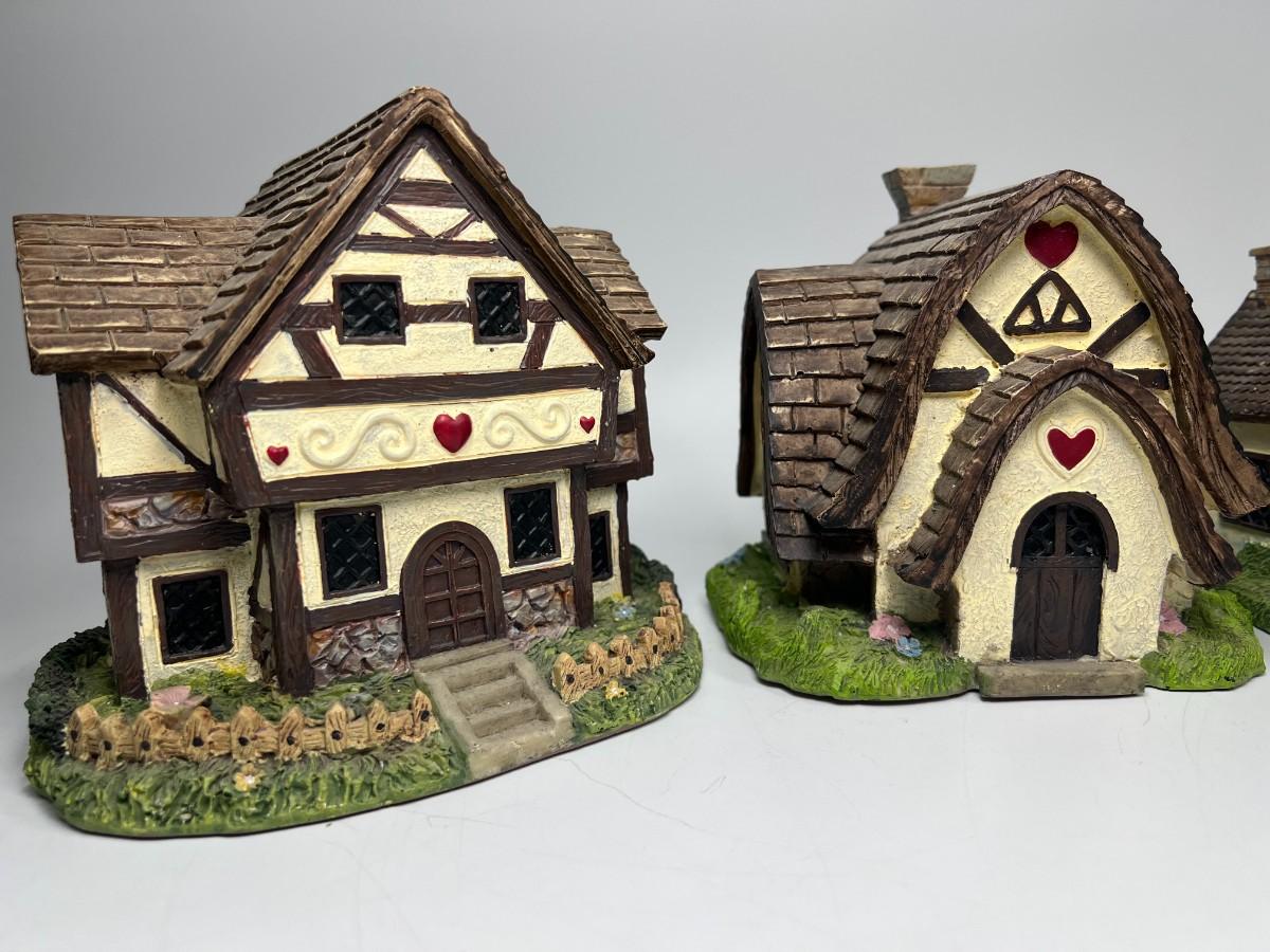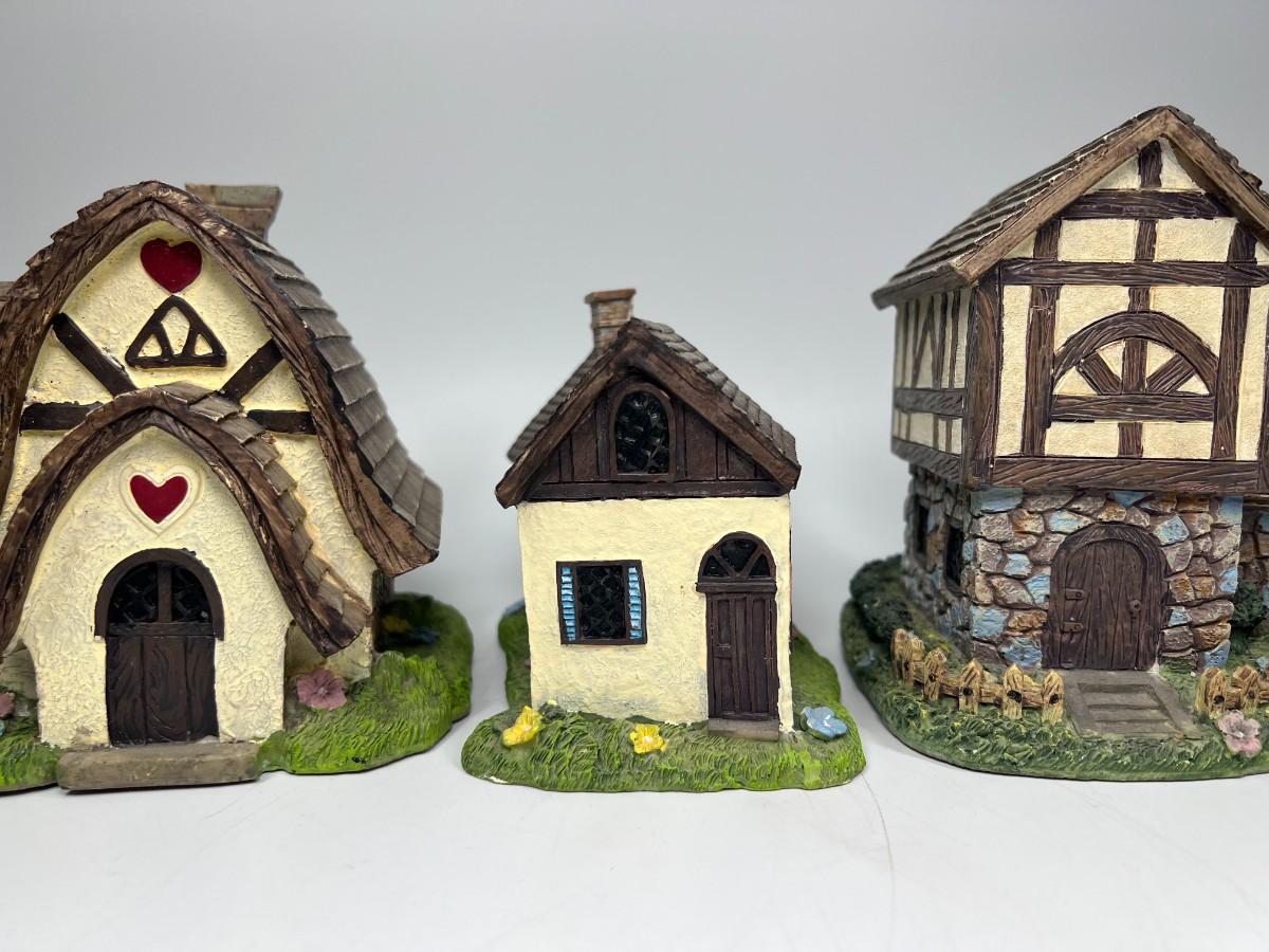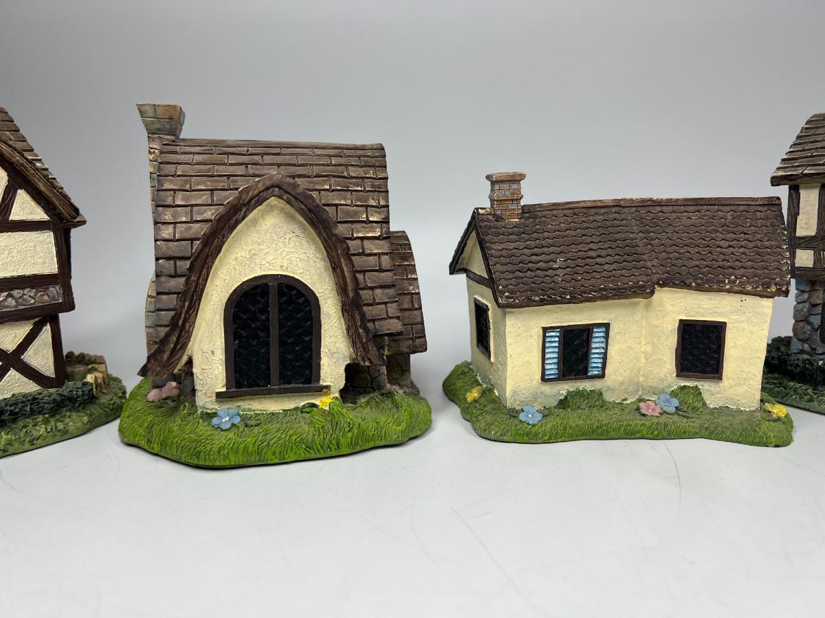 Small Cottage Village Miniature Figurine Lot. Different styles of cottages, a well, and a small outbuilding. Great for the garden or displayed in cabinet. 5" size and smaller.