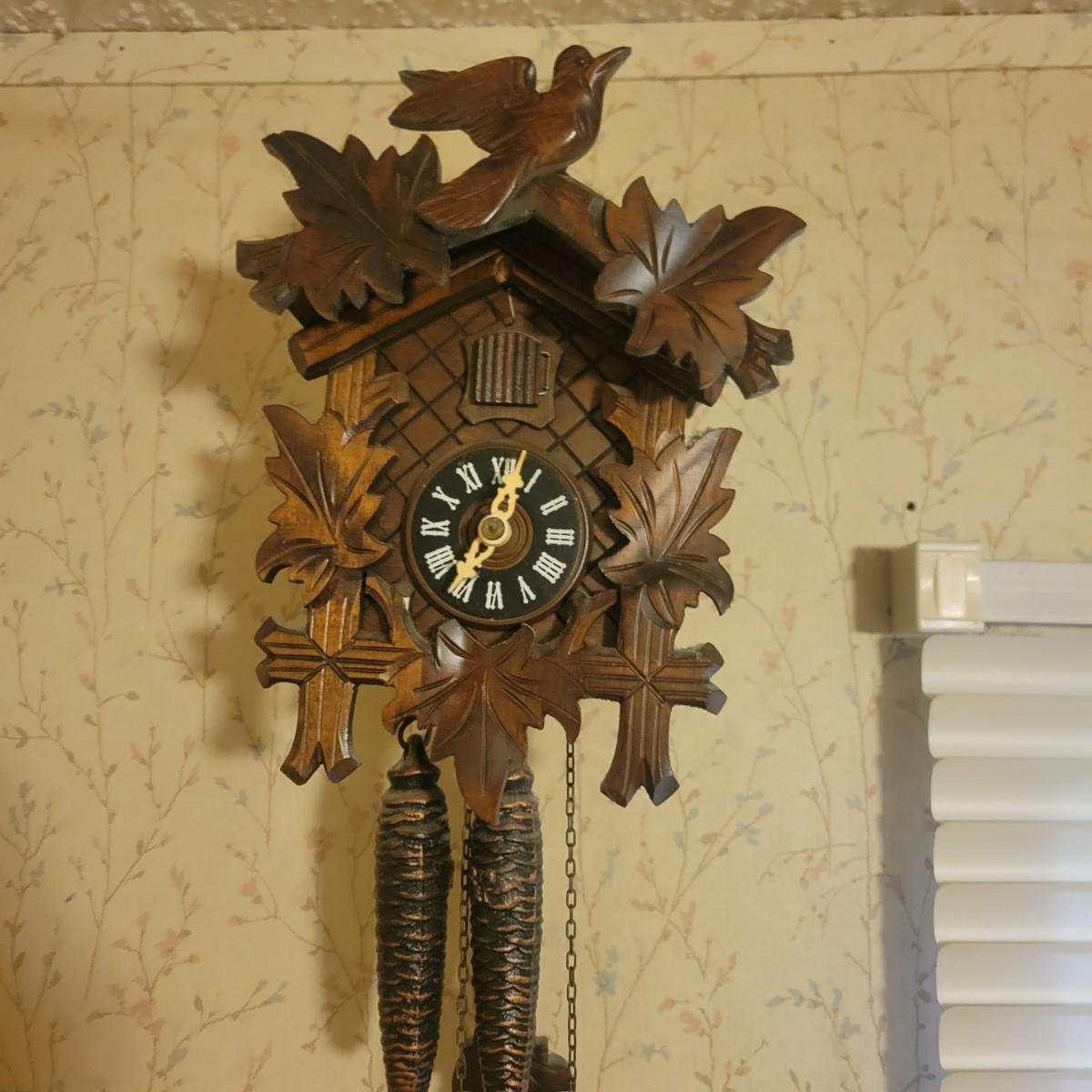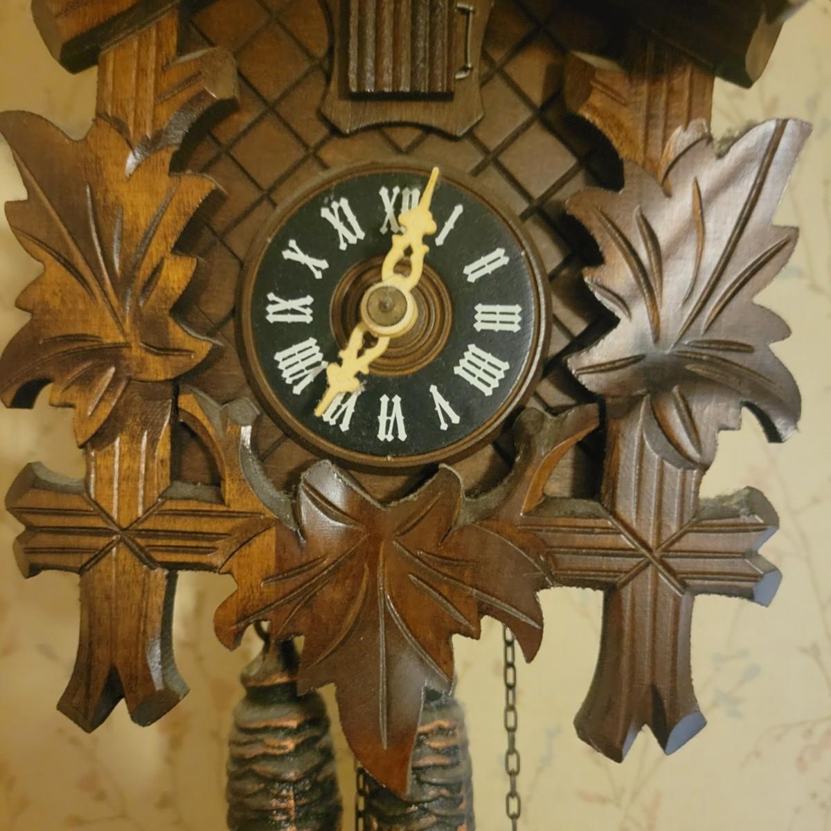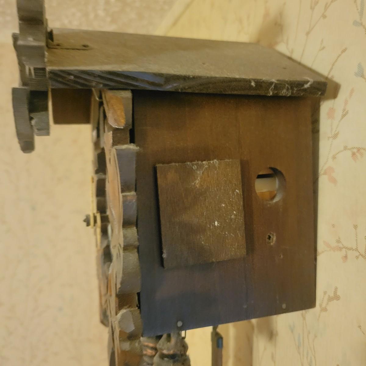This Regula wooden, hand carved cuckoo clock was made in West Germany and is in good condition, but did not work when the cords were pulled. Measures approximately 7" x 5.5" x 13" Shipping available