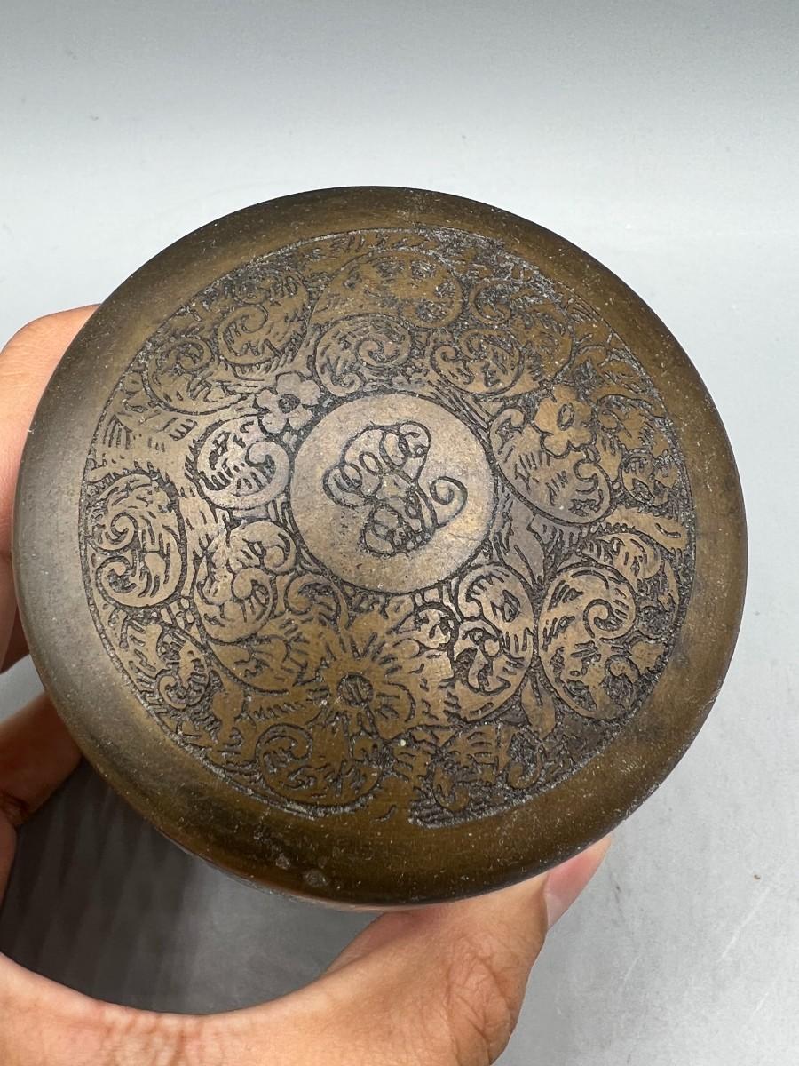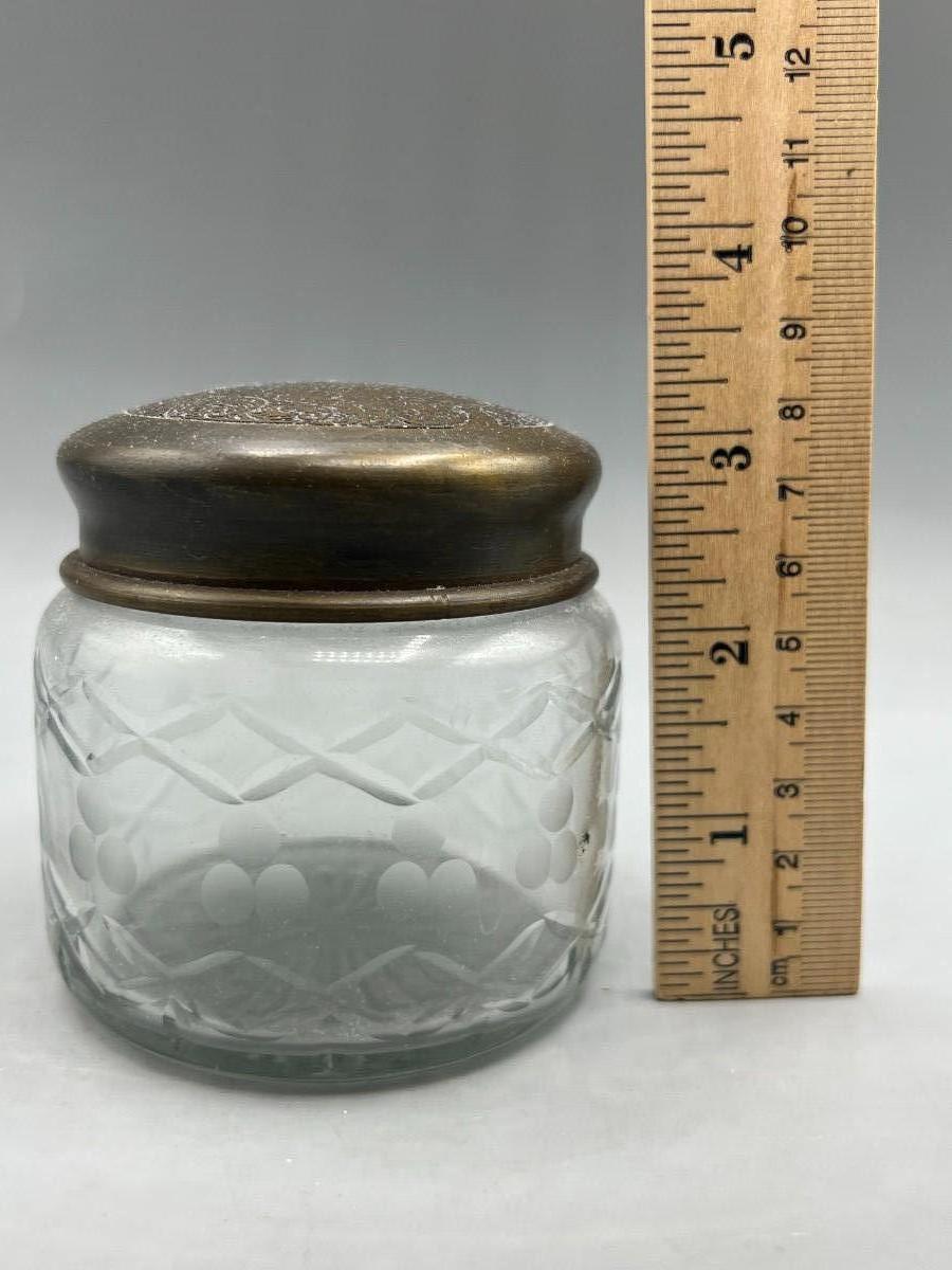 Small Cut Glass Crystal Jar with Etched Metal Lid Trinket Powder Apothecary. Good, aged condition. About 3" size. Lid has an etched floral like pattern with monogrammed center.