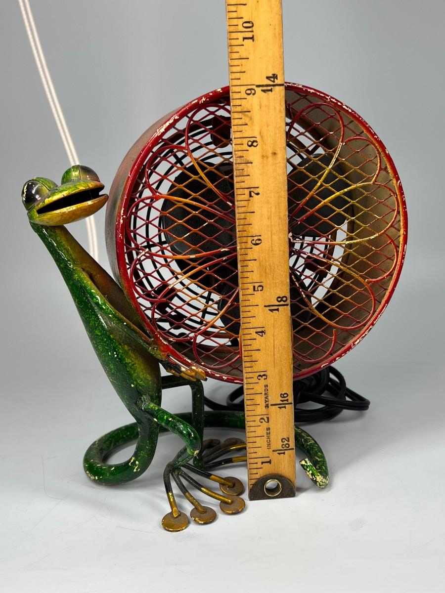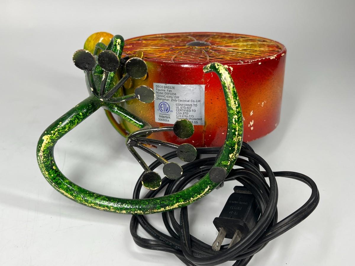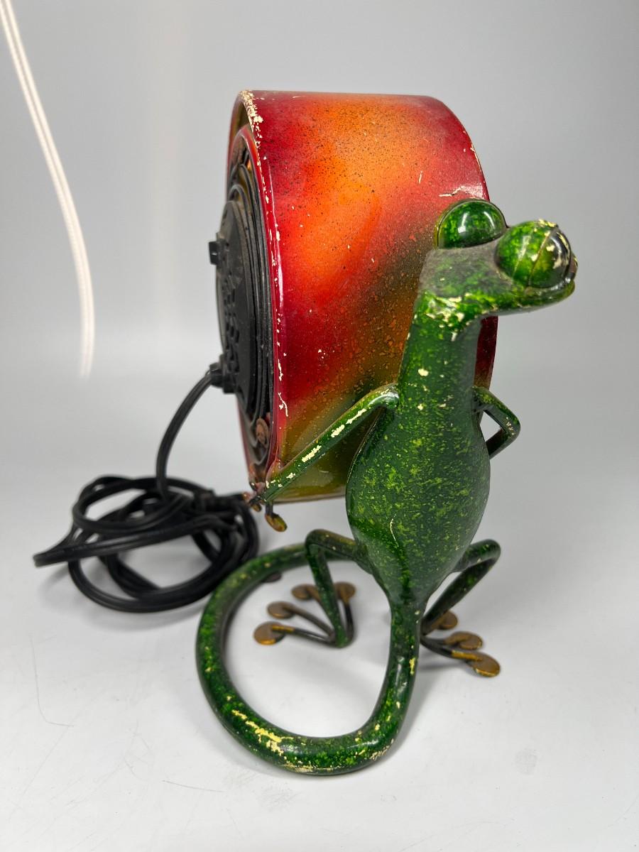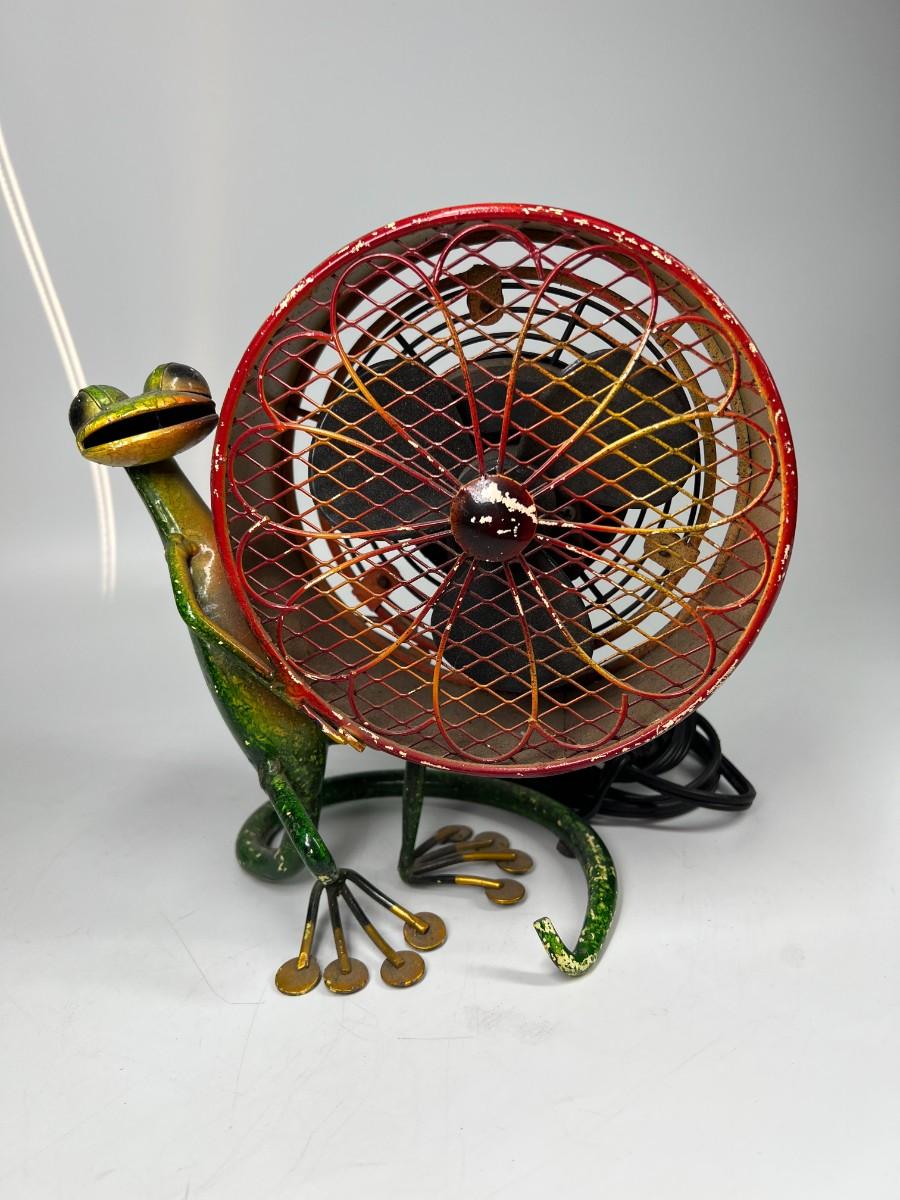 Small Deco Breeze Metal Tropical Gecko Desktop Fan, there is some light wear to the fan, but there is no significant damage and is in overall good useable condition. Has been tested and works perfectly, check pictures for more details and for sizing.