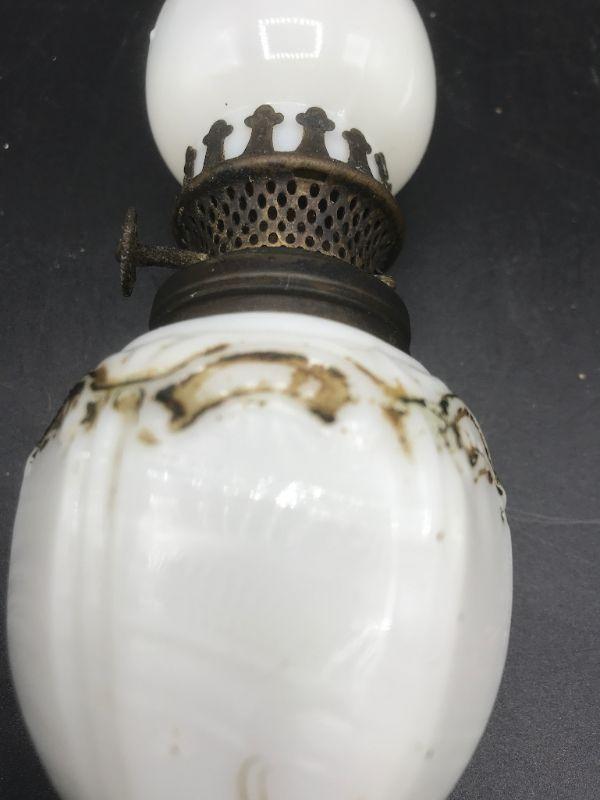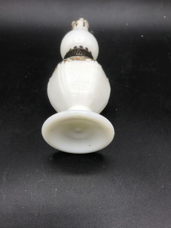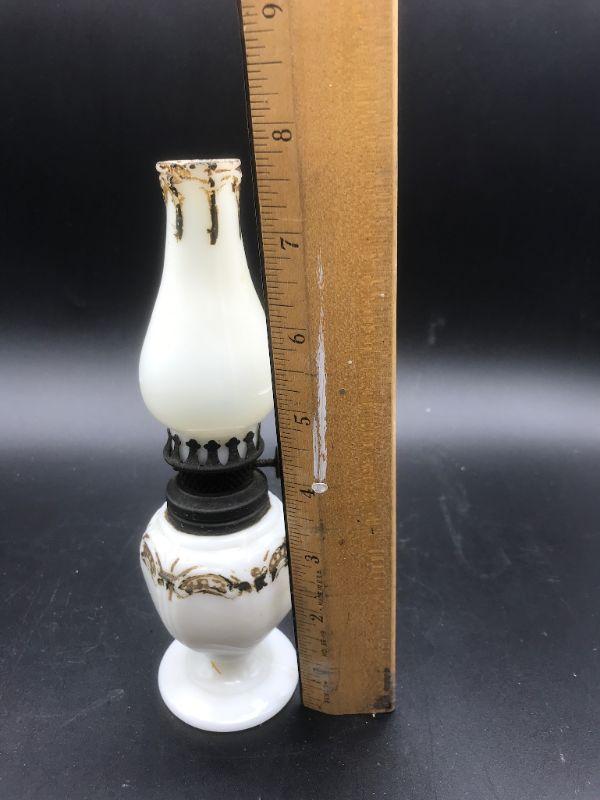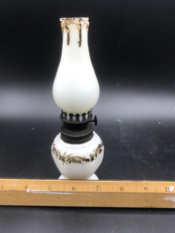 Decorative milk glass oil lamp. Small size, under 8". Had painted details that is now worn.