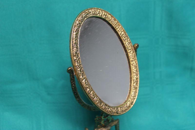 Gold tone table top mirror. Oval shape mirror can be tilted at different angles. Mirror is a little loose and doesn't always like to stay in place. Cherub accents.