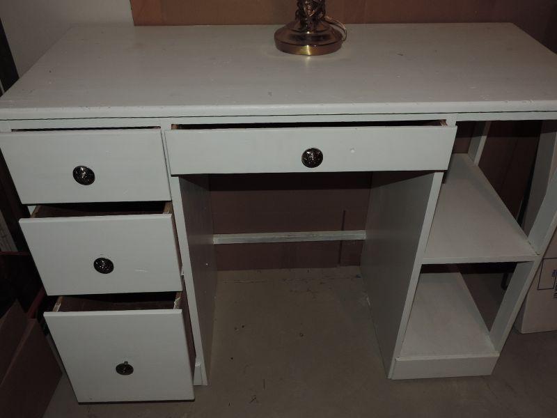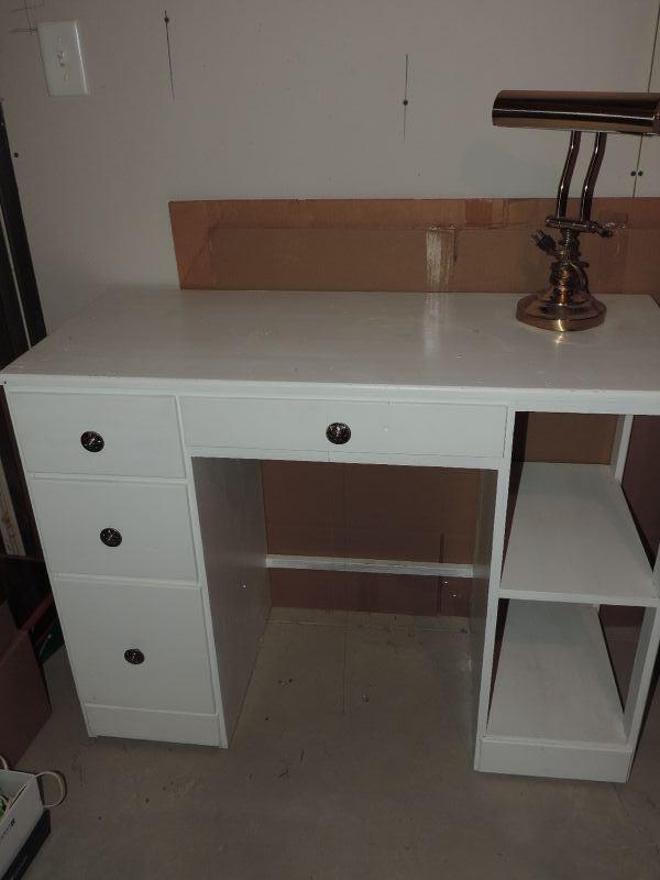 WHITE IKEA DESK WITH 4 DRAWERS AND 2 SHELVES, ADJUSTABLE BRASS DESK LAMP