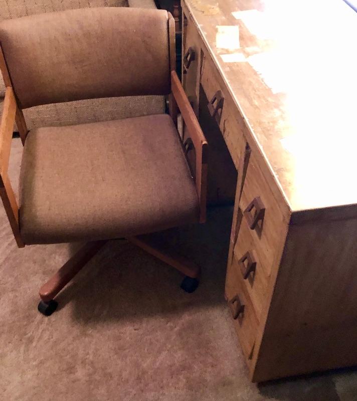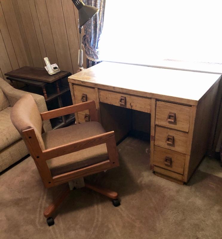 Small wood desk, comes with chair. Desk is older, lots of wear, has a glass top.