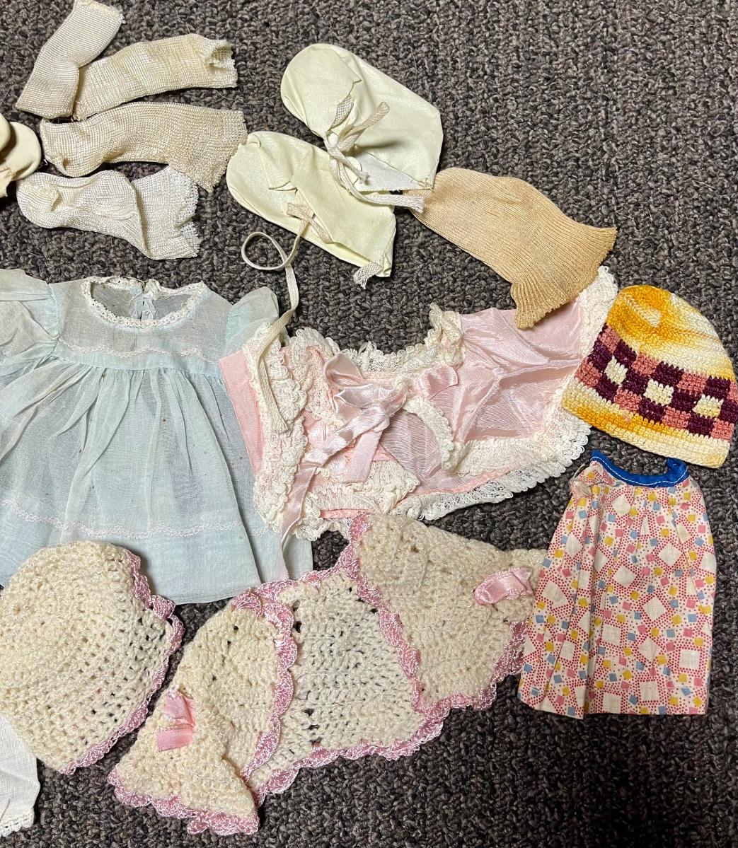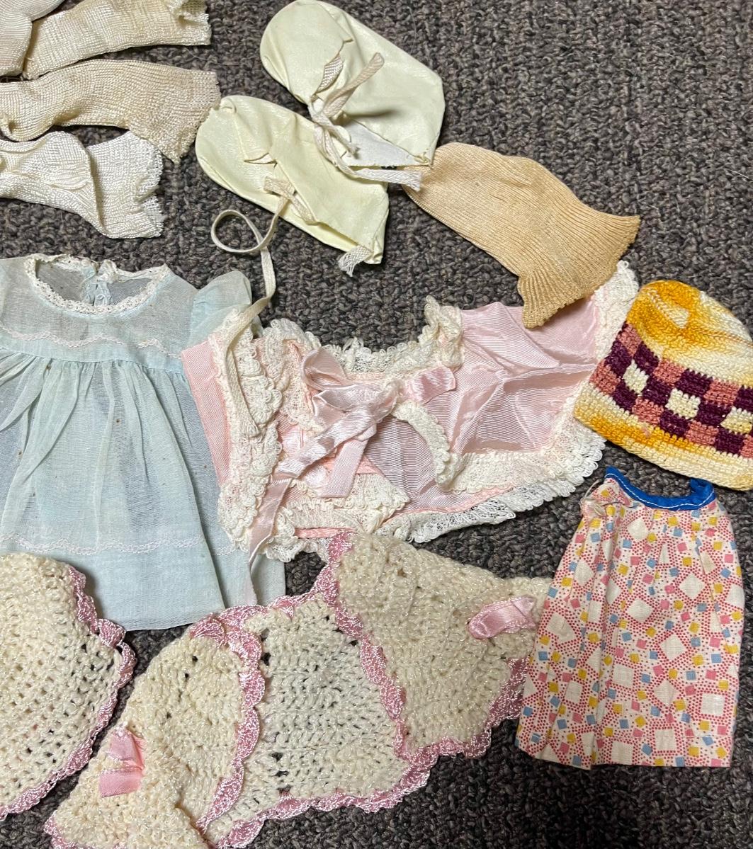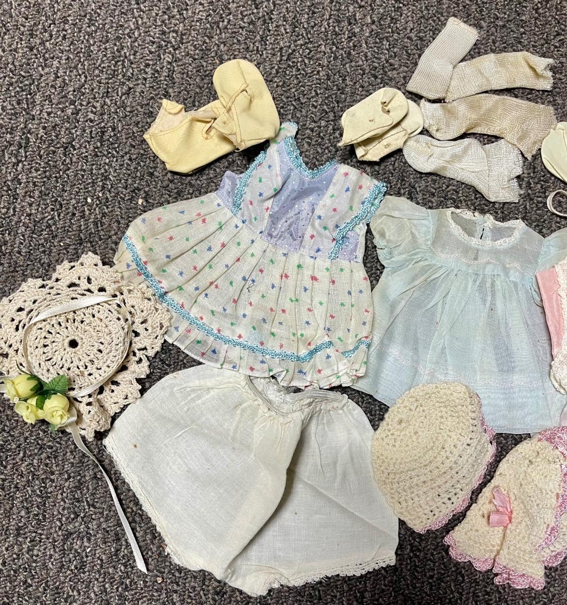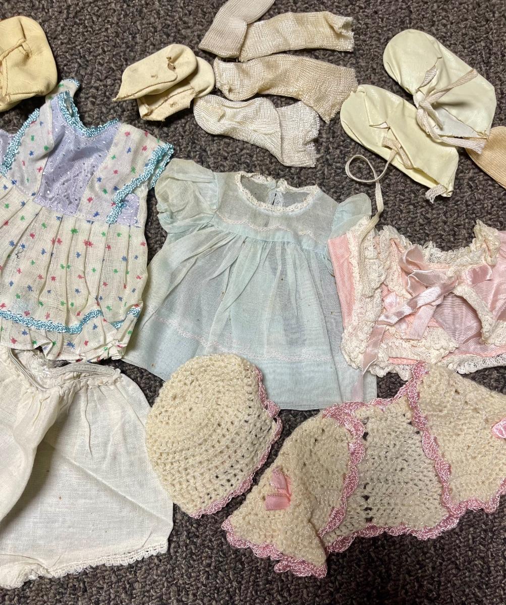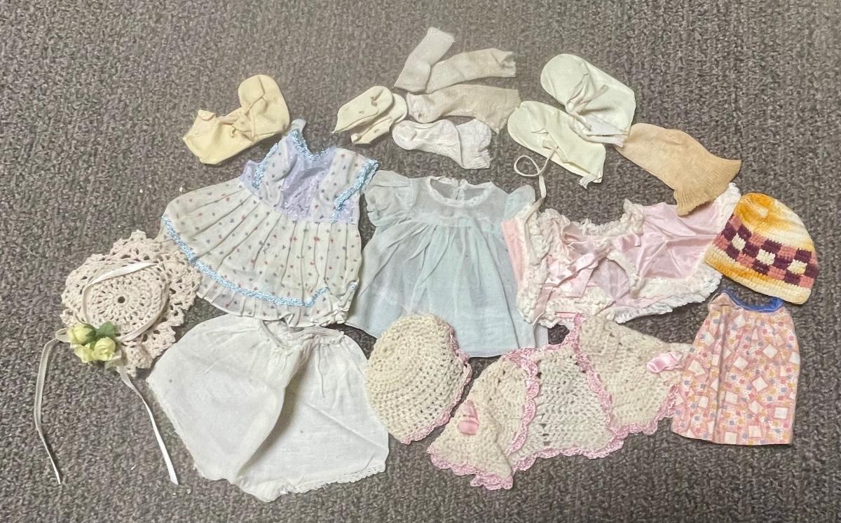 Small doll size clothing dresses, socks shoes, hats, sweater, etc