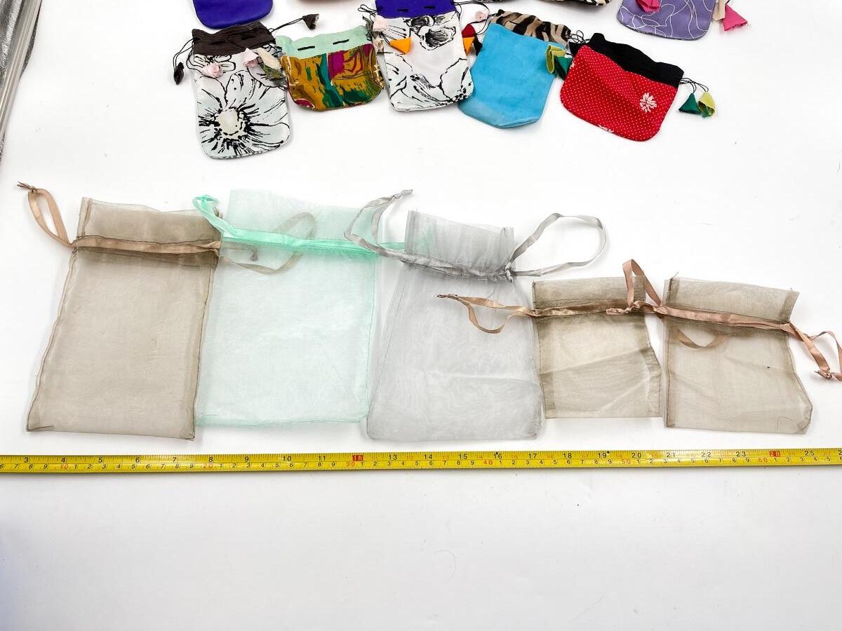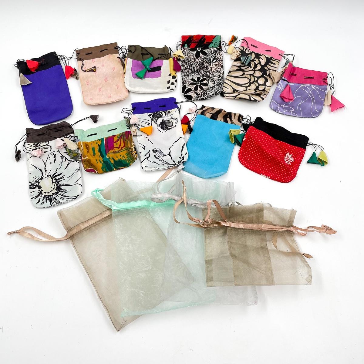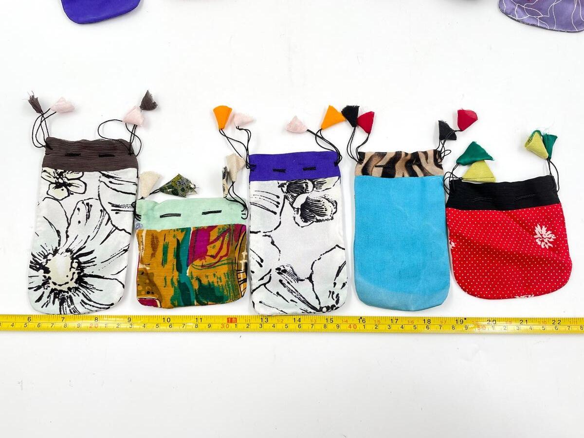 Cute assortment of drawstring bags, cloth ones appear to be homemade.