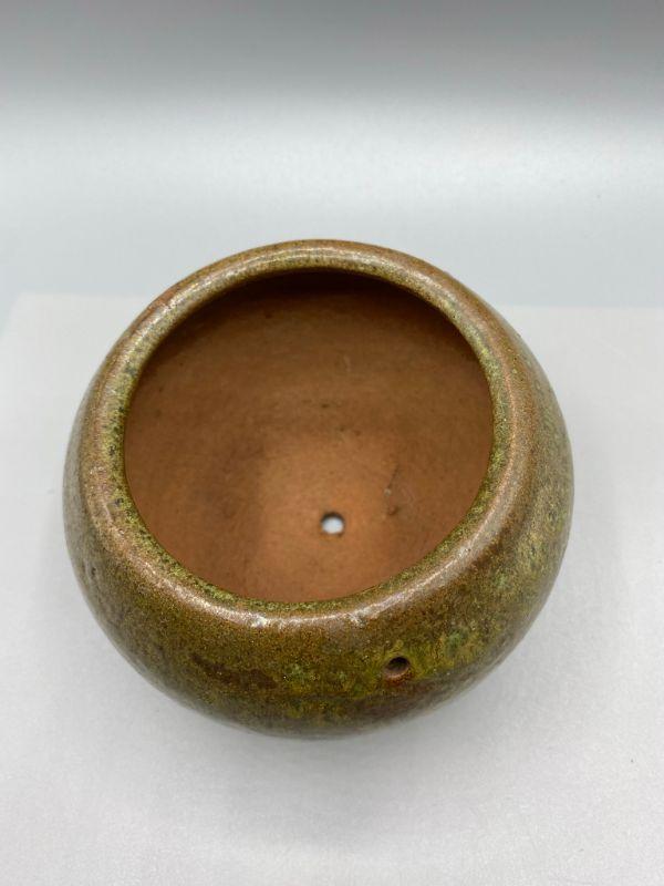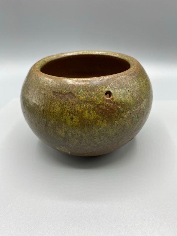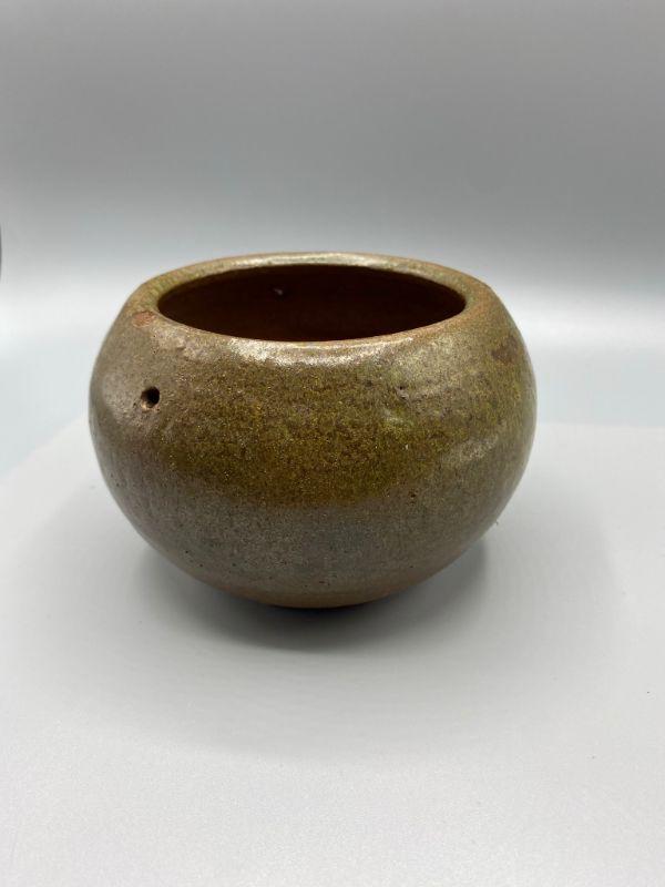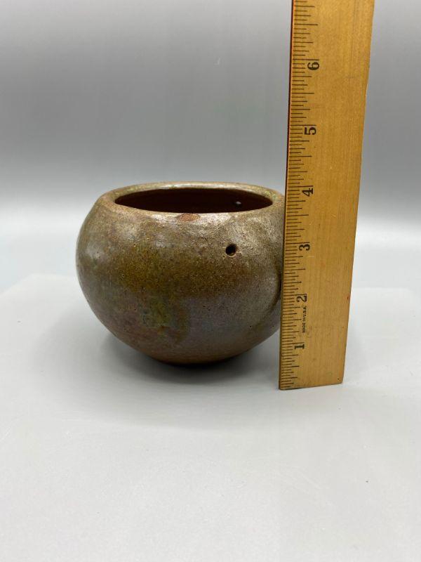 Small pottery planter pot. Has a dripware speckle look to the finish. Good condition, a very small chip along edge, blends with finish. Has a drain hole in the bottom and small holes near the top, like it was made to be hungup.