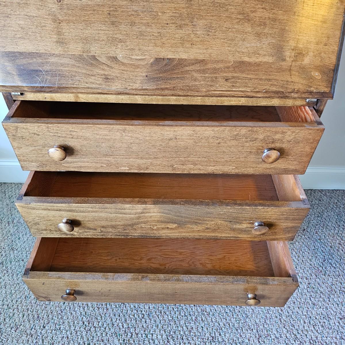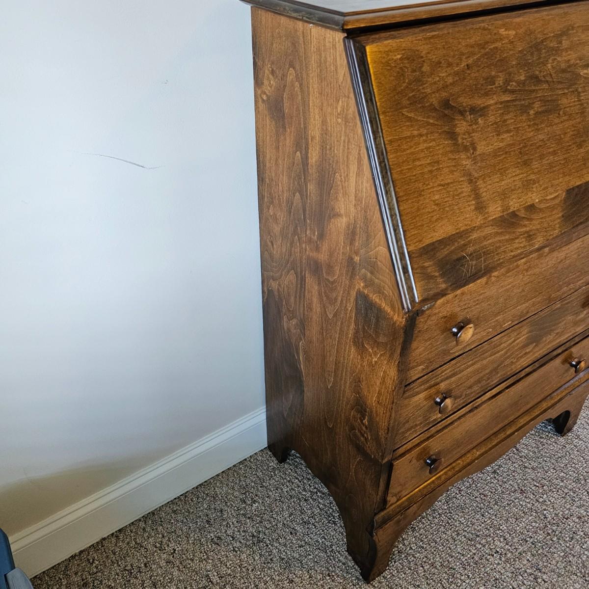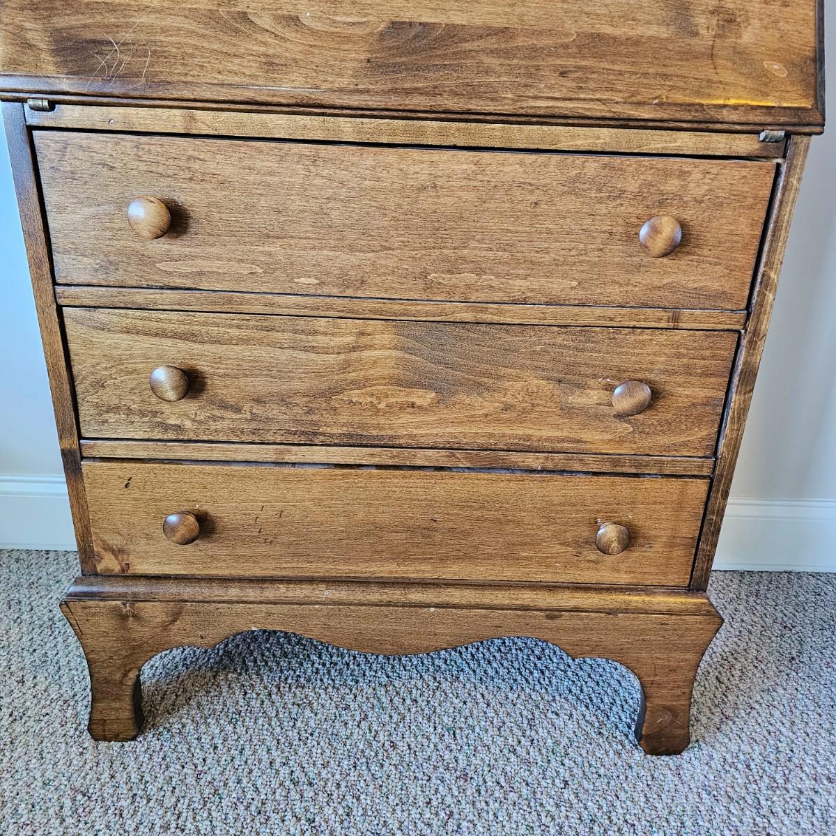 Compact drop front desk with three storage drawers. Front opens to reveal small cubbies inside for paperwork, stamps, etc. Item measures 15.5" x 29" x 40"H, is mostly pine with plywood back. A few small blemishes. See photos for details.