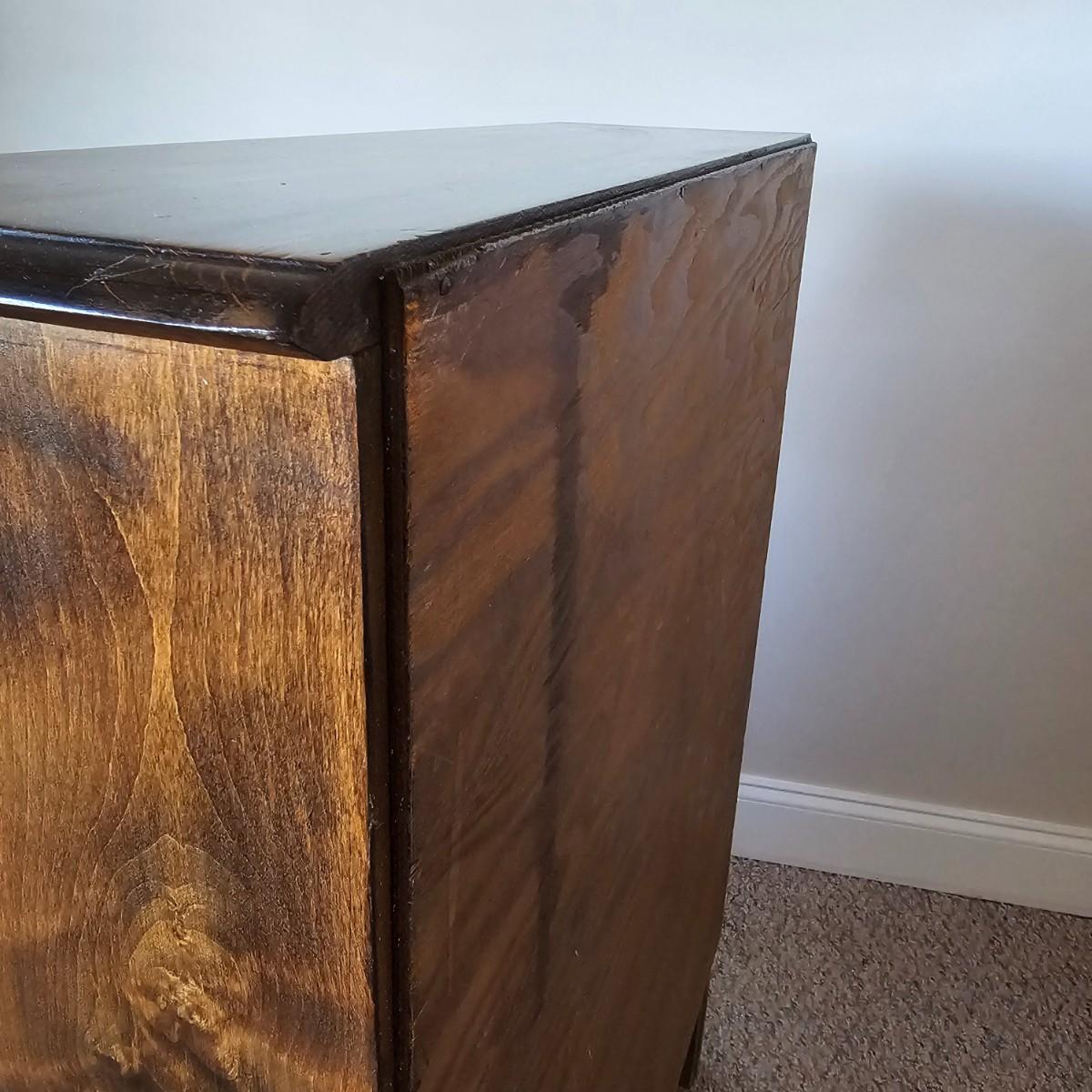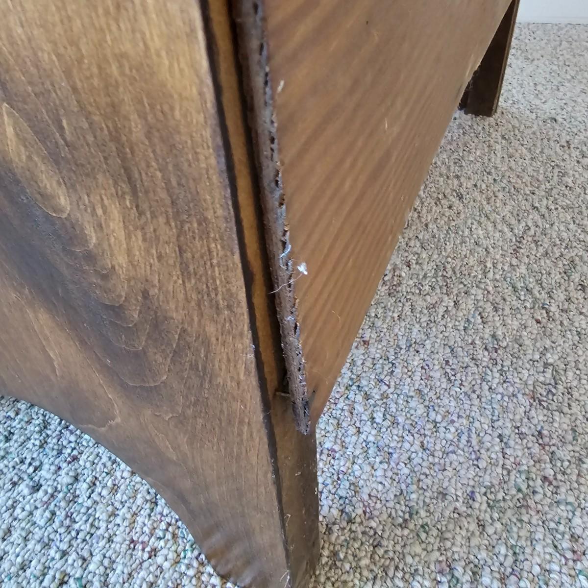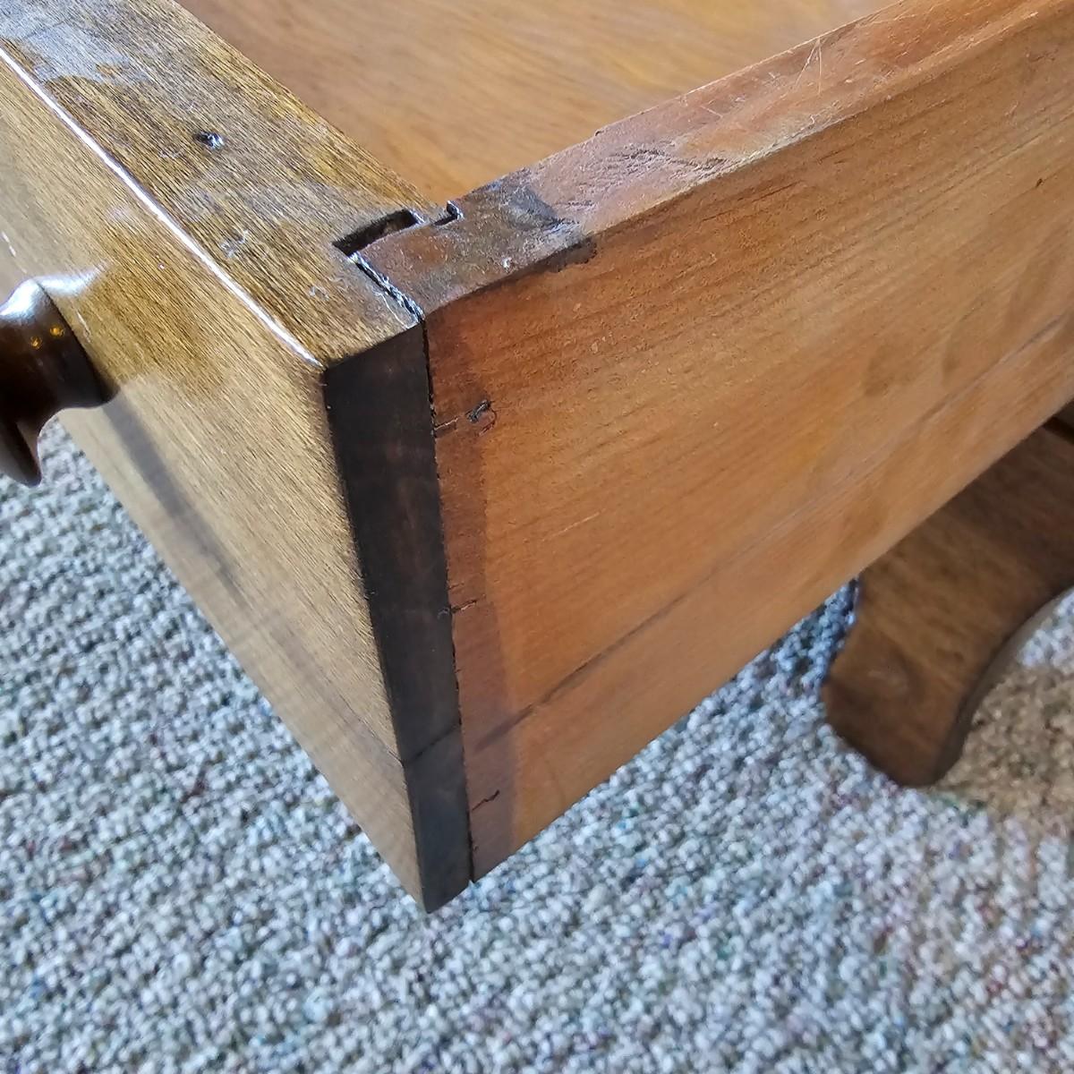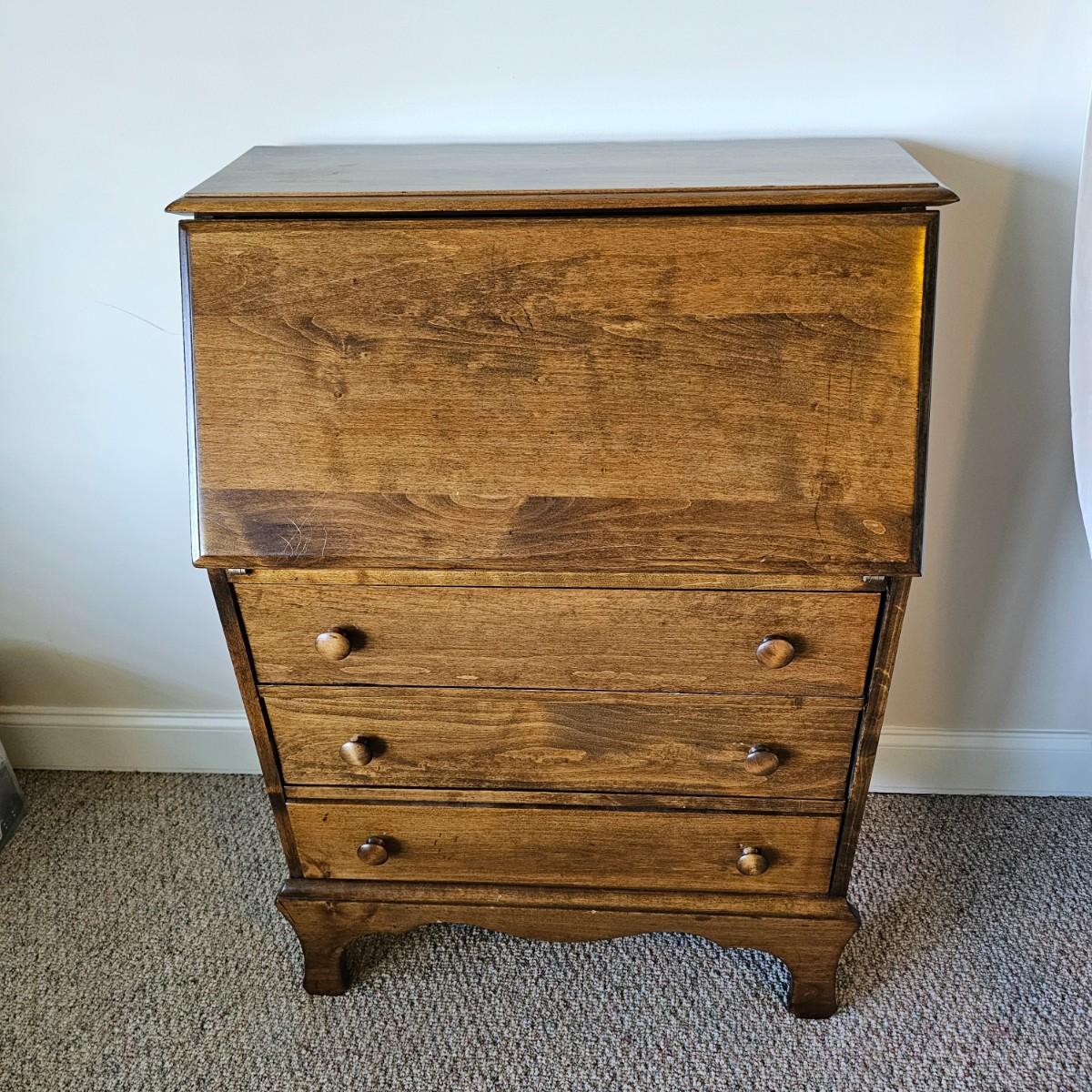 Compact drop front desk with three storage drawers. Front opens to reveal small cubbies inside for paperwork, stamps, etc. Item measures 15.5" x 29" x 40"H, is mostly pine with plywood back. A few small blemishes. See photos for details.