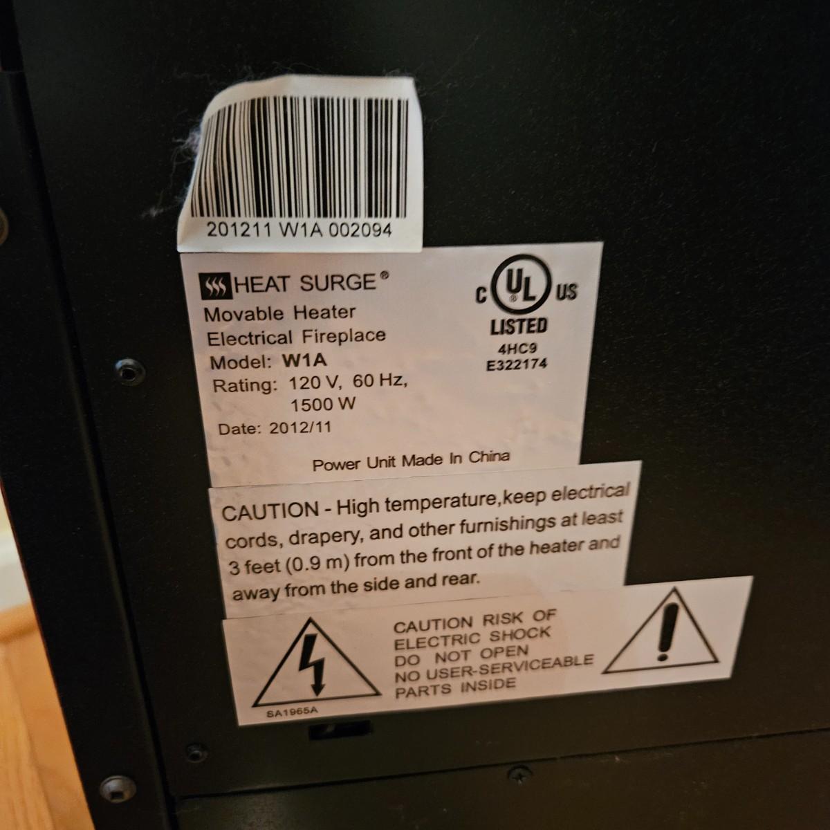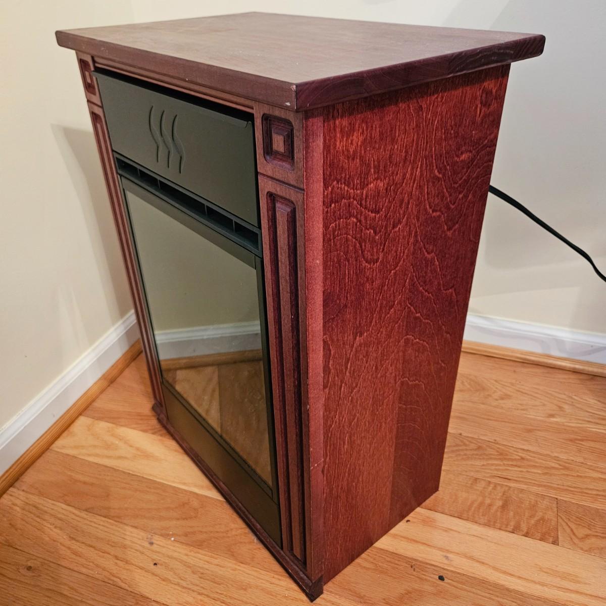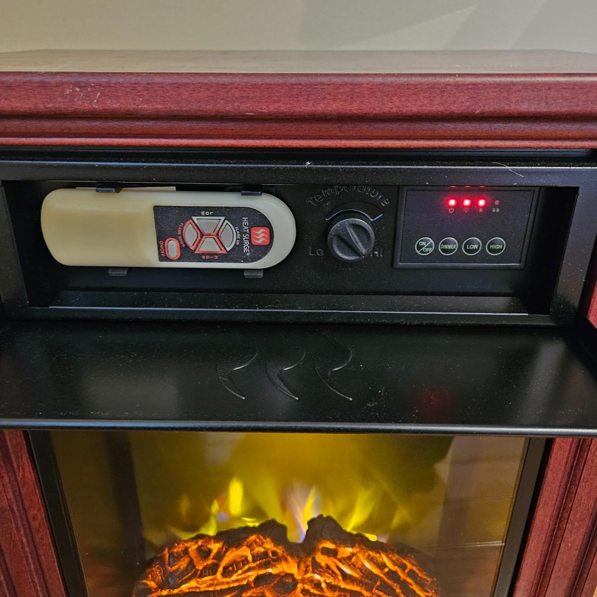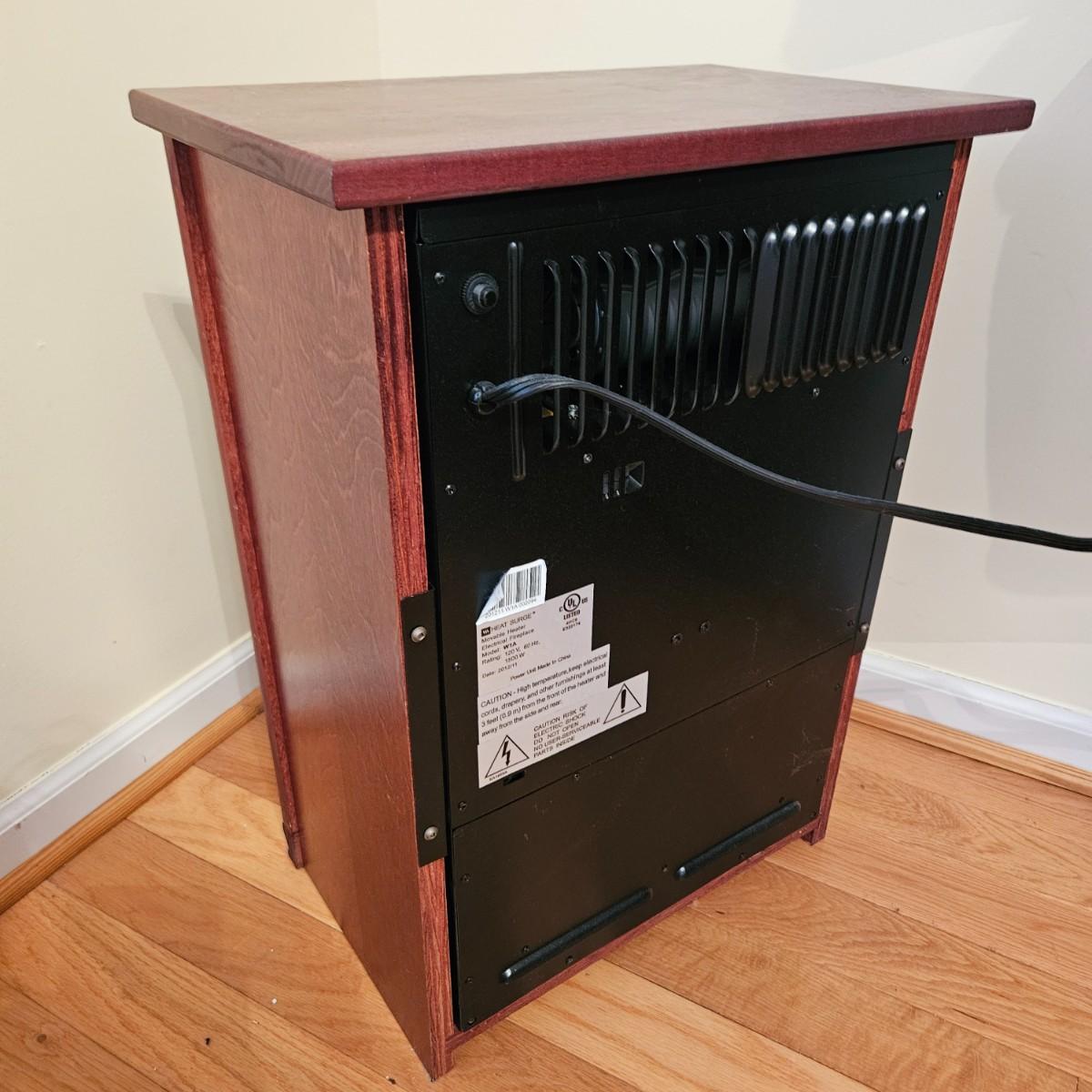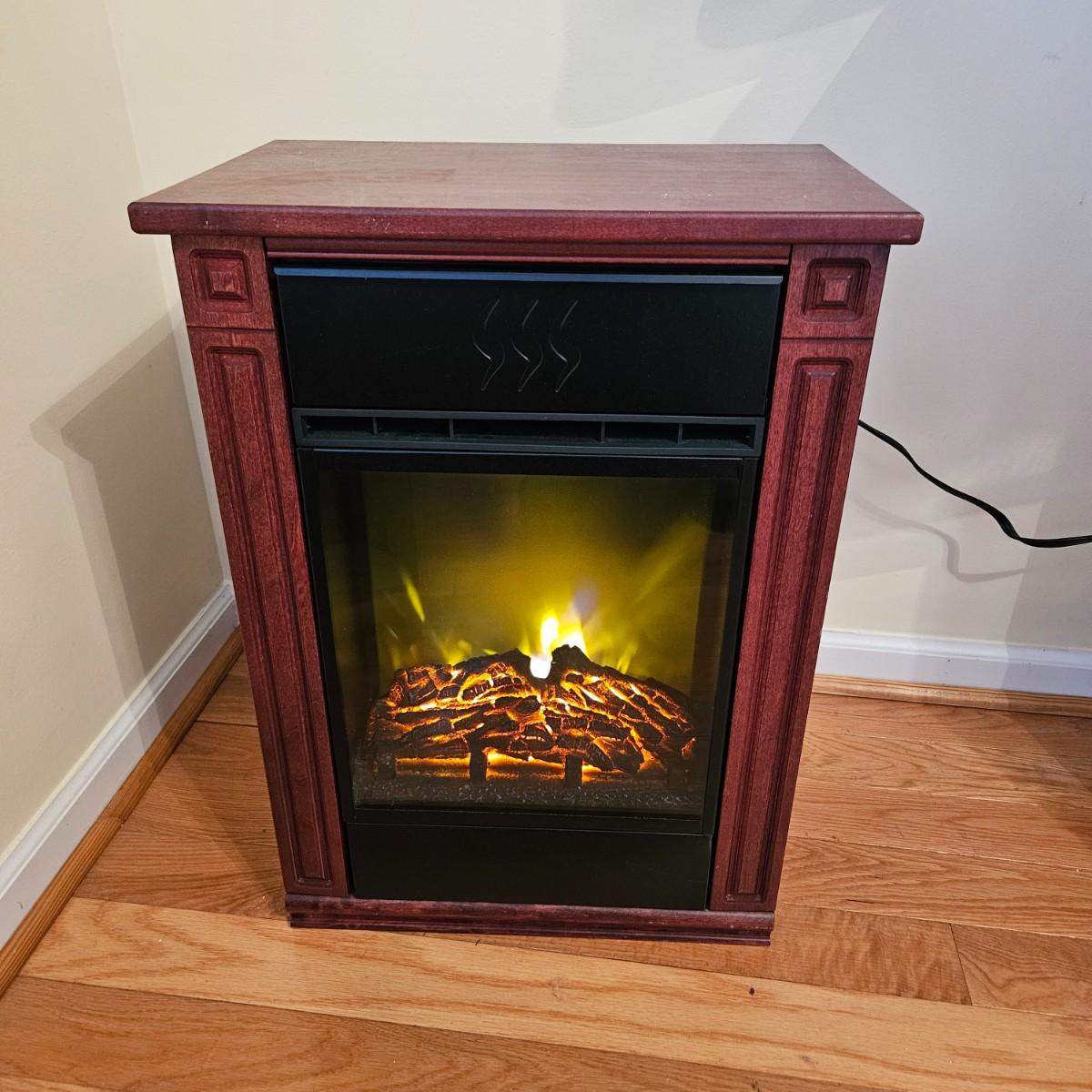 A smaller HeatSurge electric heater/fireplace that powered on when plugged in. This unit comes with a remote control and measures approximately 18" x 11.5" x 25"H. Local pickup only