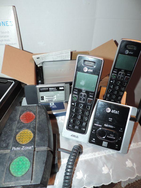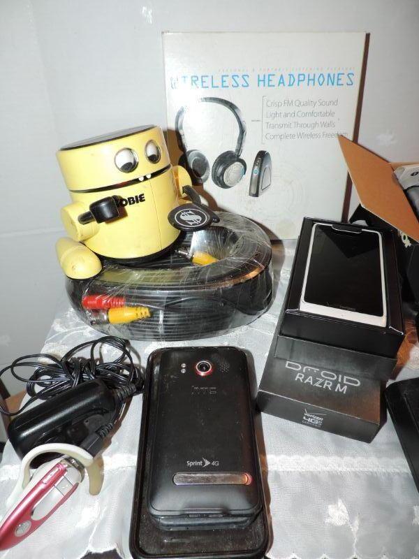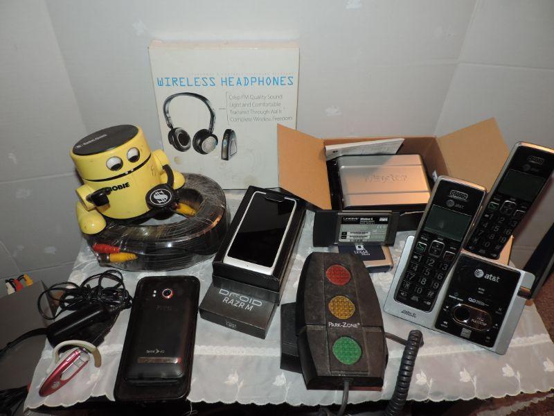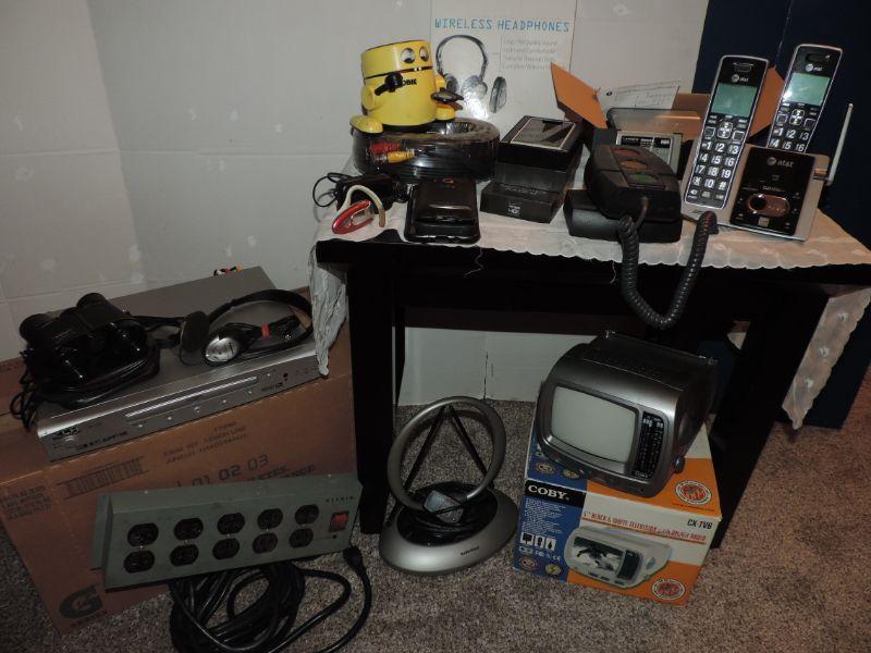 DVD PLAYER, CORDLESS HEADPHONES, RED/YELLOW/GREEN CAR STOPPER, ROBOT COIN KEEPER, CORDLESS PHONES, ANTENNAS, MOTOROLSA BLUETOOTH, VCR & AND DISNEY TAPES AND MUCH MORE