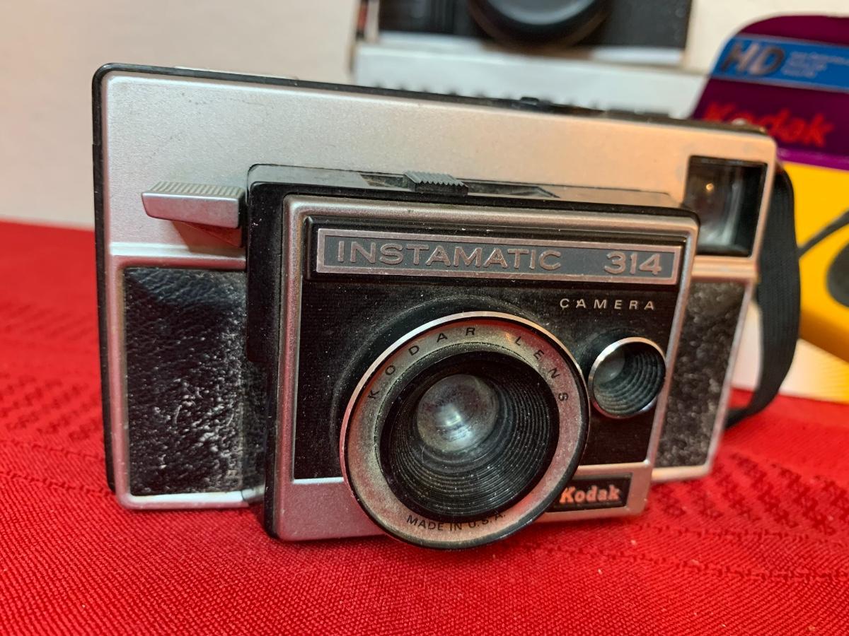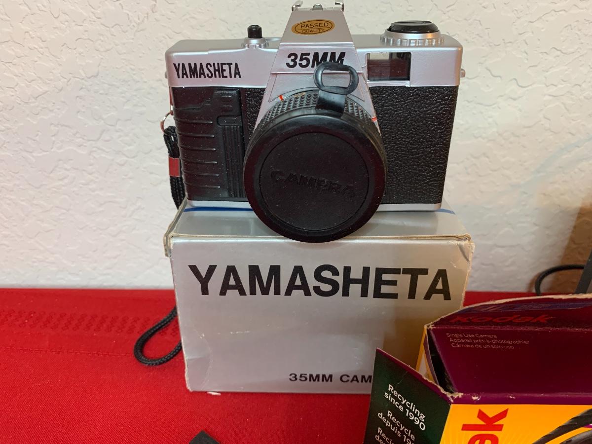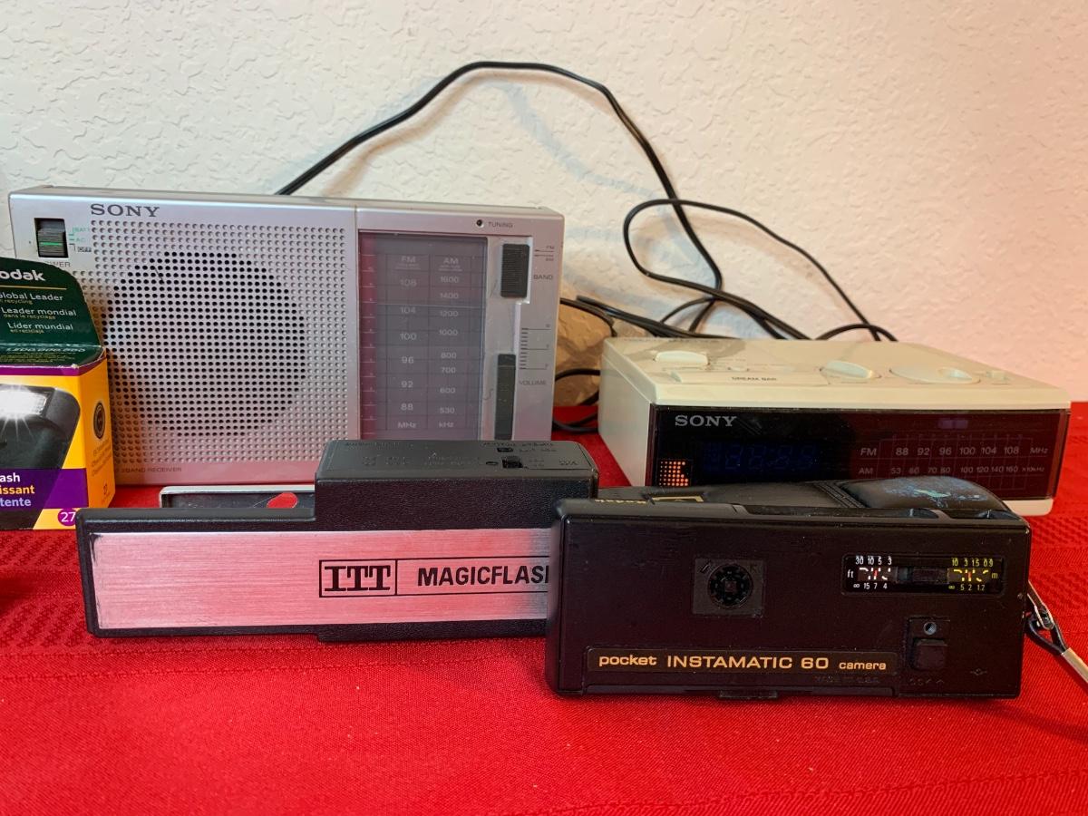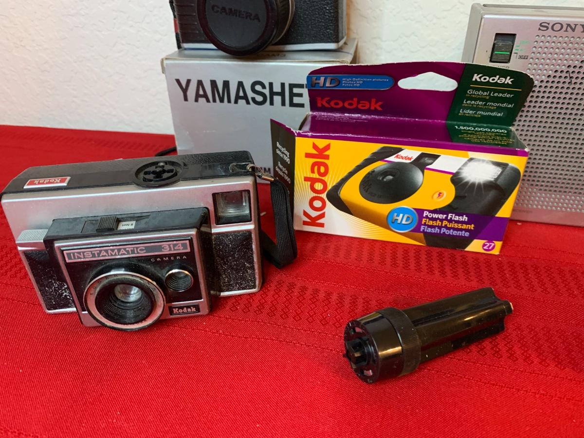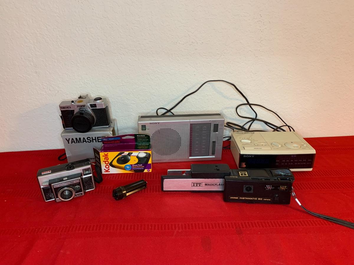 Lot includes Kodak Instamatic 314 camera, Kodak disposable, Yamasheta 35mm camera, Sony radio, Sony dream machine, Kodak Instamatic 60 camera.