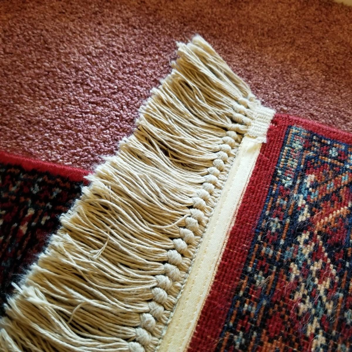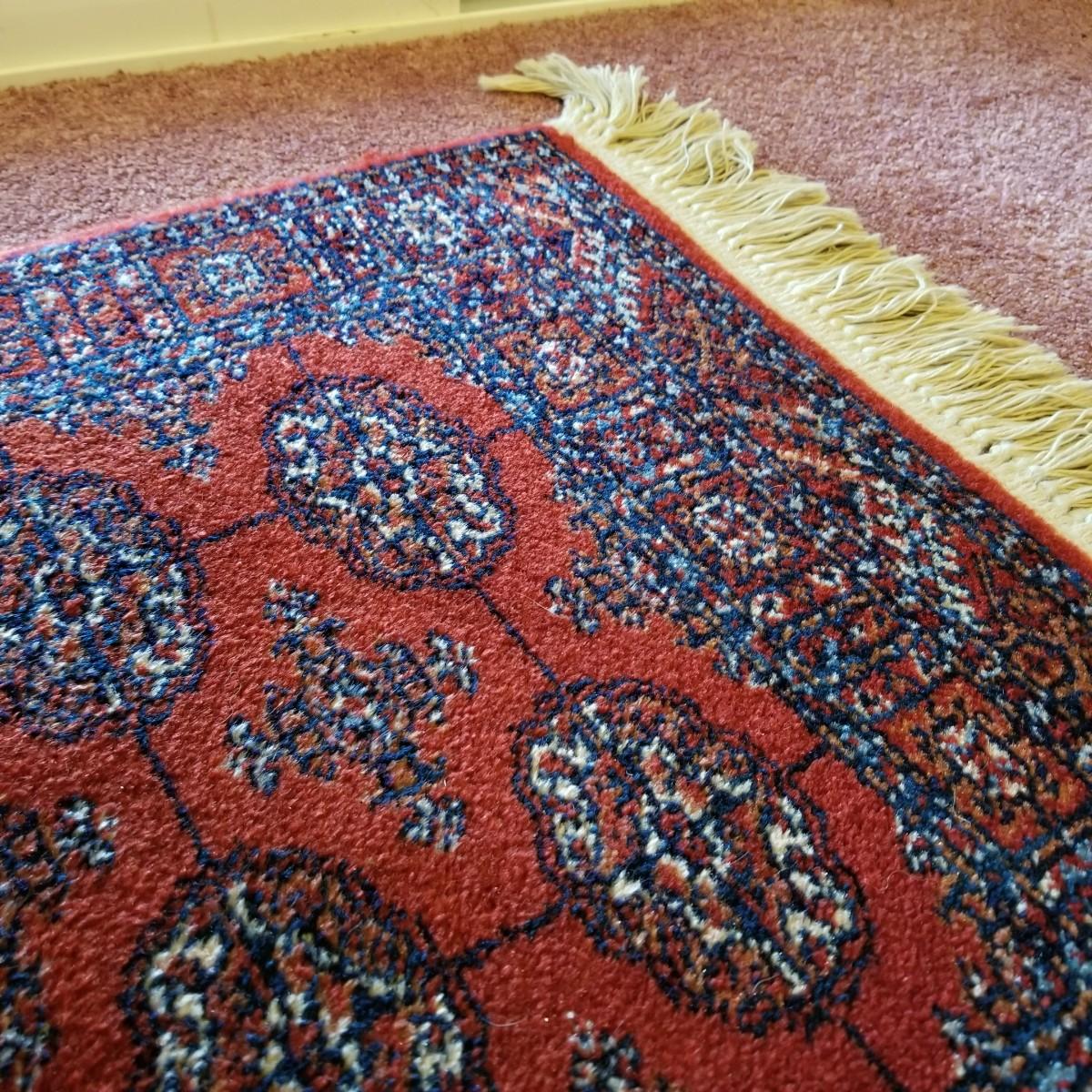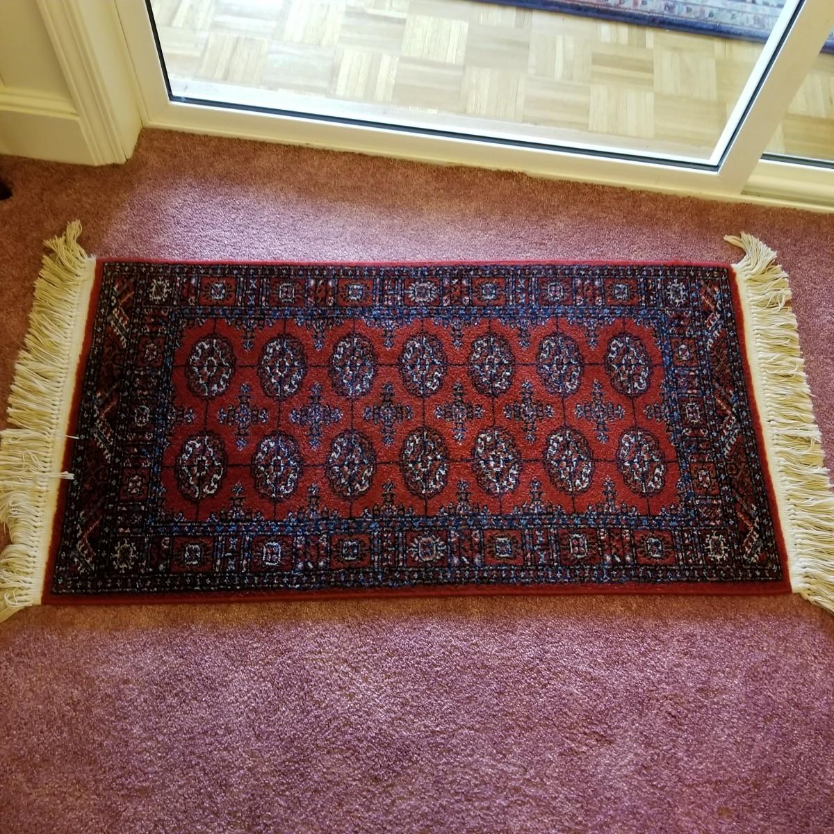 Deep red hues give this rug a regal look. Small medallions and banded borders with ivory colored fringe on ends. 56" x 26". Rug has one small spot on back, does not show through to front. See photos for details.