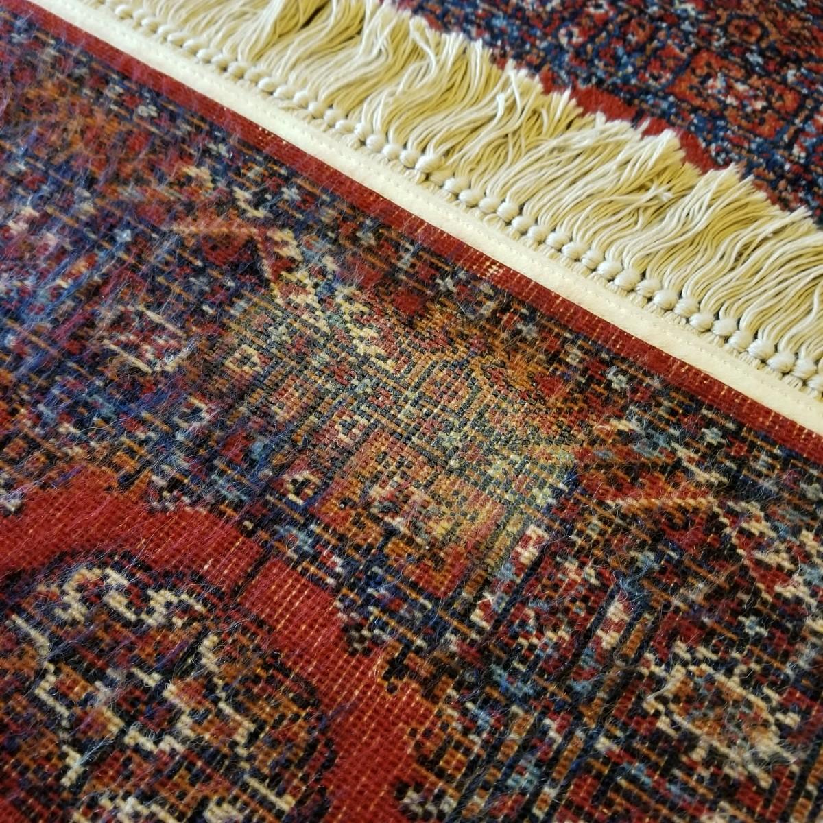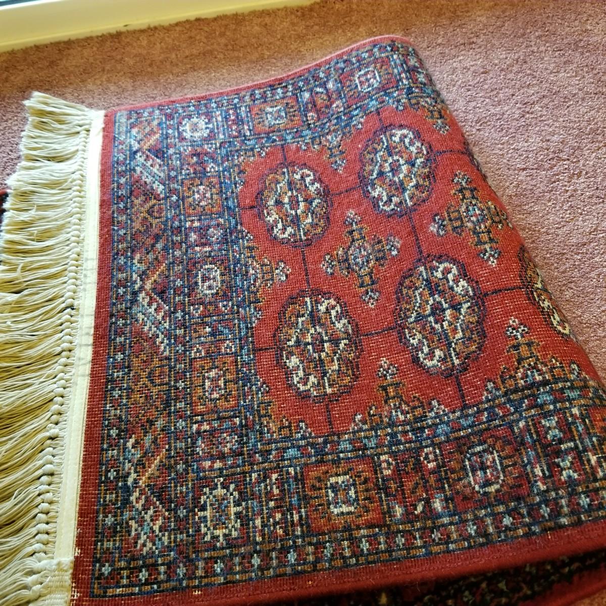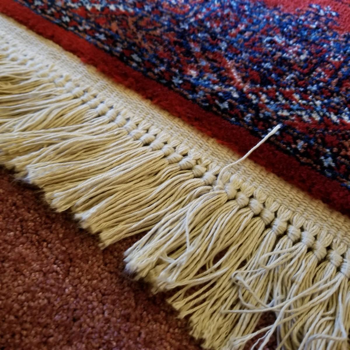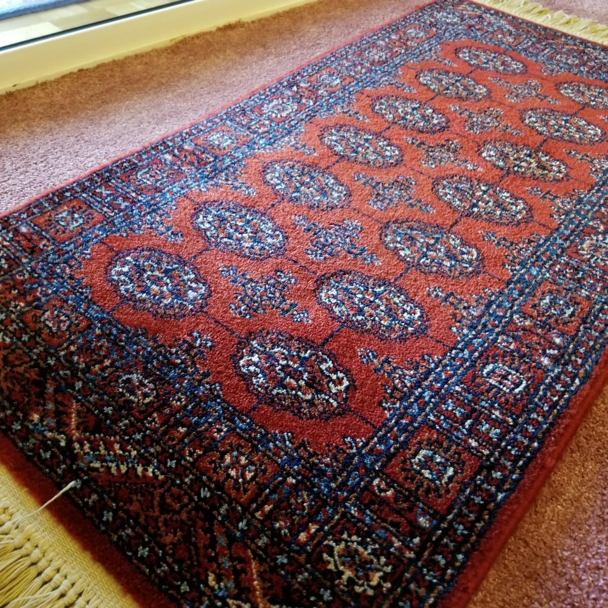 Deep red hues give this rug a regal look. Small medallions and banded borders with ivory colored fringe on ends. 56" x 26". Rug has one small spot on back, does not show through to front. See photos for details.