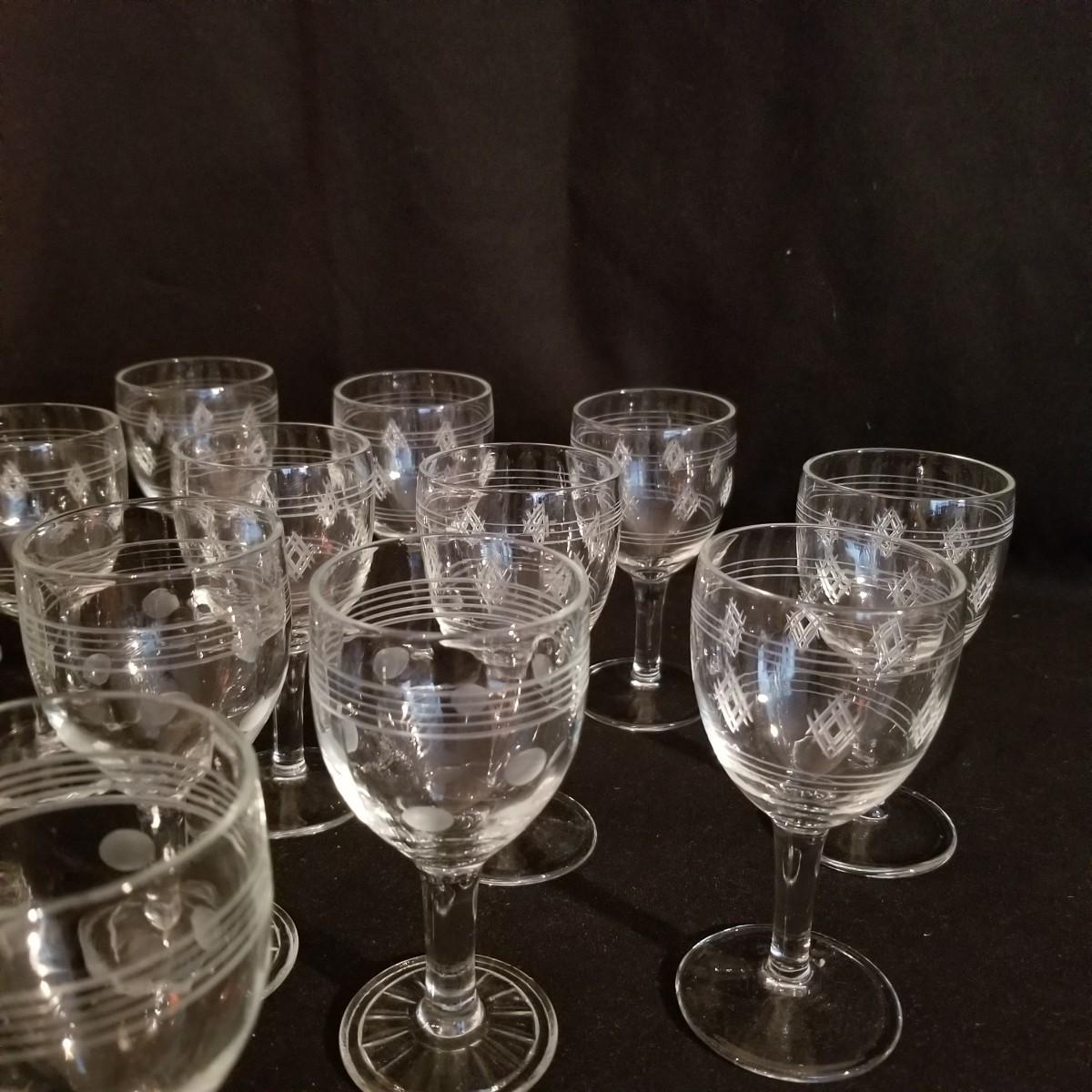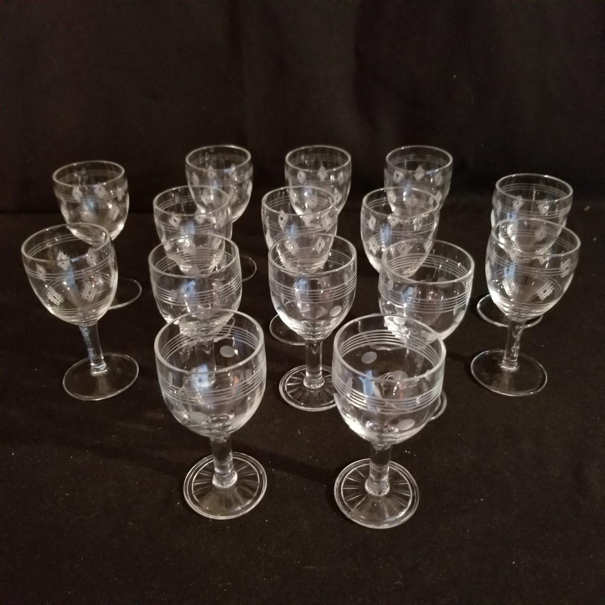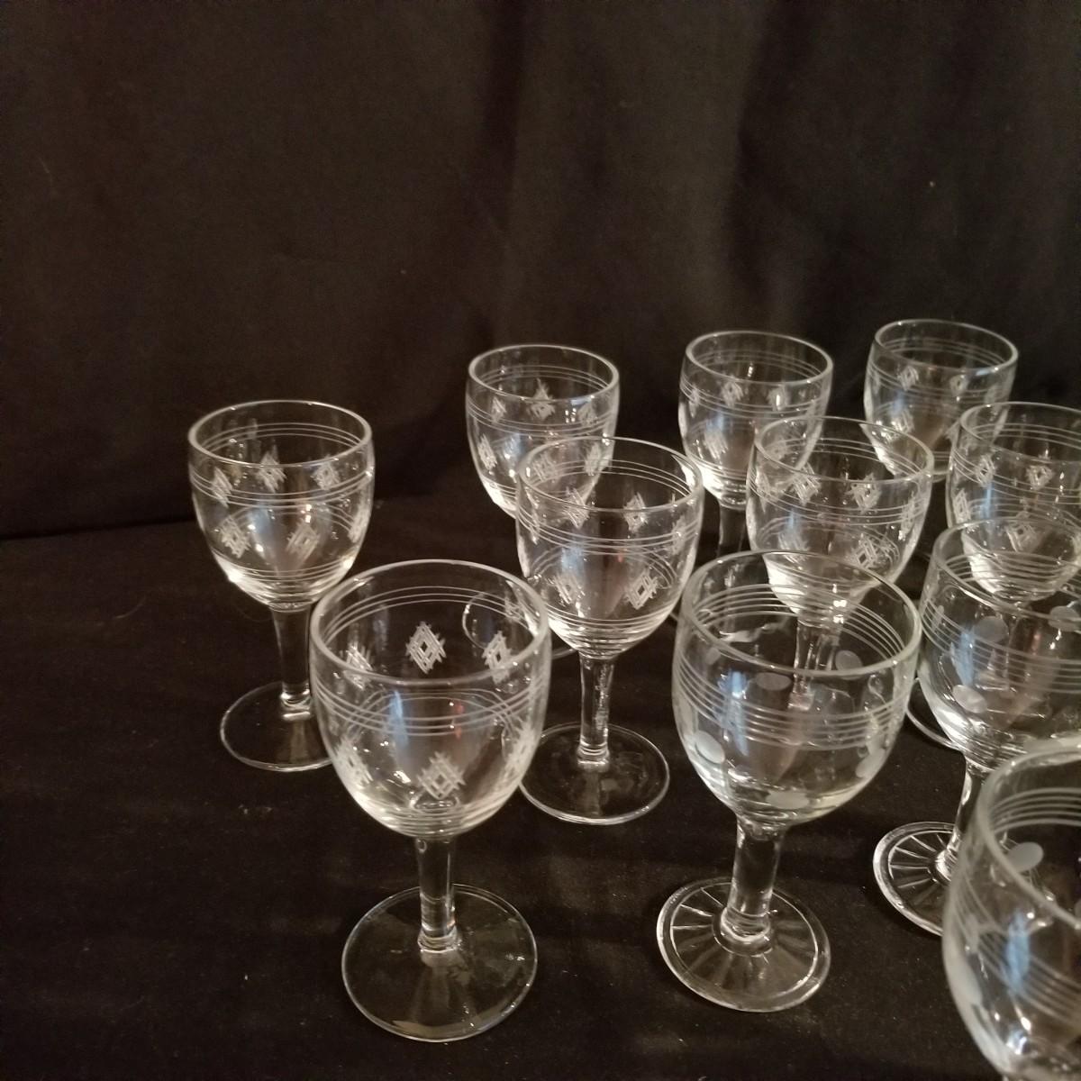 Fifteen small glasses with etched designs. Pressed glass with two different patterns. Five have a polka dot pattern; ten have a diamond pattern. See photos for detail. Glasses are in good condition and measure 4.5" h x 2" d.  Shipping available.