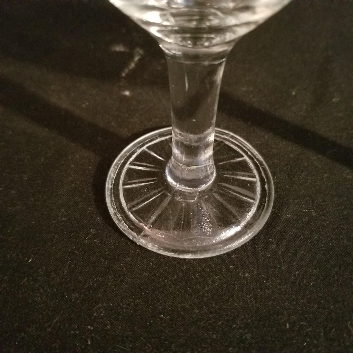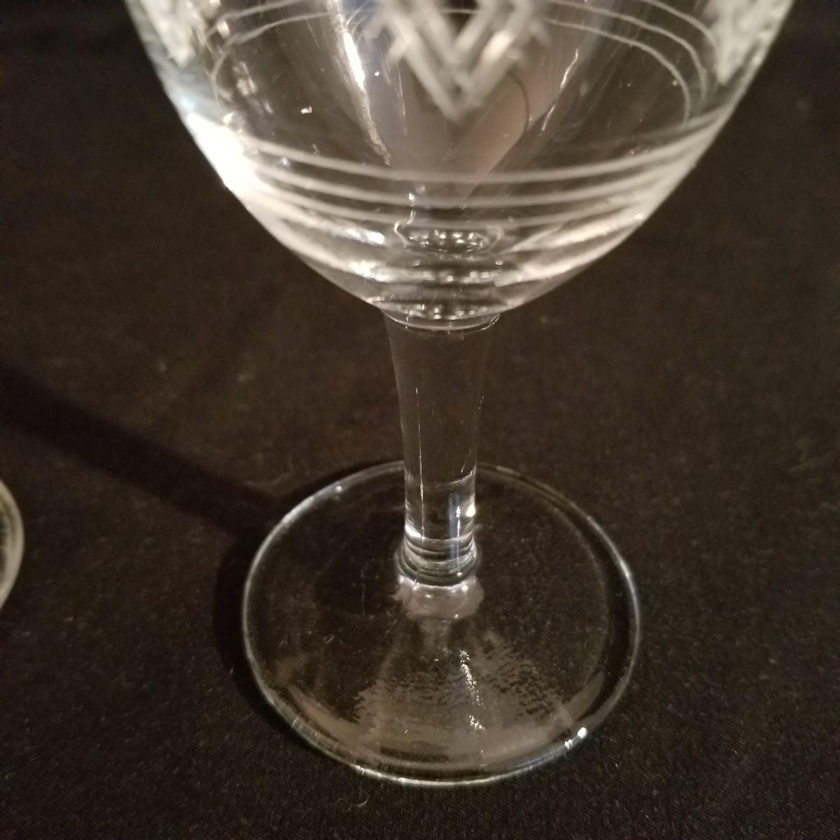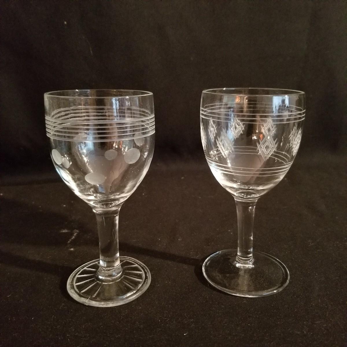 Fifteen small glasses with etched designs. Pressed glass with two different patterns. Five have a polka dot pattern; ten have a diamond pattern. See photos for detail. Glasses are in good condition and measure 4.5" h x 2" d.  Shipping available.
