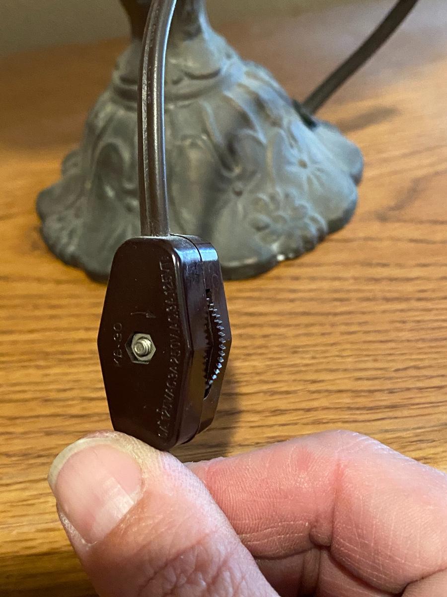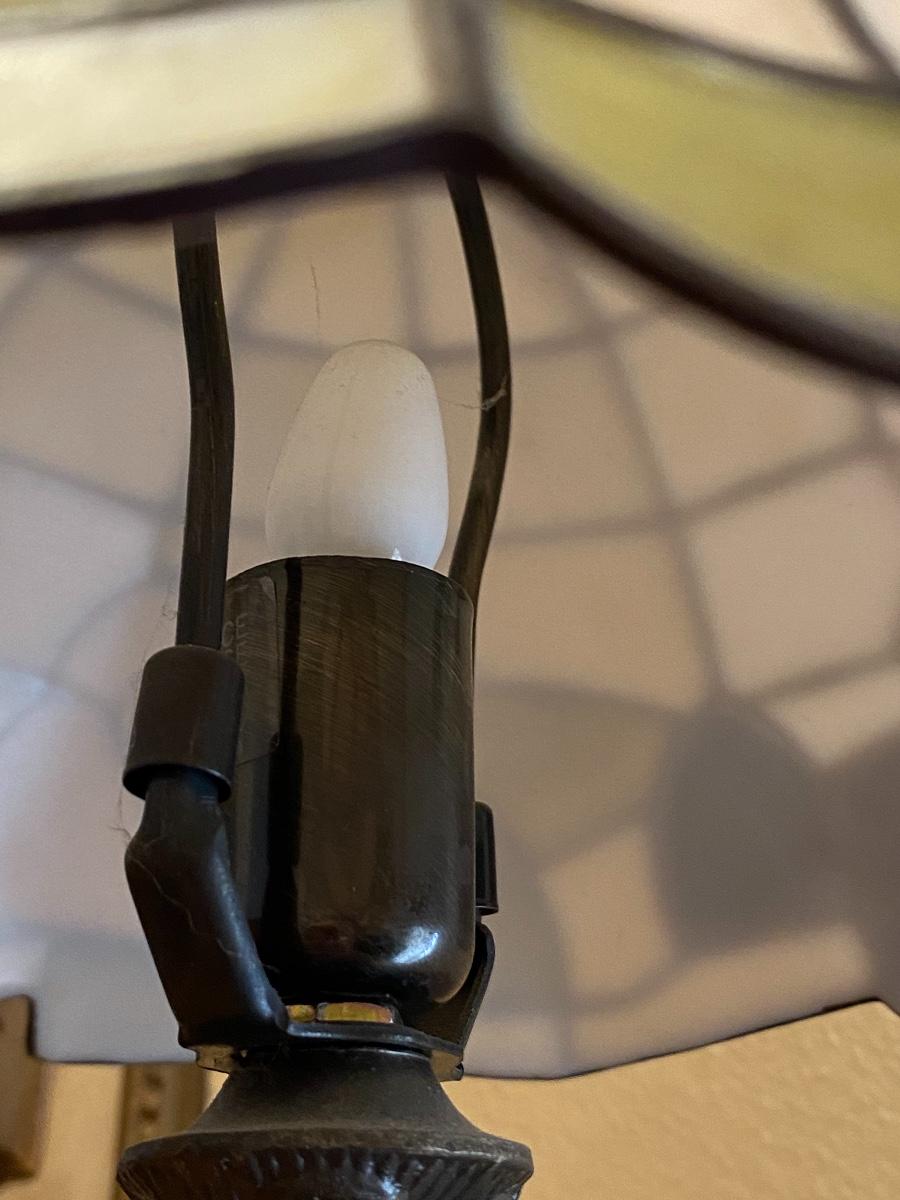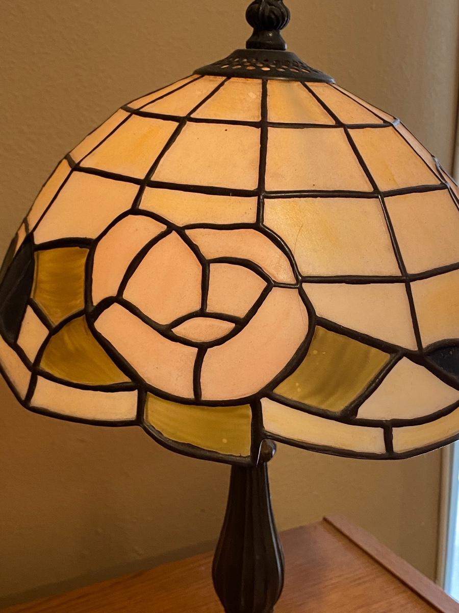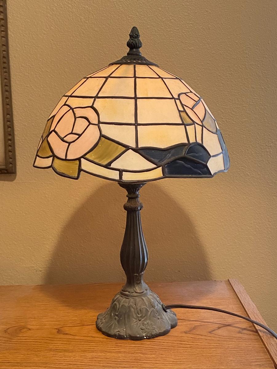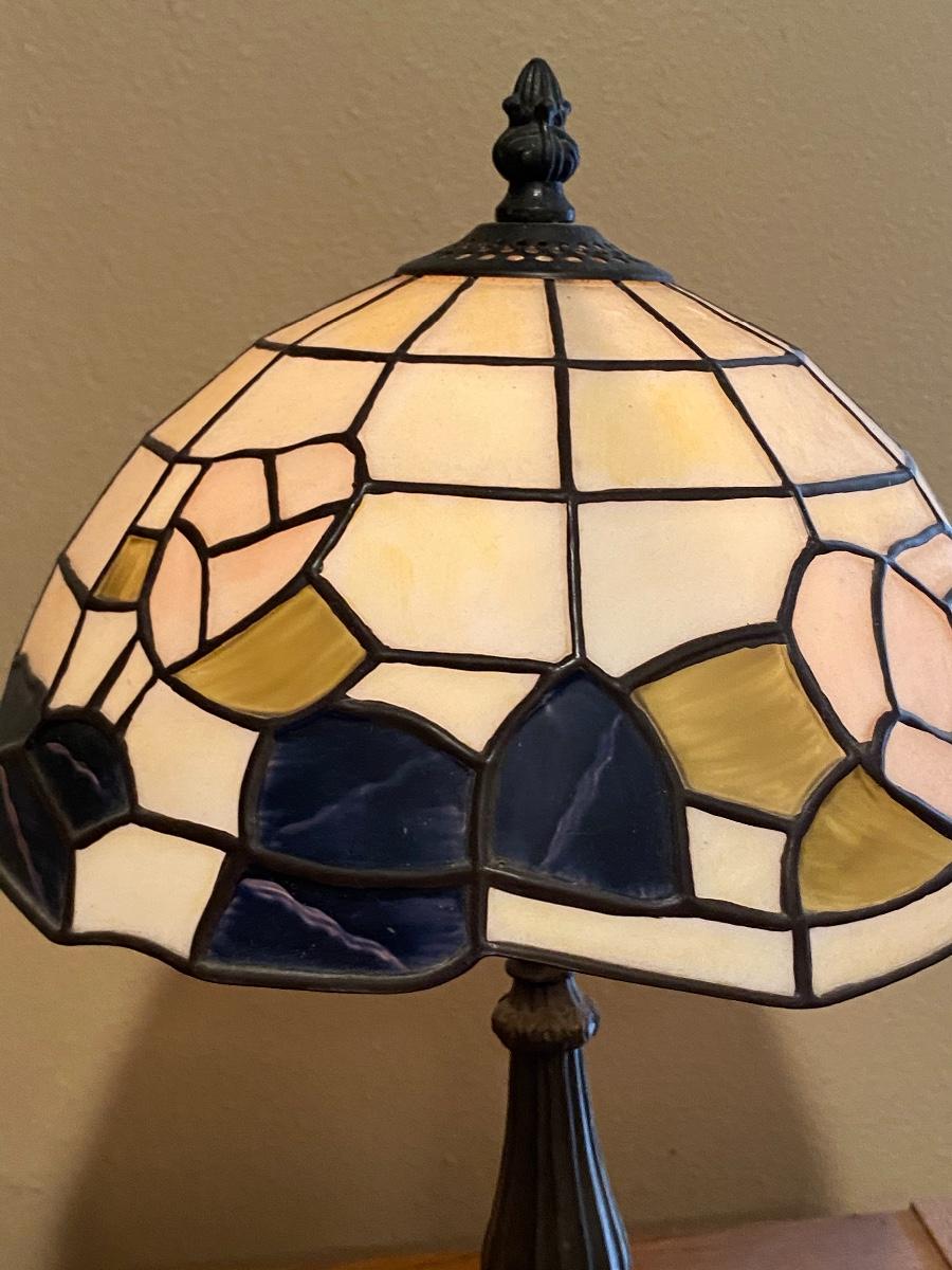 Small faux stained glass lamp. Shade is made of plastic or resin not glass. Small bed side or desk lamp size. Works.
