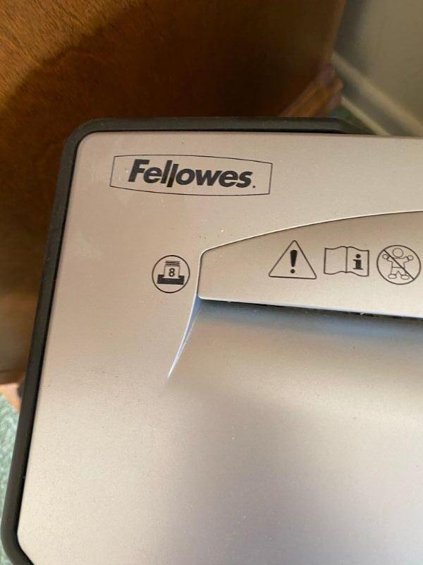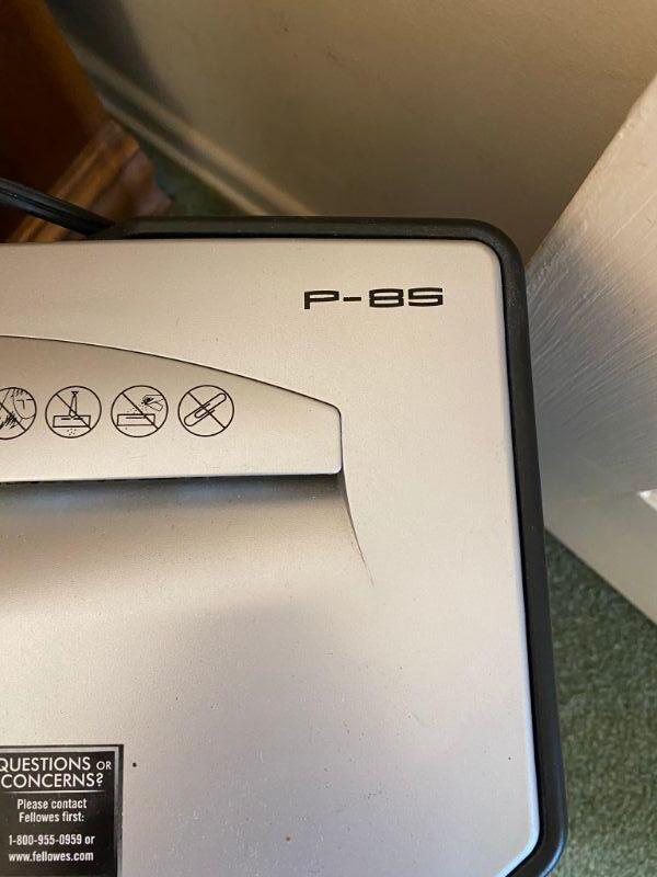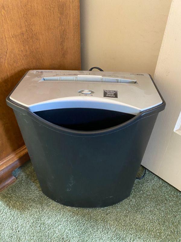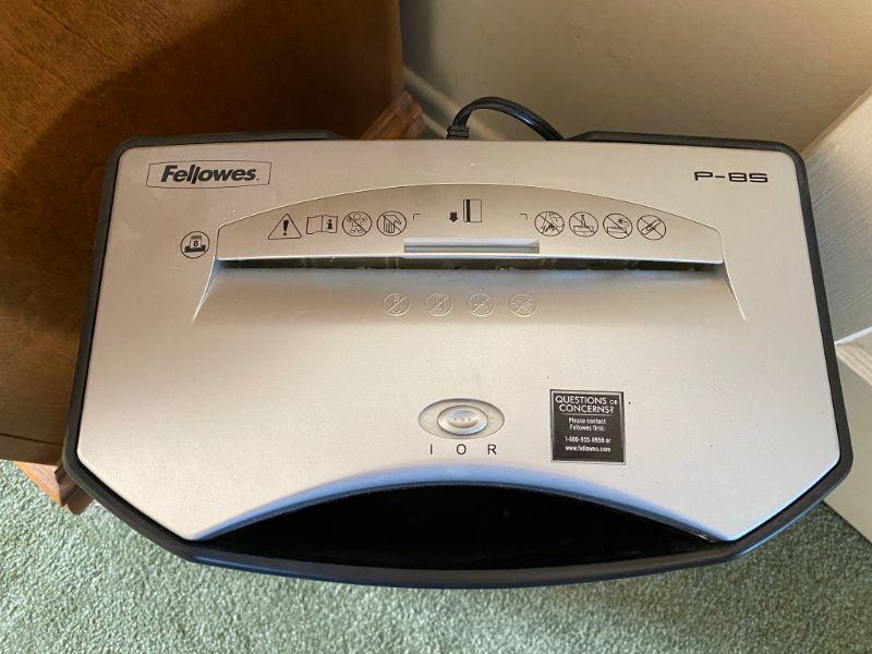 Small Fellowes p-85 paper shredder with waste basket. Plugged in and it works.