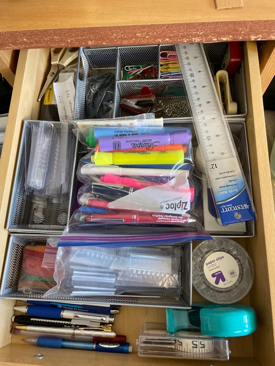Includes binders, organizers, waste basket and cabinet is full of office supplies