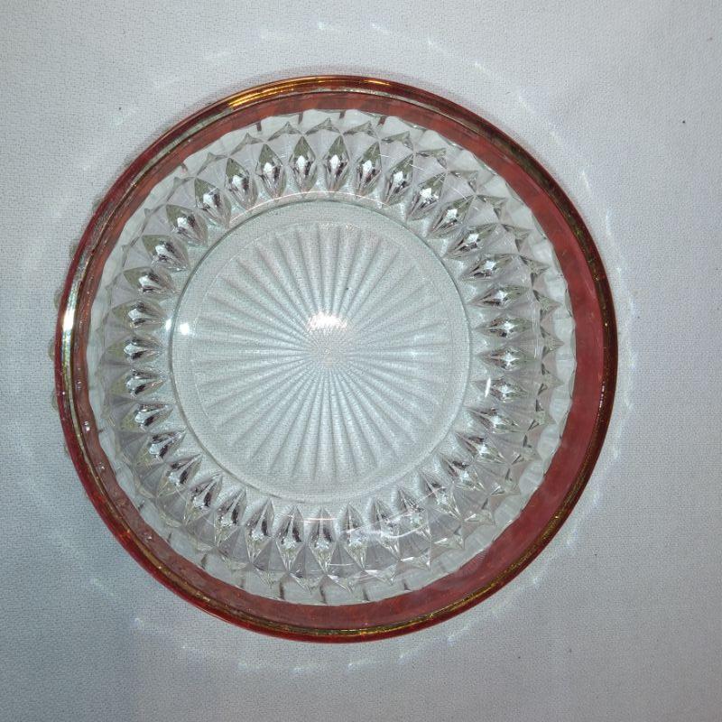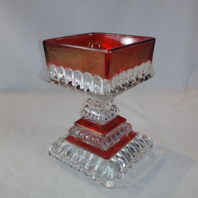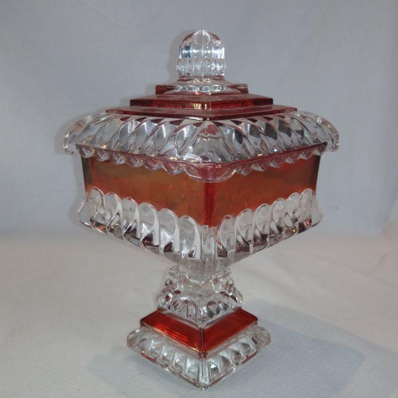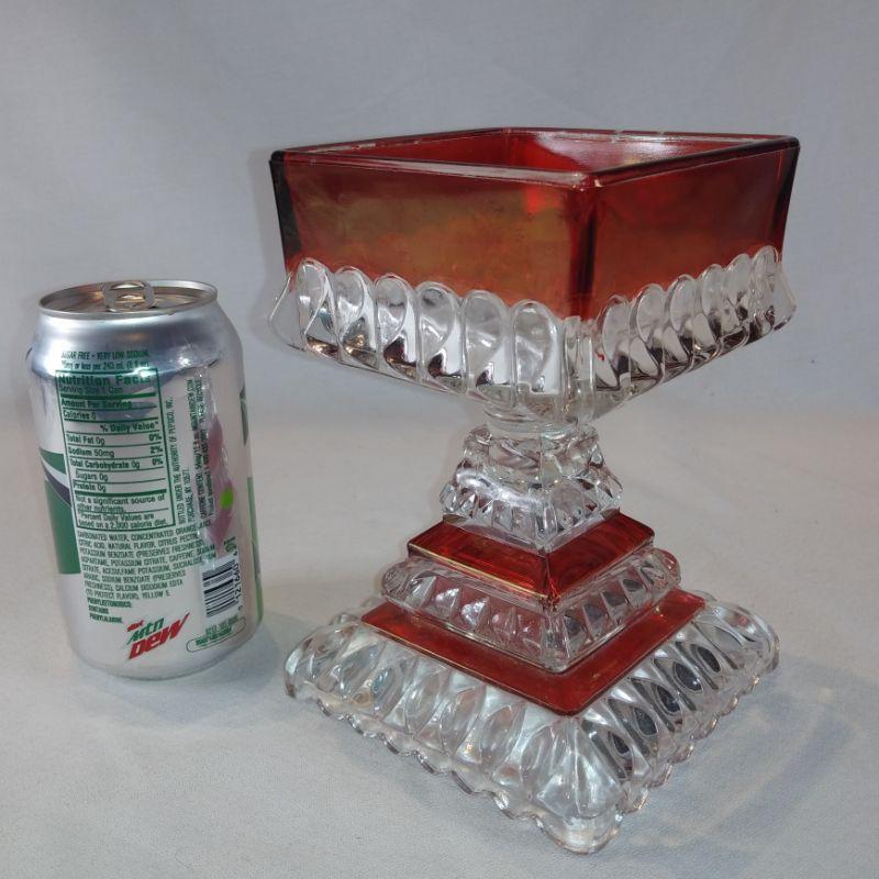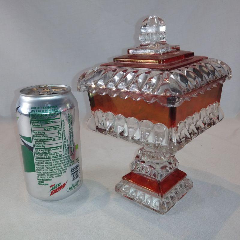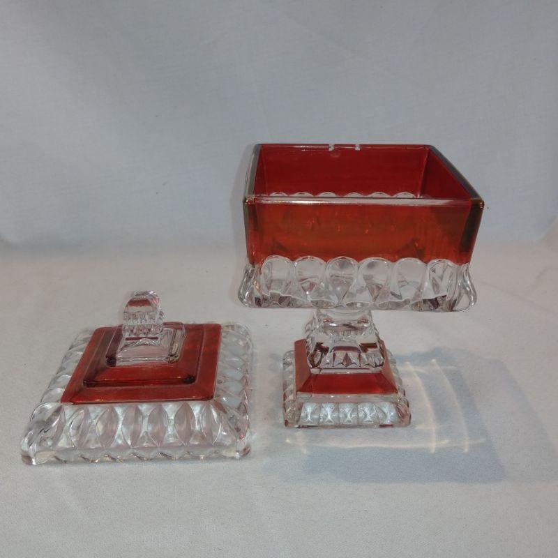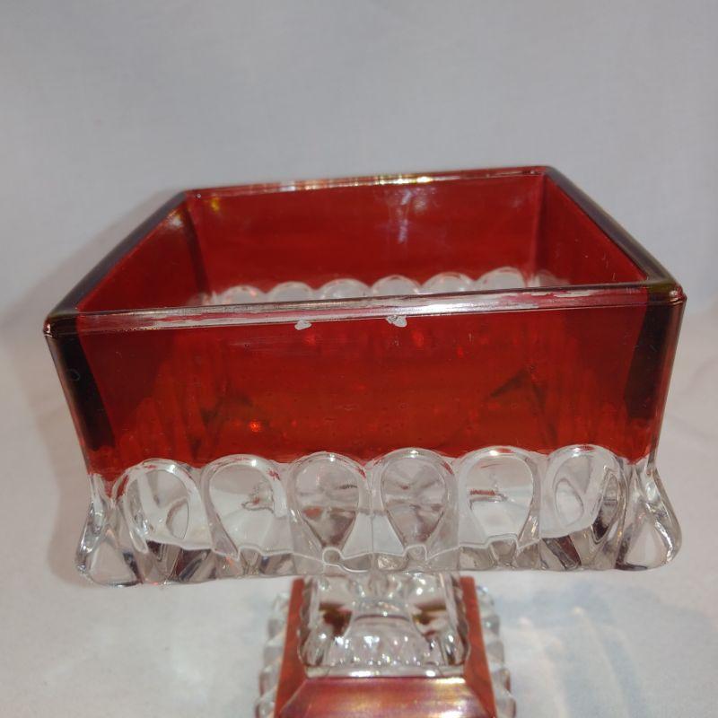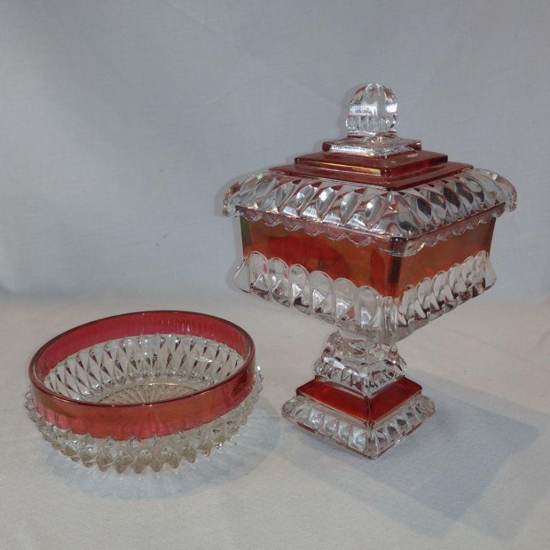 This is a nice pairing of vintage, flashed ruby glass items. The small "Wedding Compote" shows slight wear on the flashing and has 2 very small chips on one side of the edge of the dish from removing and putting back the lid so often. Not visible with lid on. The lid sits inside the base to create the "wedding compote." It is 7-inches tall. The round dish shows no wear and appears unused. It is 5-inches in diameter.
