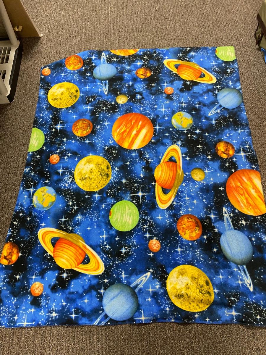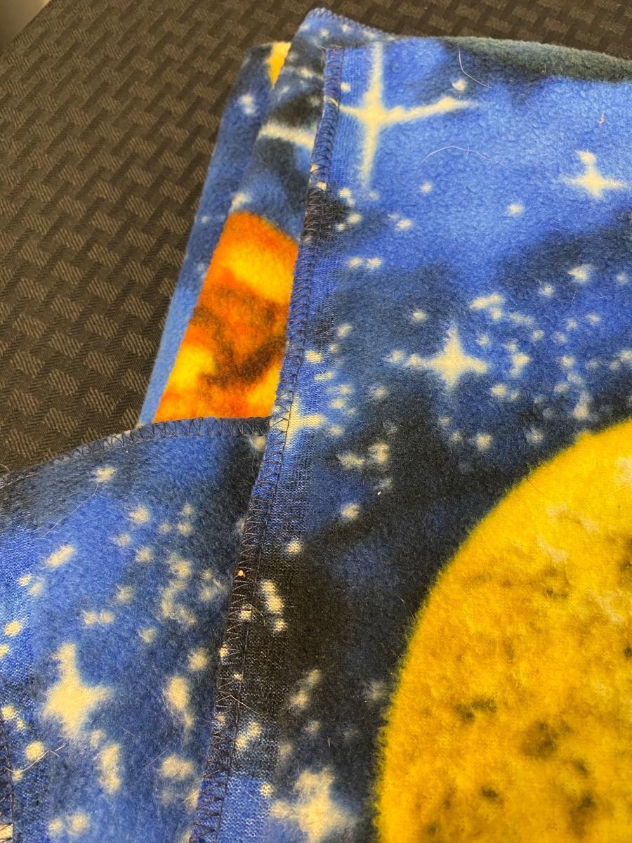 Small space themed fleece blanket. Perfect kid size or lap blanket. About 4x6 size.