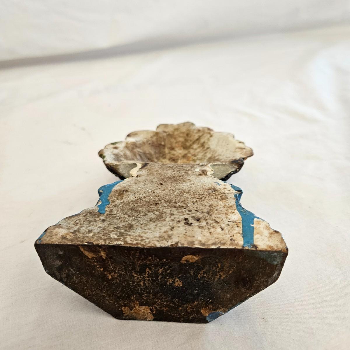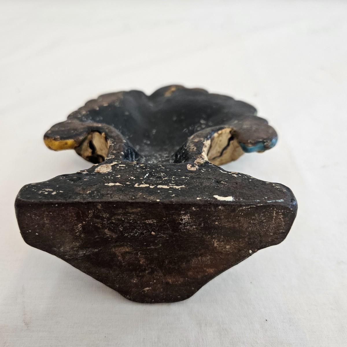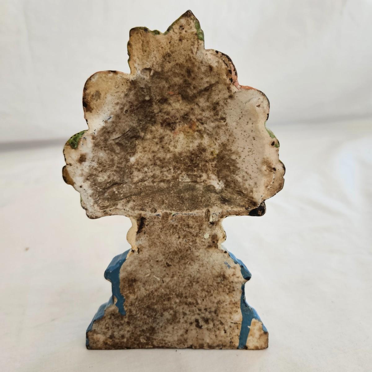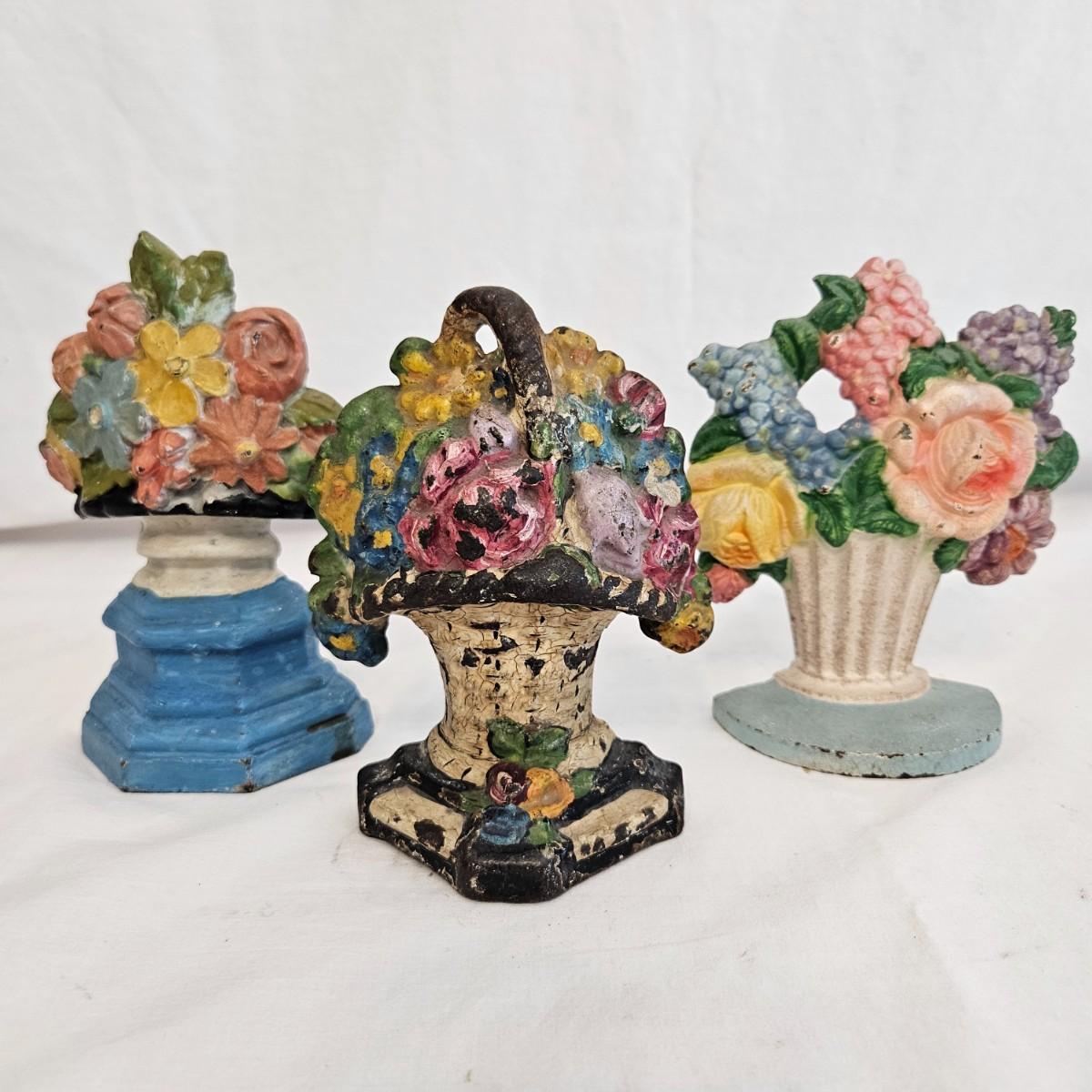 A trio of small vintage cast iron door stops made of cast iron and painted. The stop with the blue base measures approximately 3.5" x 1.5" x 6"H. Shipping available