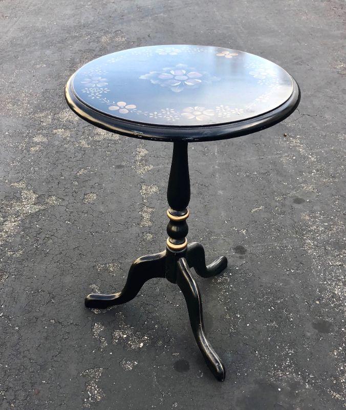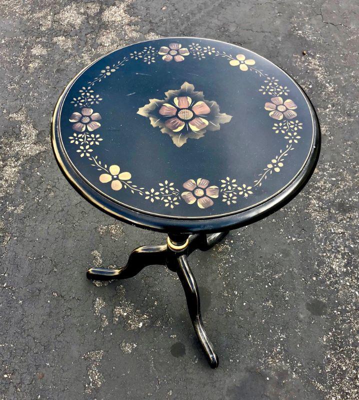 Cute black round side table. Has a floral painted design to the top. Some signs of use to the finish.