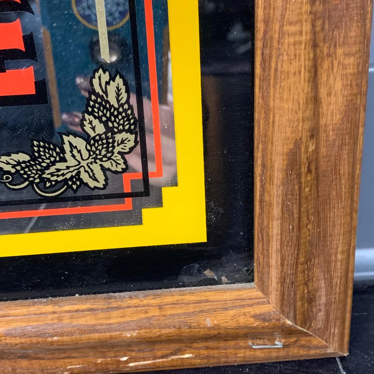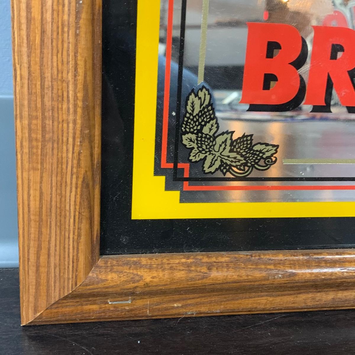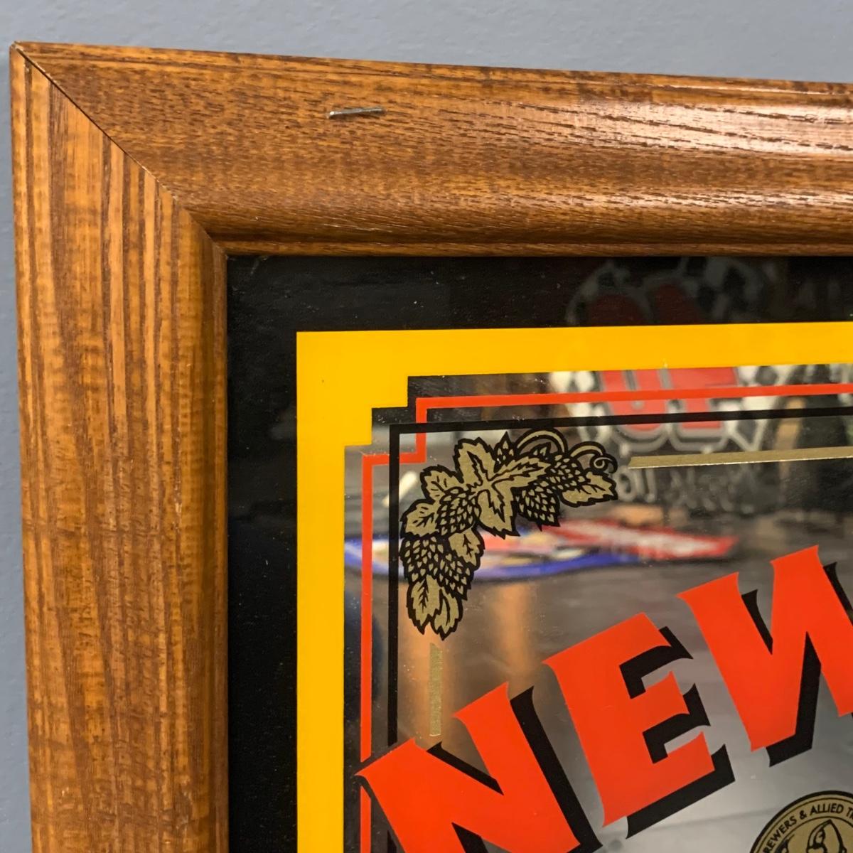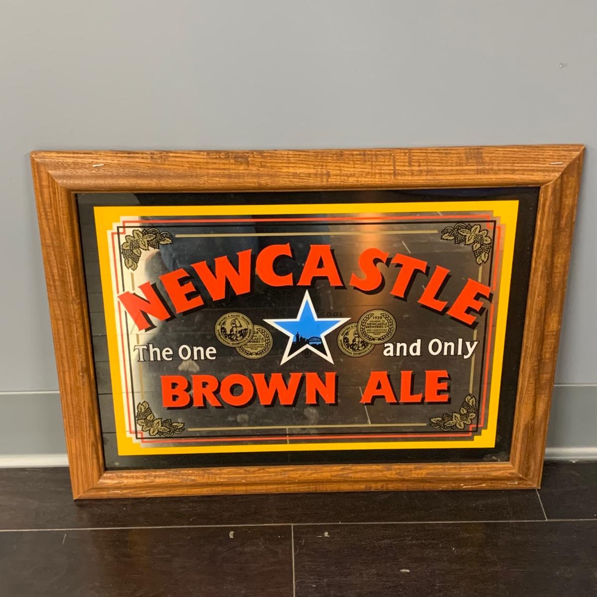 This small Newcastle Brown Ale mirror sign comes in a nice wood frame that measures 20.75” x 15.75”. There are some staples stuck in the frame that could likely be removed with the right tool. There is a small scratch on one corner of the frame. The mirror has some marks/blemishes that feel like they can be cleaned. There is a small area on the bottom right corner of the mirror that is cracked. There is hardware on the back of the frame for hanging on the wall. Shipping available. Shipping art can be costly, we suggest calling our local UPS with dimensions and getting an estimate before bidding (828) 252-6930.