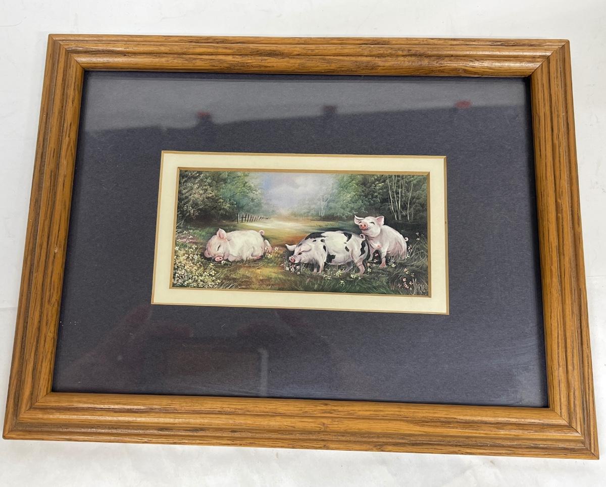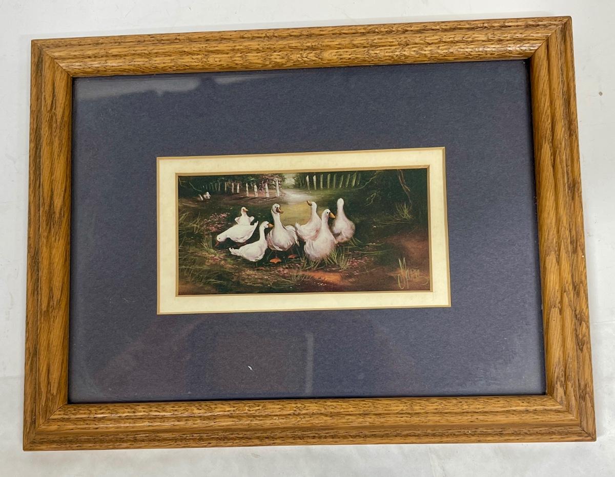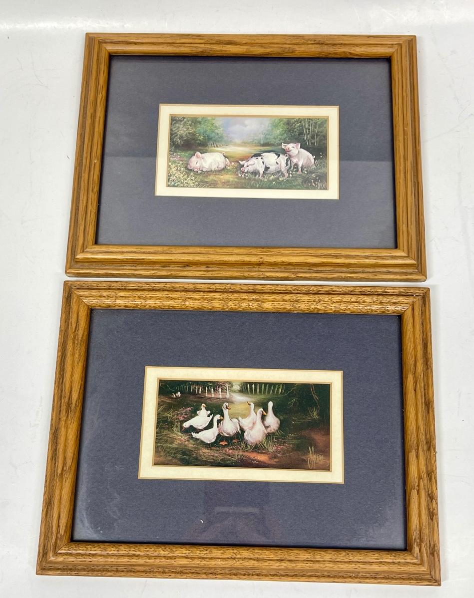 Framed and matted images of pigs and geese. In good condition. Both are approx. 7" x 10".